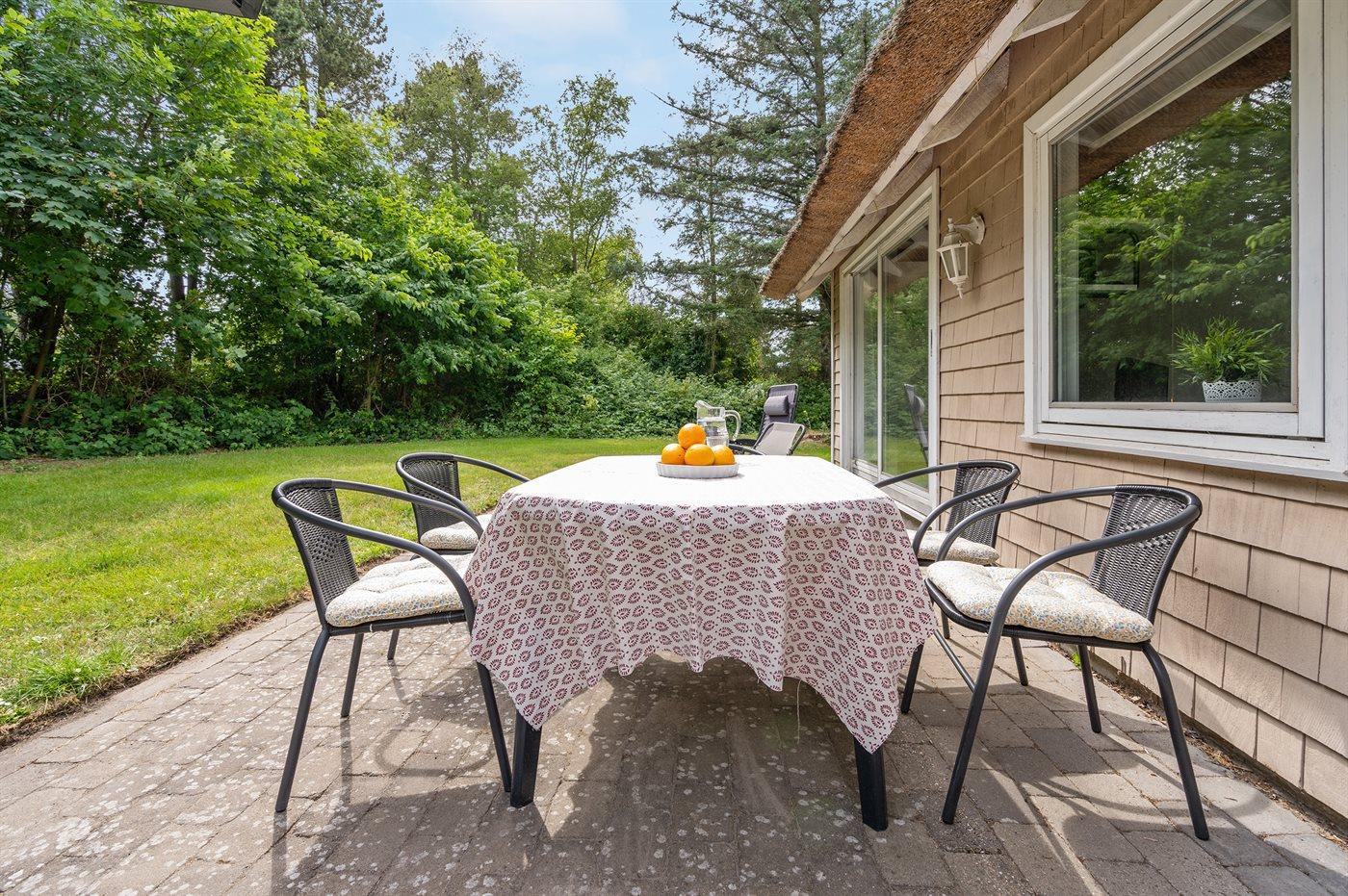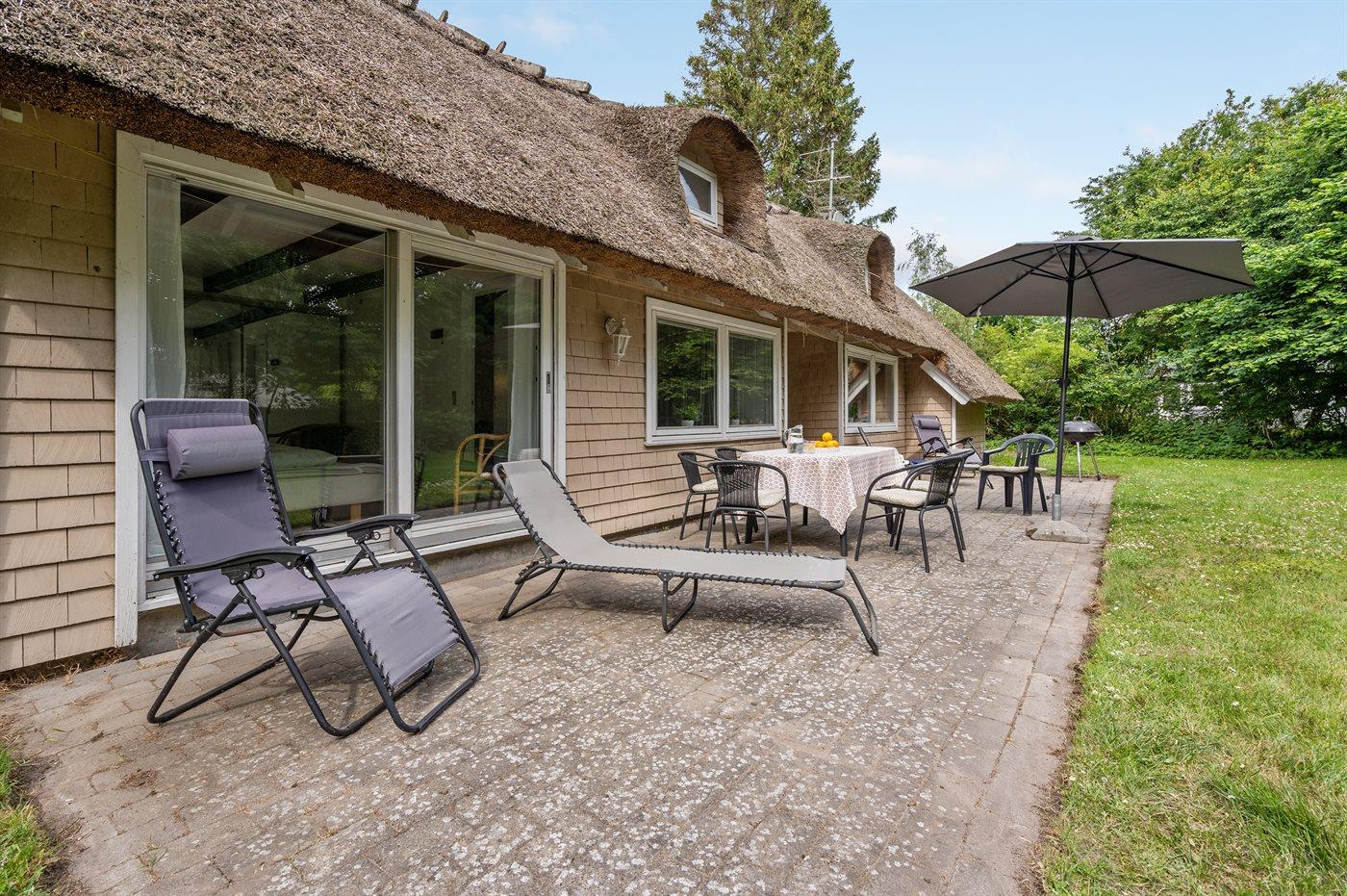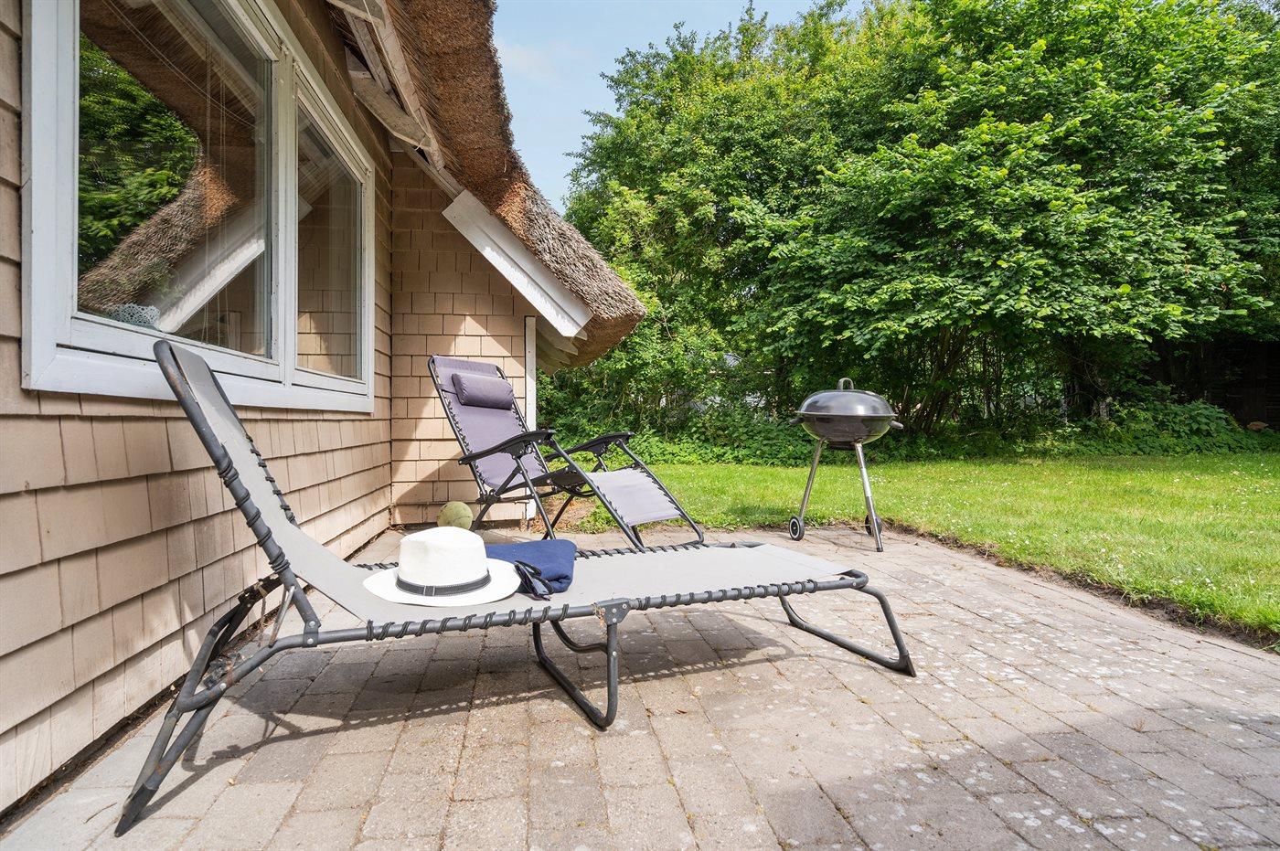 Ferieboligen er beliggende på en 1150 m² stor naturgrund. Der er 750 m til havet. Nærmeste forretning er beliggende i en afstand af 1000 m. Der er en golfbane i en afstand af 850 m. Til ferieboligen hører åbent terrasseareal. Grill til rådighed. Der er installeret stik til opladning af elbil. Type 2 stik. Parkering ved ferieboligen.