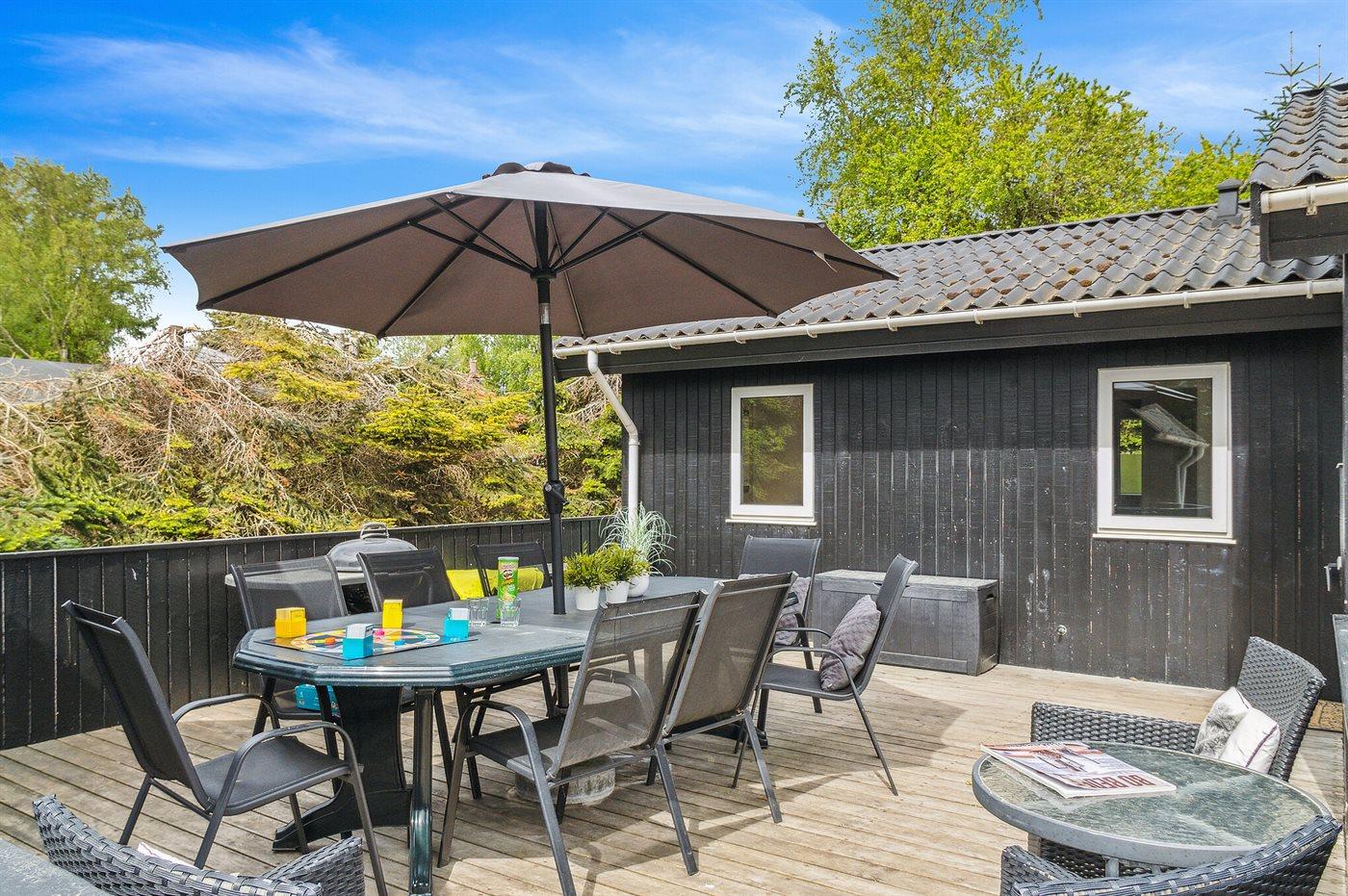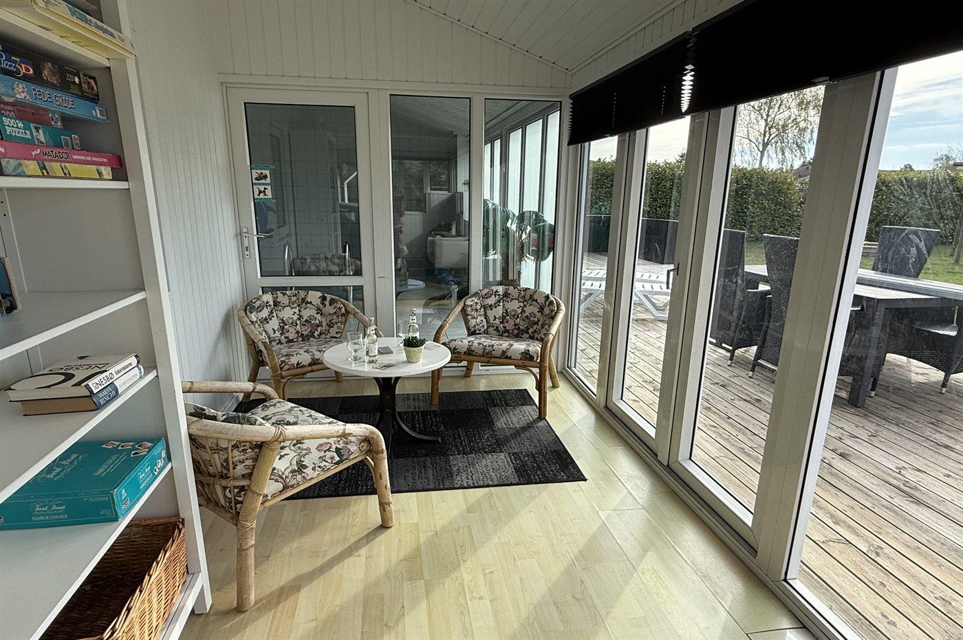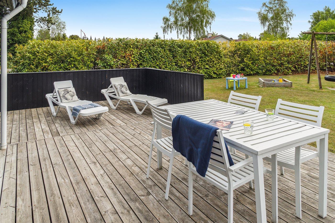 Fra hoveddøren er der direkte adgang til en skøn træterrasse, som har et aflukket område med låge, så der trygt kan holdes opsyn med de mindre børn, mens de leger på terrassen. I forlængelse af denne terrasse ligger også et anneks, som foruden at rumme 2 af husets 10 sovepladser også egner sig til en lille lur i ro og mag, hvis dette måtte ønskes.