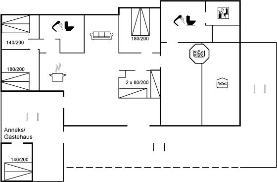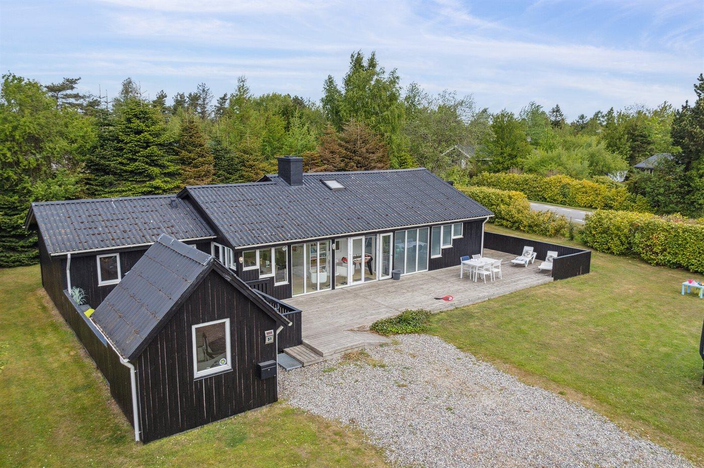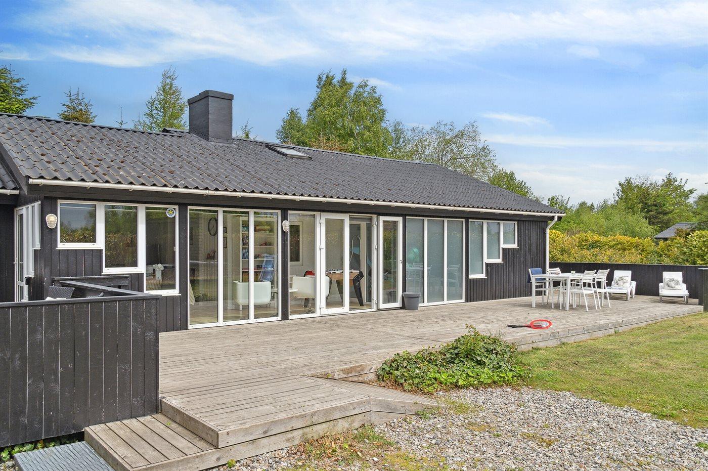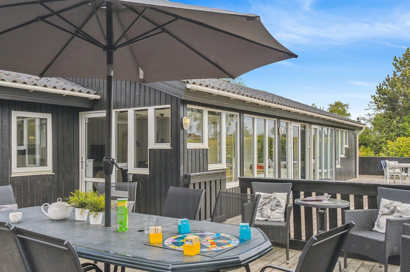 Fra hoveddøren er der direkte adgang til en skøn træterrasse, som har et aflukket område med låge, så der trygt kan holdes opsyn med de mindre børn, mens de leger på terrassen. I forlængelse af denne terrasse ligger også et anneks, som foruden at rumme 2 af husets 10 sovepladser også egner sig til en lille lur i ro og mag, hvis dette måtte ønskes.