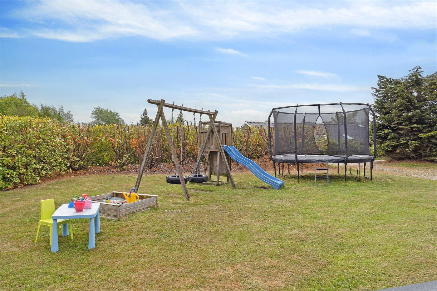Haven er godt omkranset af høje træer. På den store græsplæne findes gynger, sandkasse og rutsjebane samt en stor trampolin til glæde for børn og barnlige sjæle.