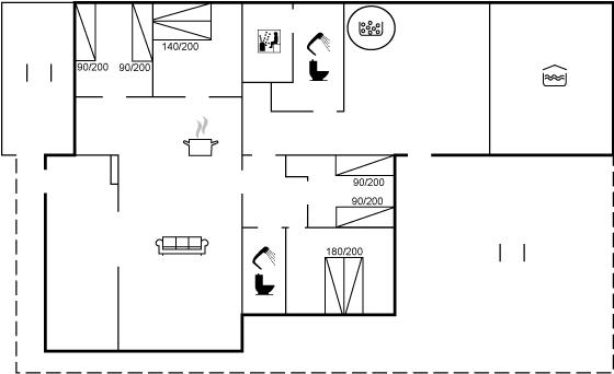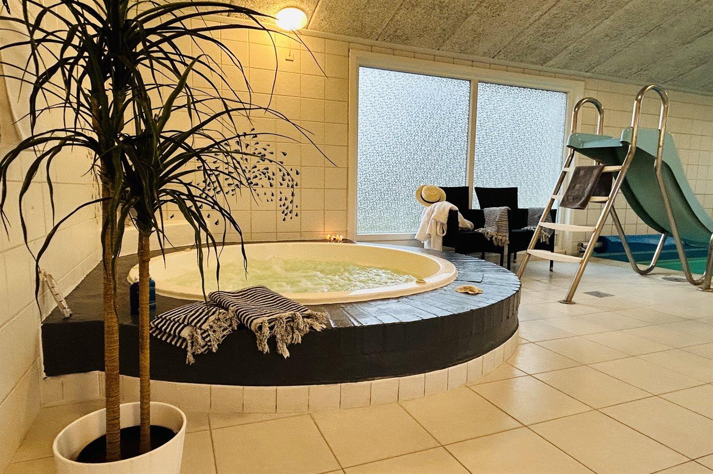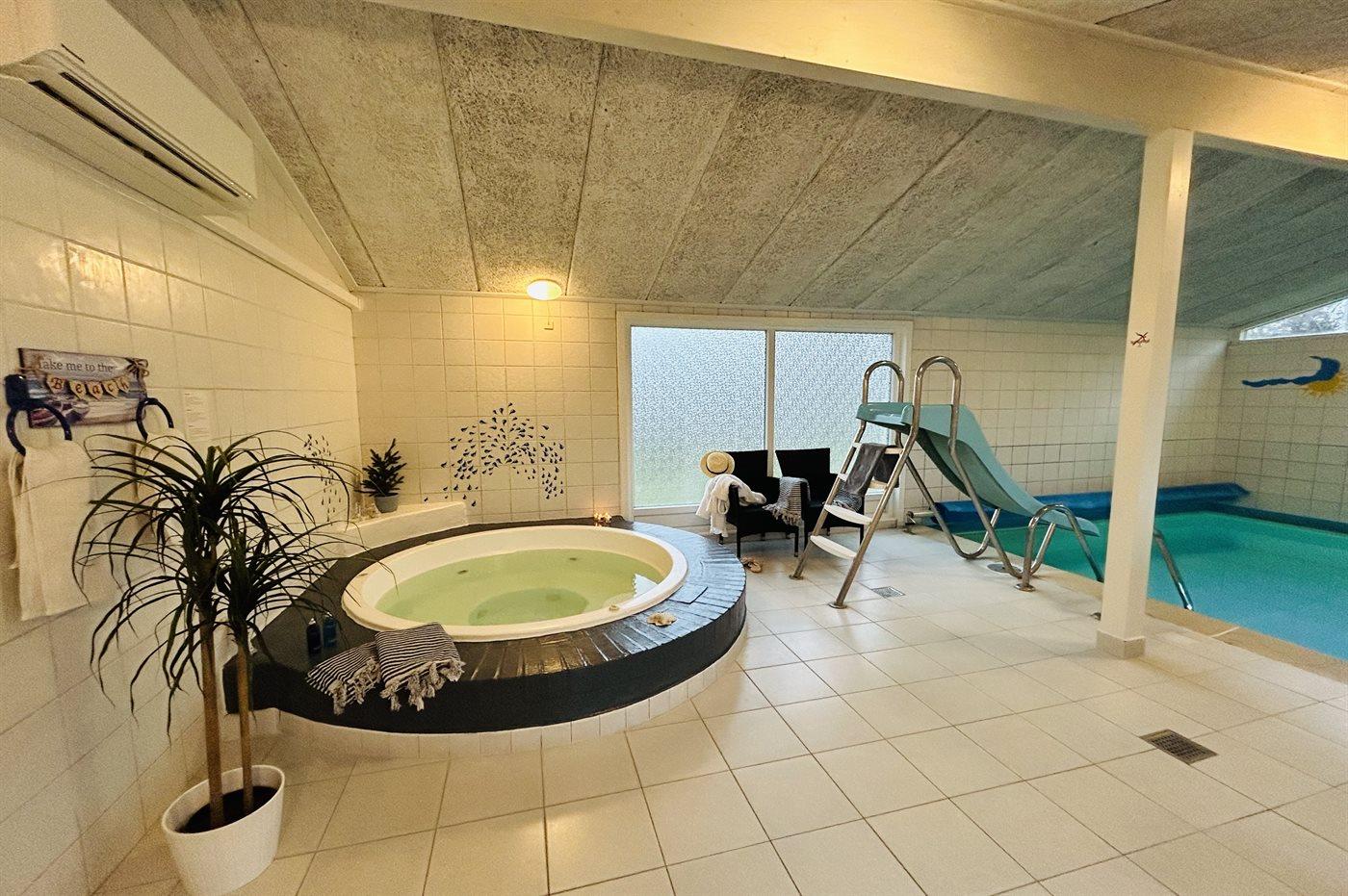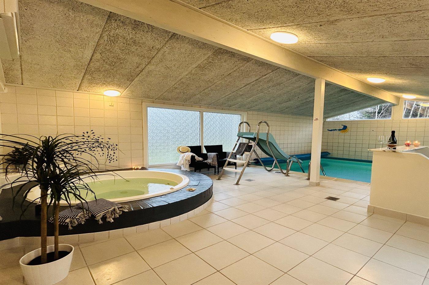 Husets hjerte er det store aflukkede pool- og wellnessområde. Her finder I den dejlige lune pool, der har en god dybde til at boltre sig i. Desuden finder I den store rummelige standvands-spa, med bobler og klorvand, som I kan glide direkte ned i efter en tur i poolen. Det hele kan afsluttes med en tur i saunaen.