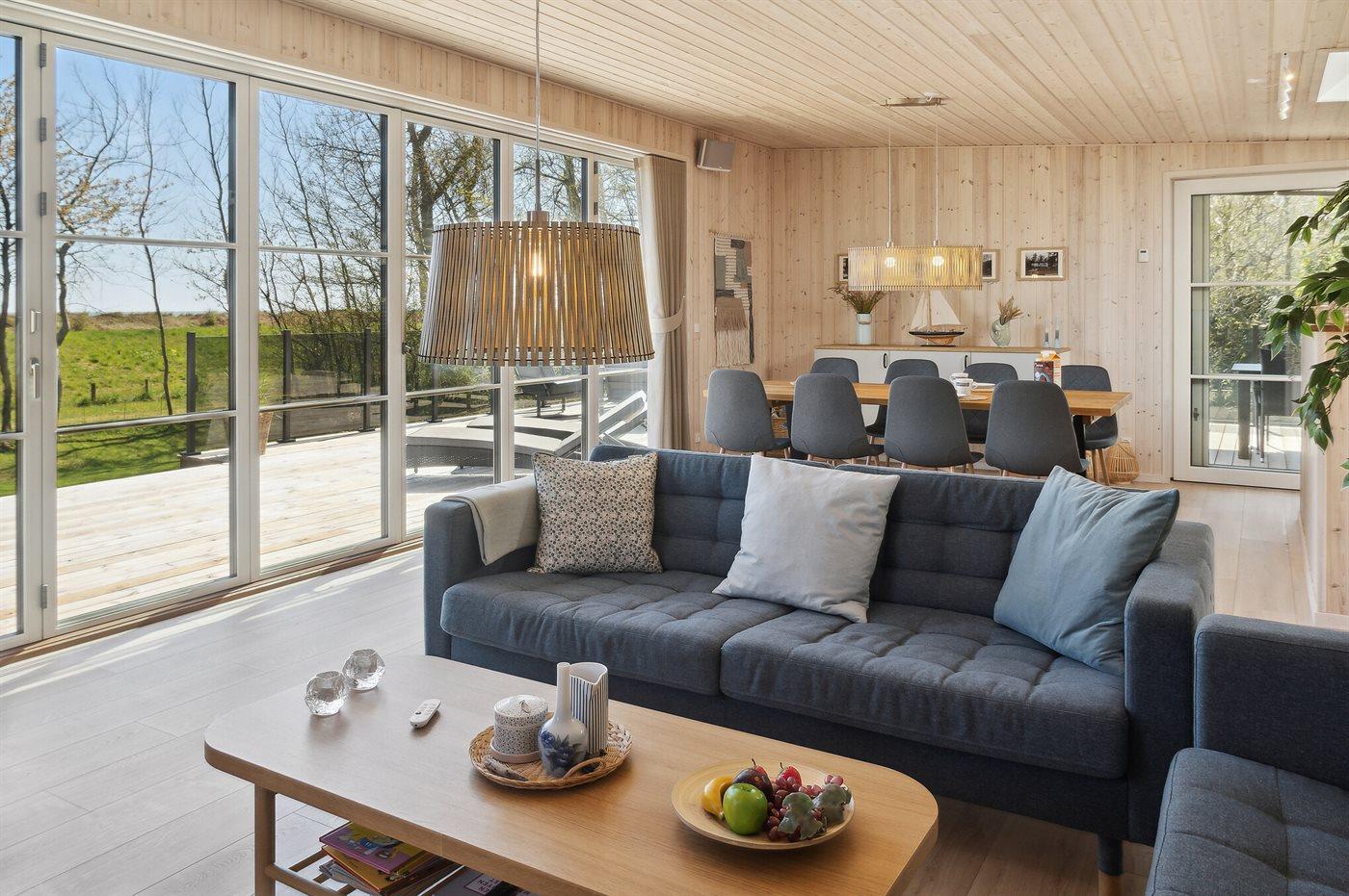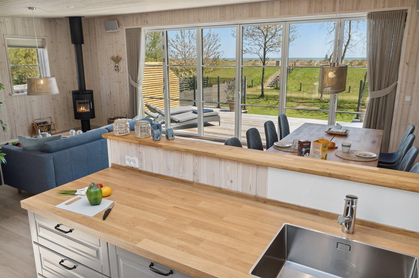 Et helt nyt sommerhus i første række med fantastisk udsigt ud over vandet. Sommerhuset er indrettet, så man fra stuen kan gå direkte ud på en stor terrasse. Vinduerne fra stuen kan køres helt til siden, så man får et virkeligt stort område at nyde den fantastiske udsigt fra.