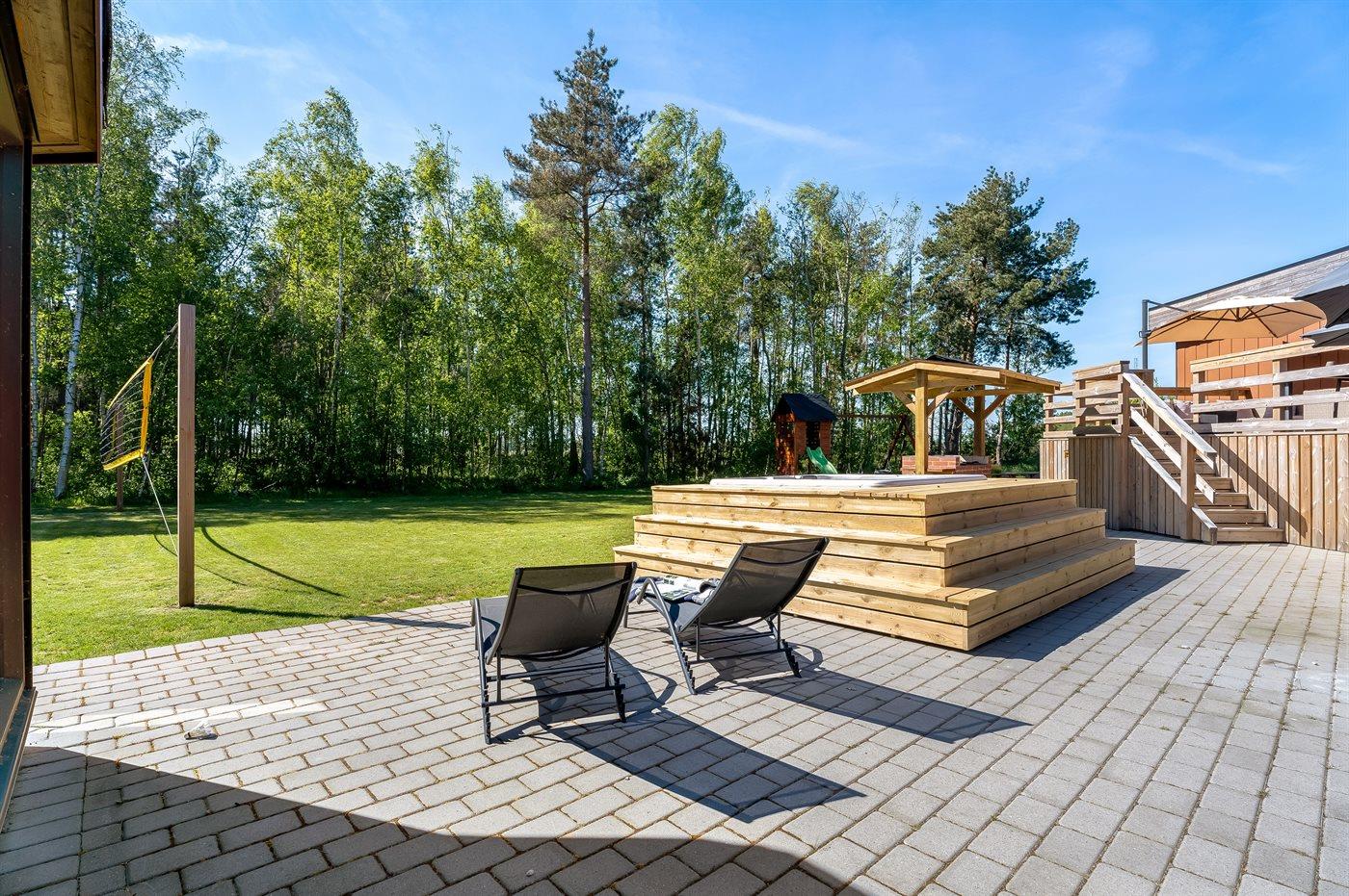 Ferieboligen er beliggende på en 2200 m² stor naturgrund. Der er 700 m til havet. Nærmeste forretning er beliggende i en afstand af 1500 m. Til ferieboligen hører åbent terrasseareal. Gynge. Sandkasse. Legetårn. Rutchebane. Fodboldmål. Bålsted. Der er overdækket, opmuret grill til rådighed. Der er installeret stik til opladning af elbil. Type 2 stik. Med 11 kW ladeeffekt. Parkering ved ferieboligen.
