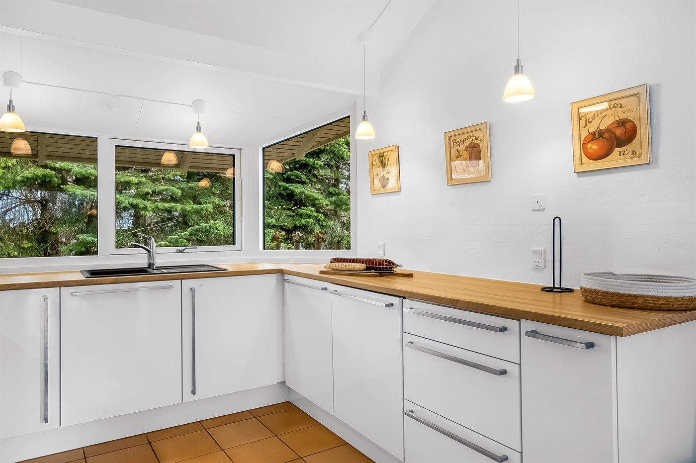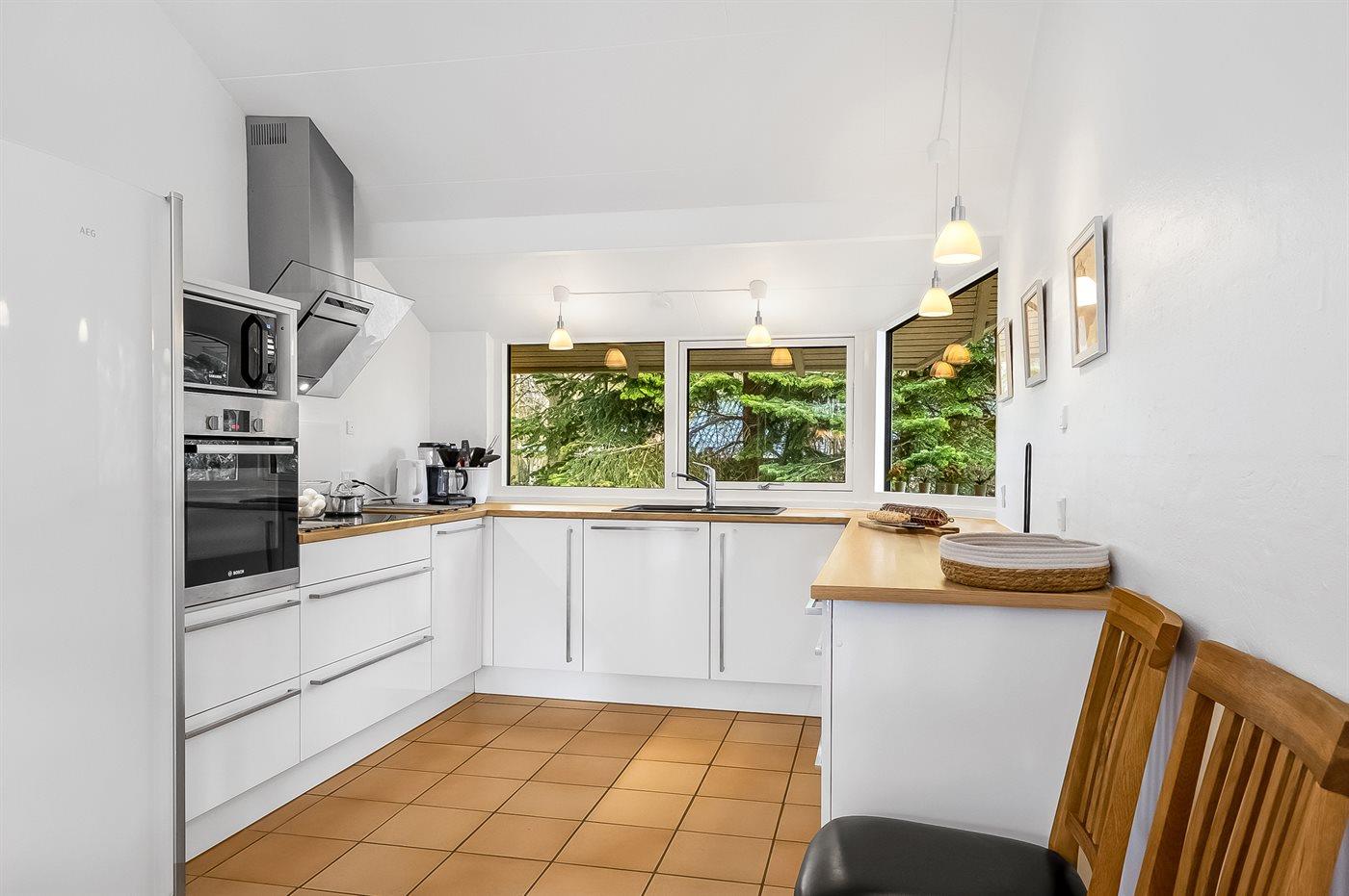 Køkkenet er udstyret med 1 køleskab. Der er 4 induktionskogeplader, varmluftovn, mikrobølgeovn samt opvaskemaskine.