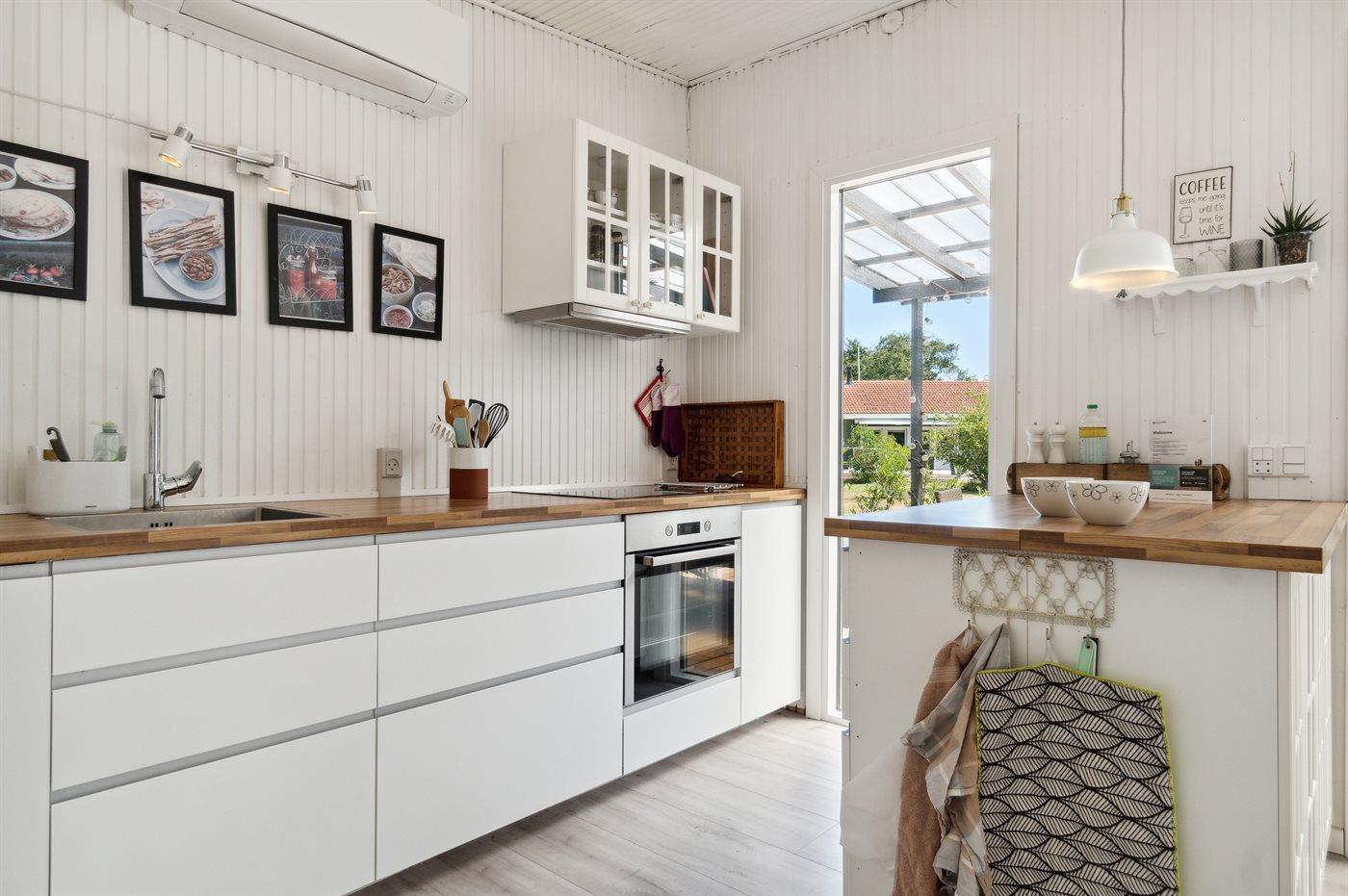 Køkkenet er udstyret med 1 køleskab. Der er 4 keramiske kogeplader, varmluftovn, mikrobølgeovn samt opvaskemaskine.