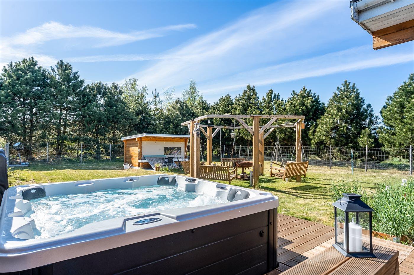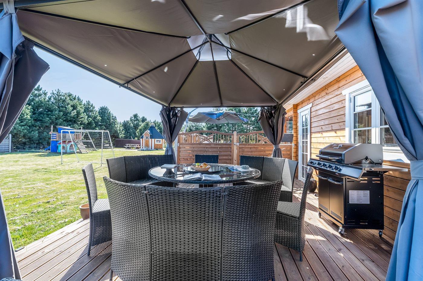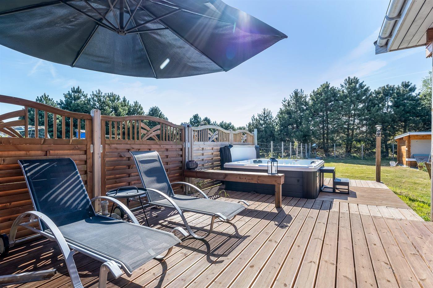 Velkommen til et sommerhus der på rigtig mange områder skiller sig positivt ud fra mængden. Huset er indrettet, så der er mange hyggeområder både for små og store samtidig med, at man fornemmer samværet med de øvrige, der er med på ferie. Er man til udeliv, byder dette hus på virkelig fine løsninger for fællesskab og hygge. Det være sig lige fra den store udendørs grill med hængesofaer rundt om, udendørs spa, shelteren, legepladsen, til det dejlige grill-hus.
