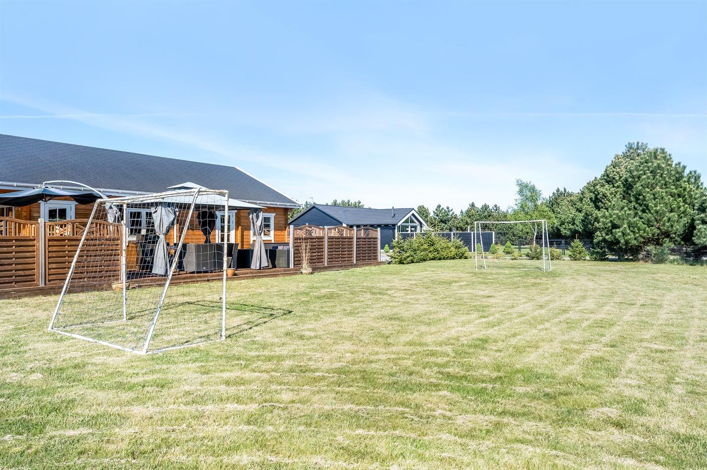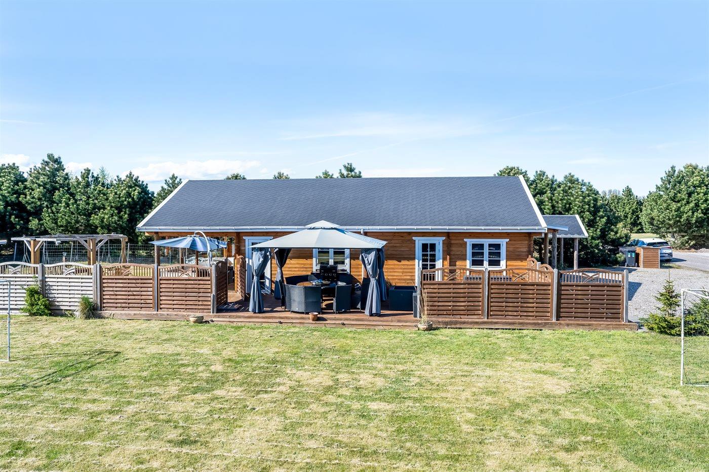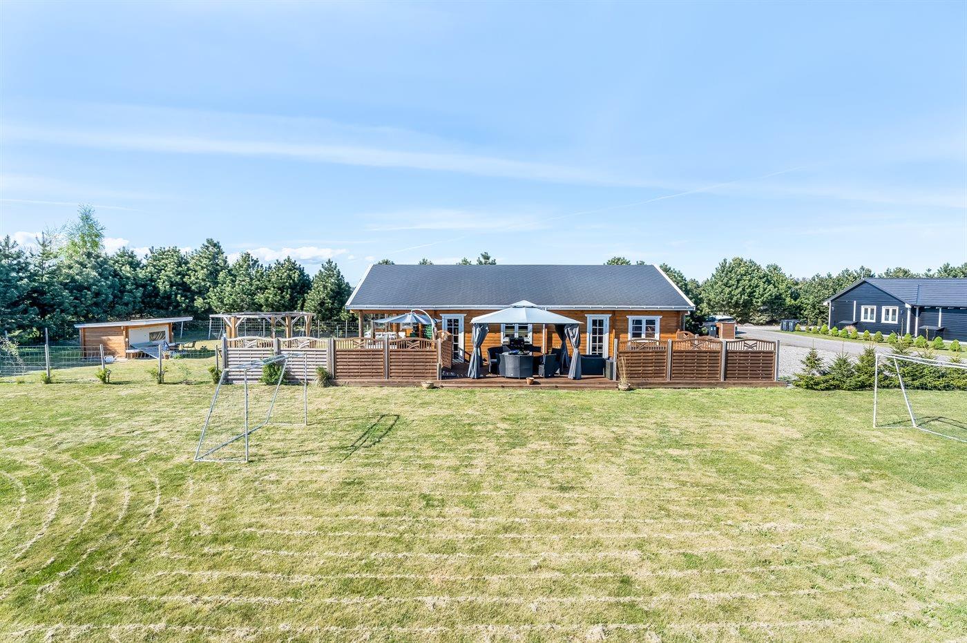 Ferieboligen er beliggende på en 1700 m² stor naturgrund. Grunden er indhegnet. Der er 1450 m til havet. Nærmeste forretning er beliggende i en afstand af 1100 m. Der er en golfbane i en afstand af 2000 m. Til ferieboligen hører åbent terrasseareal. Gynge. Sandkasse. Legehus. Legetårn. Vippe. Fodboldmål. Shelter. På lune aftener sørger en udendørs pejs for hyggelig stemning. Grill til rådighed. Der er installeret stik til opladning af elbil. Med 11 kW ladeeffekt. Parkering ved ferieboligen.