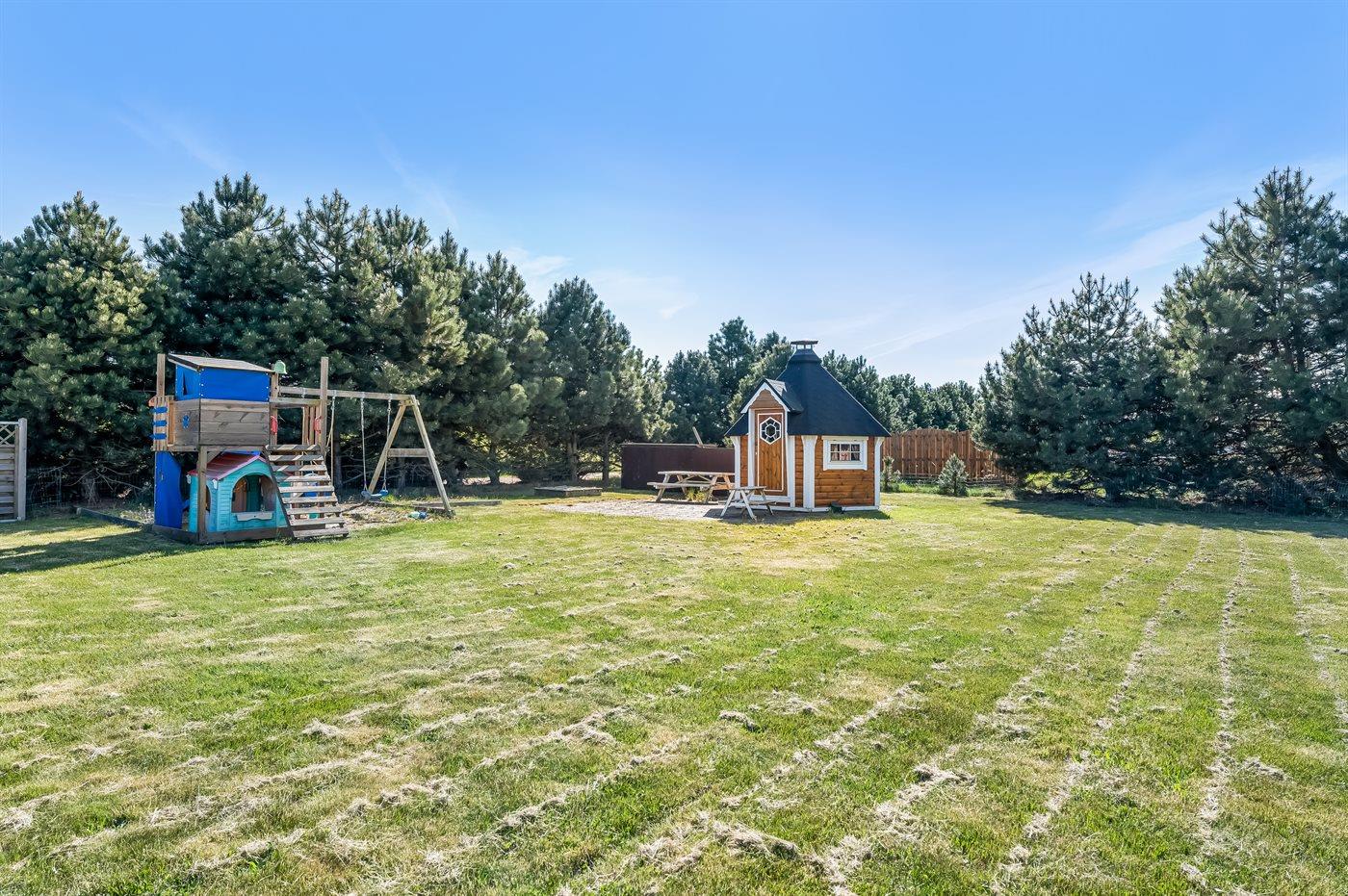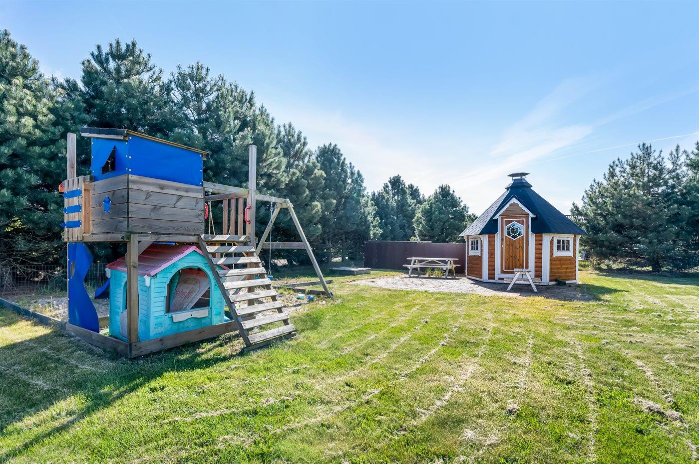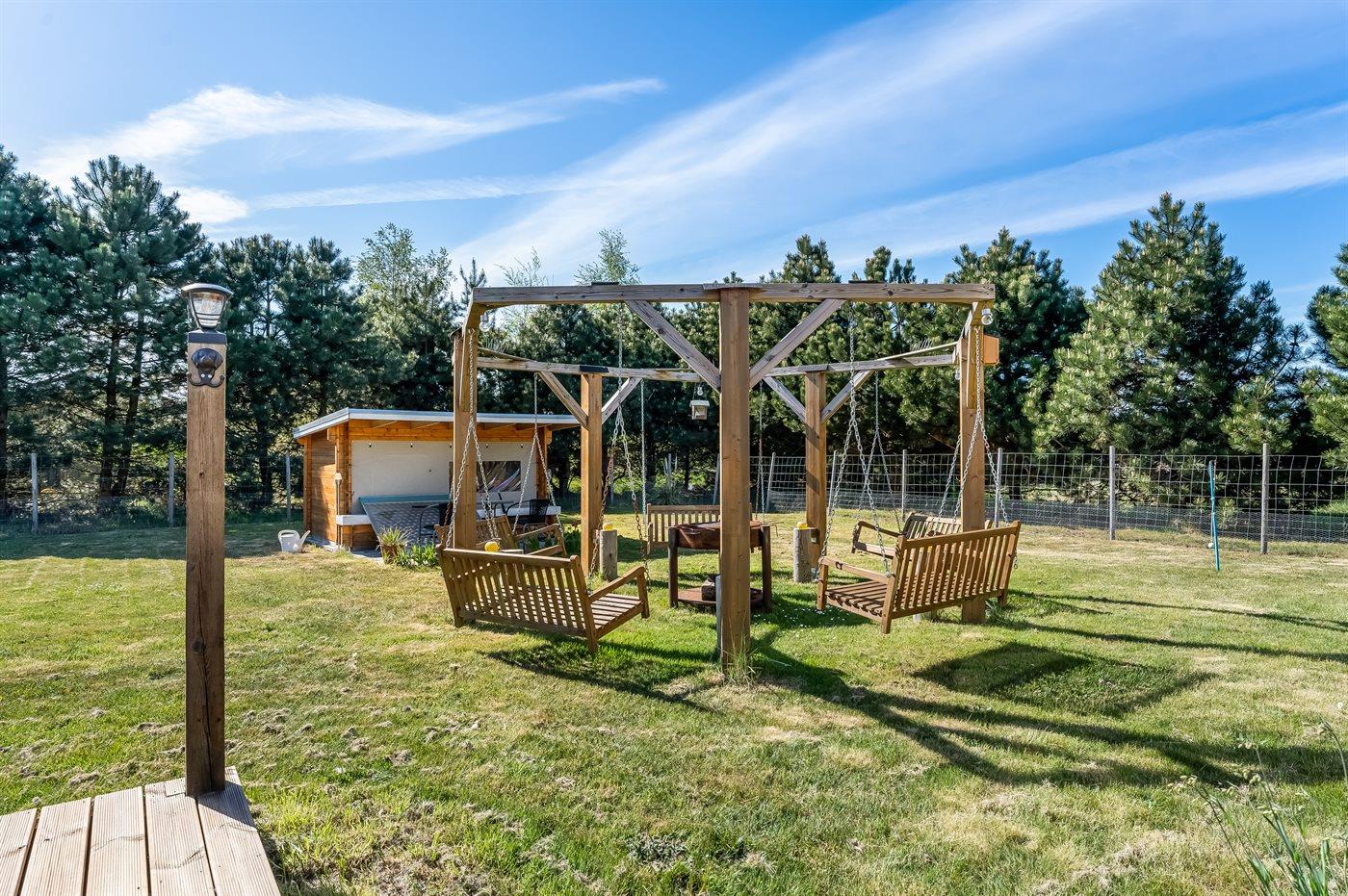 Ferieboligen er beliggende på en 1700 m² stor naturgrund. Grunden er indhegnet. Der er 1450 m til havet. Nærmeste forretning er beliggende i en afstand af 1100 m. Der er en golfbane i en afstand af 2000 m. Til ferieboligen hører åbent terrasseareal. Gynge. Sandkasse. Legehus. Legetårn. Vippe. Fodboldmål. Shelter. På lune aftener sørger en udendørs pejs for hyggelig stemning. Grill til rådighed. Der er installeret stik til opladning af elbil. Med 11 kW ladeeffekt. Parkering ved ferieboligen.