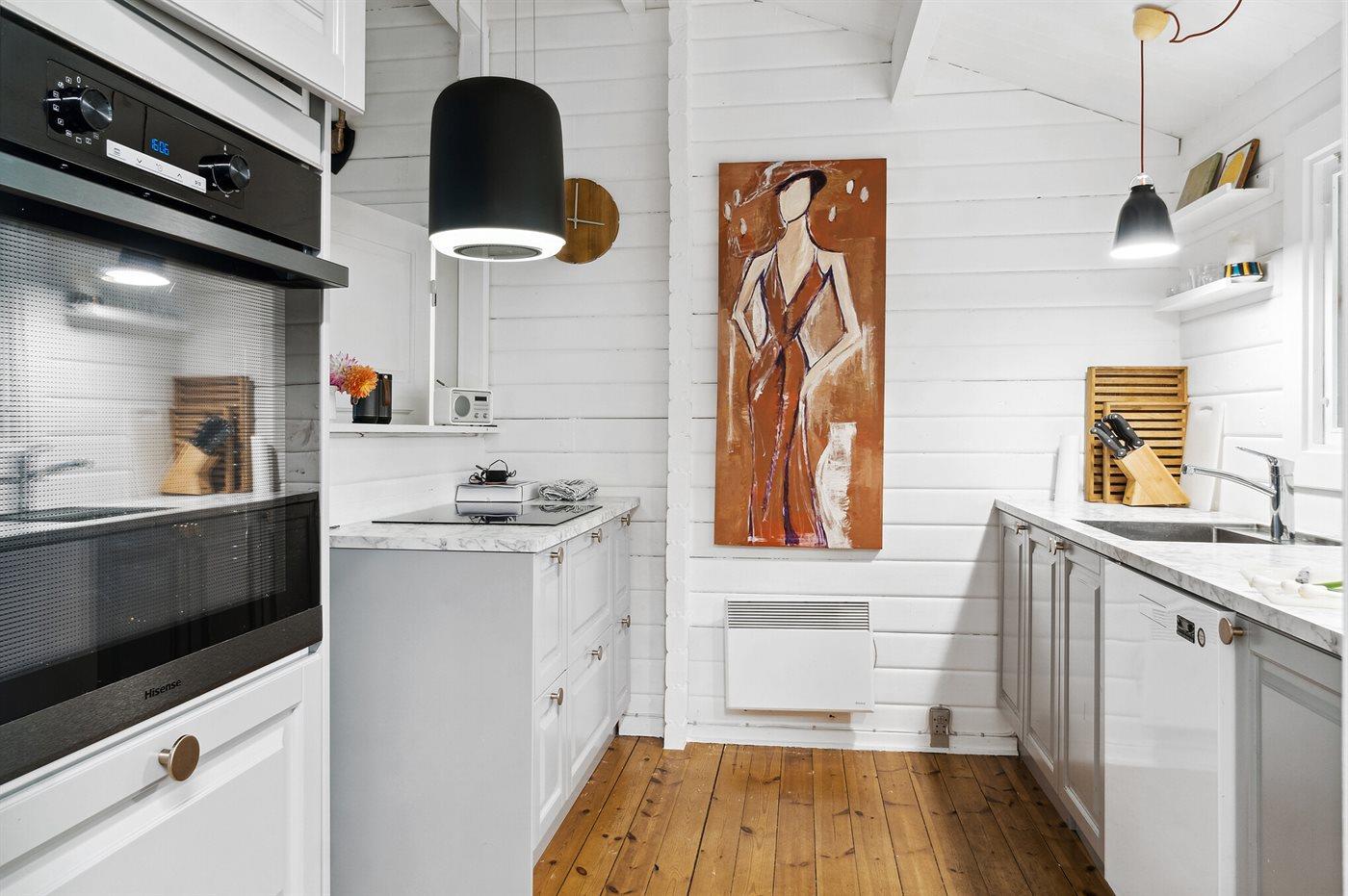 Køkkenet er udstyret med 1 køleskab. Der er 4 induktionskogeplader, varmluftovn, mikrobølgeovn samt opvaskemaskine.