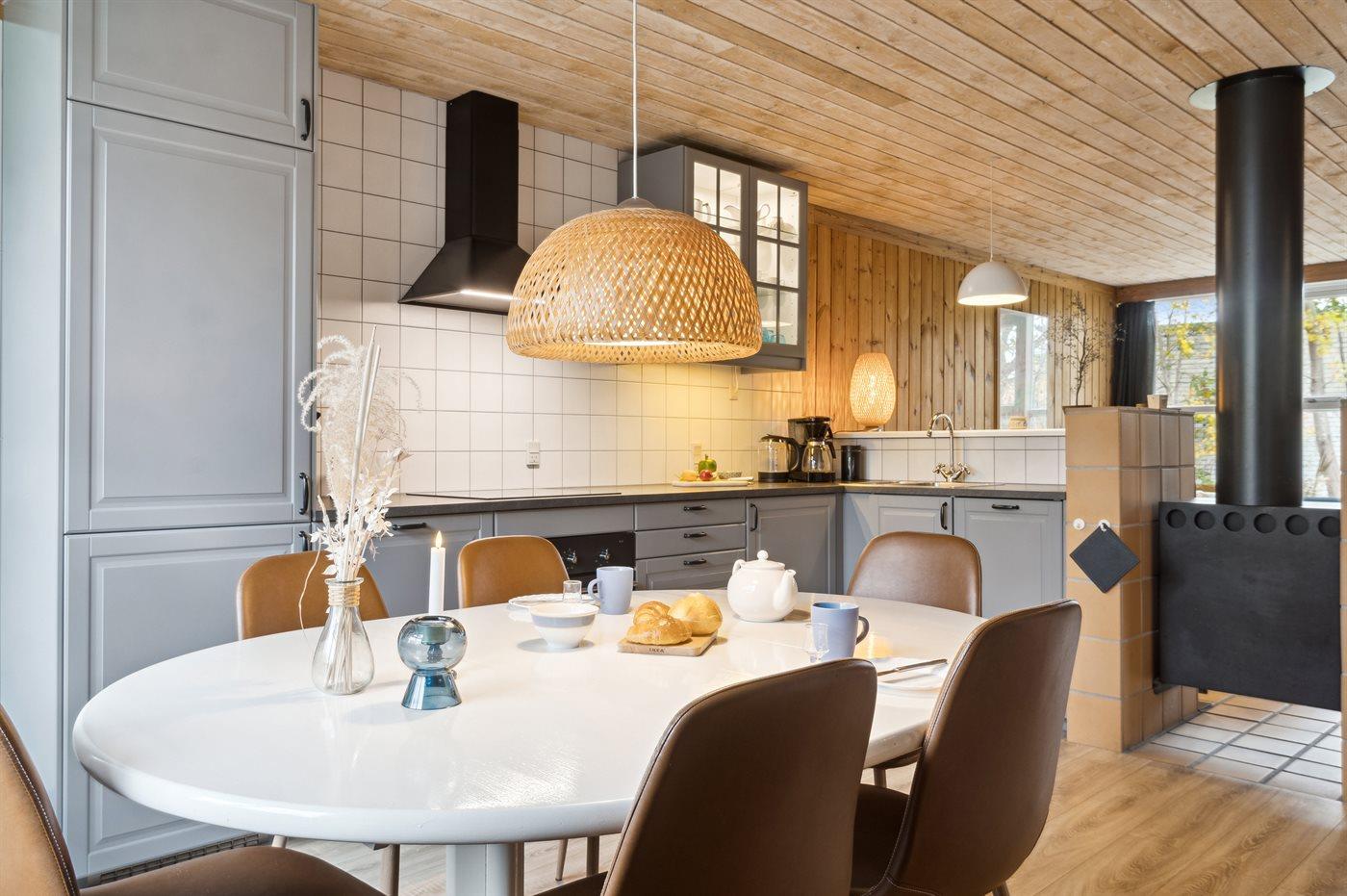 Køkkenet er udstyret med 1 køleskab. Der er 4 induktionskogeplader, varmluftovn, mikrobølgeovn samt opvaskemaskine.