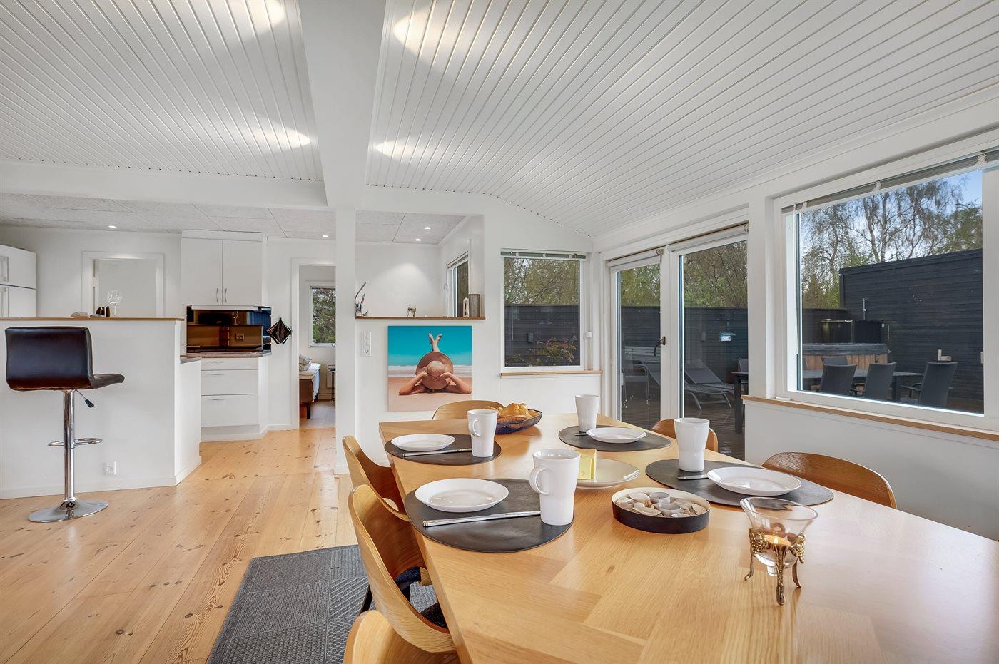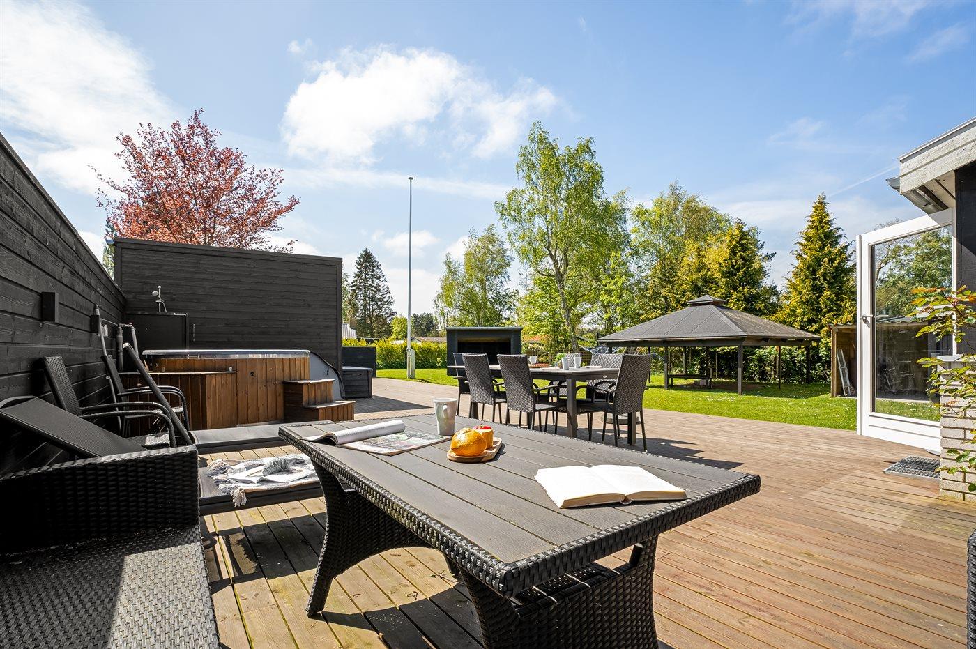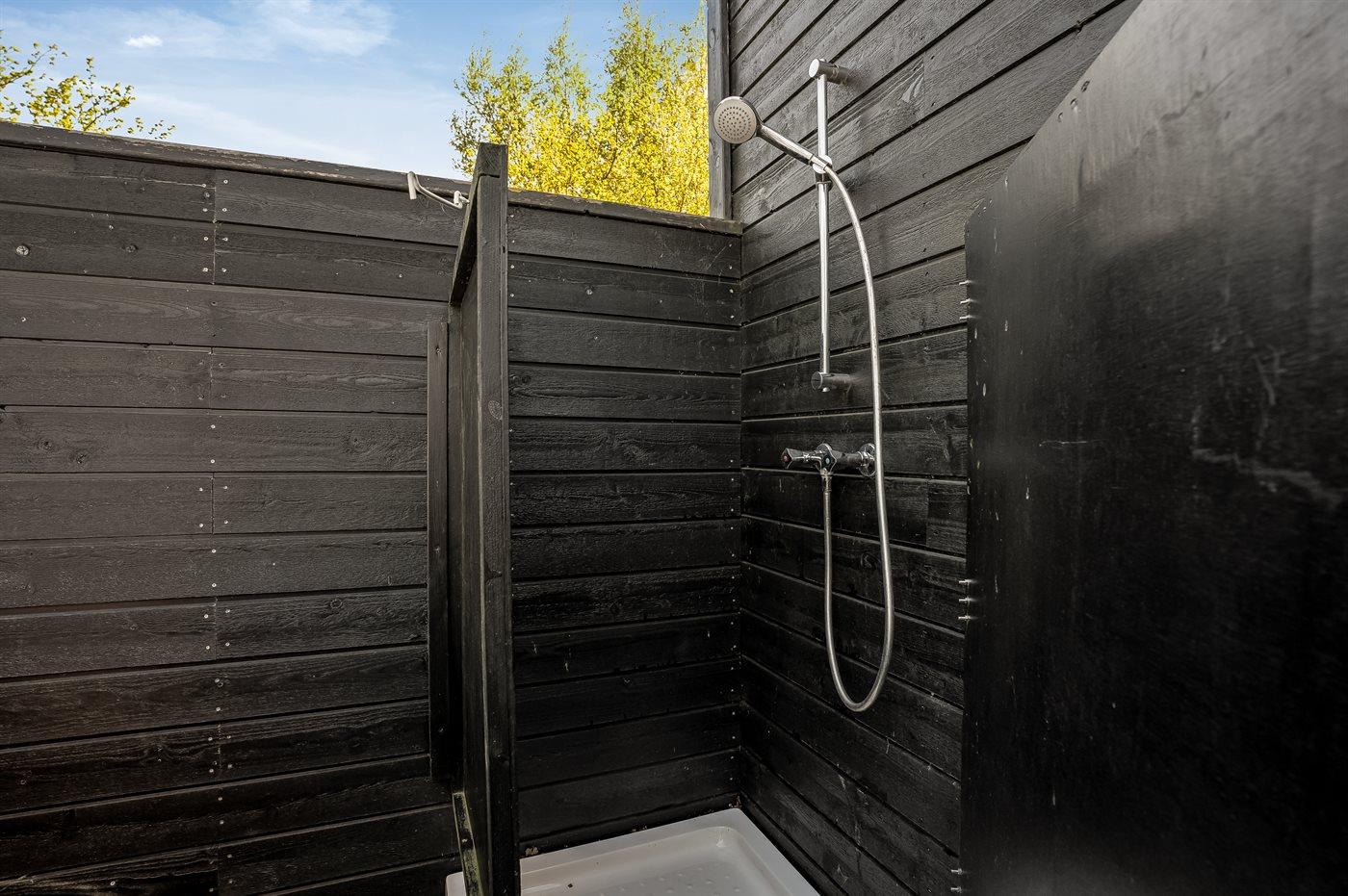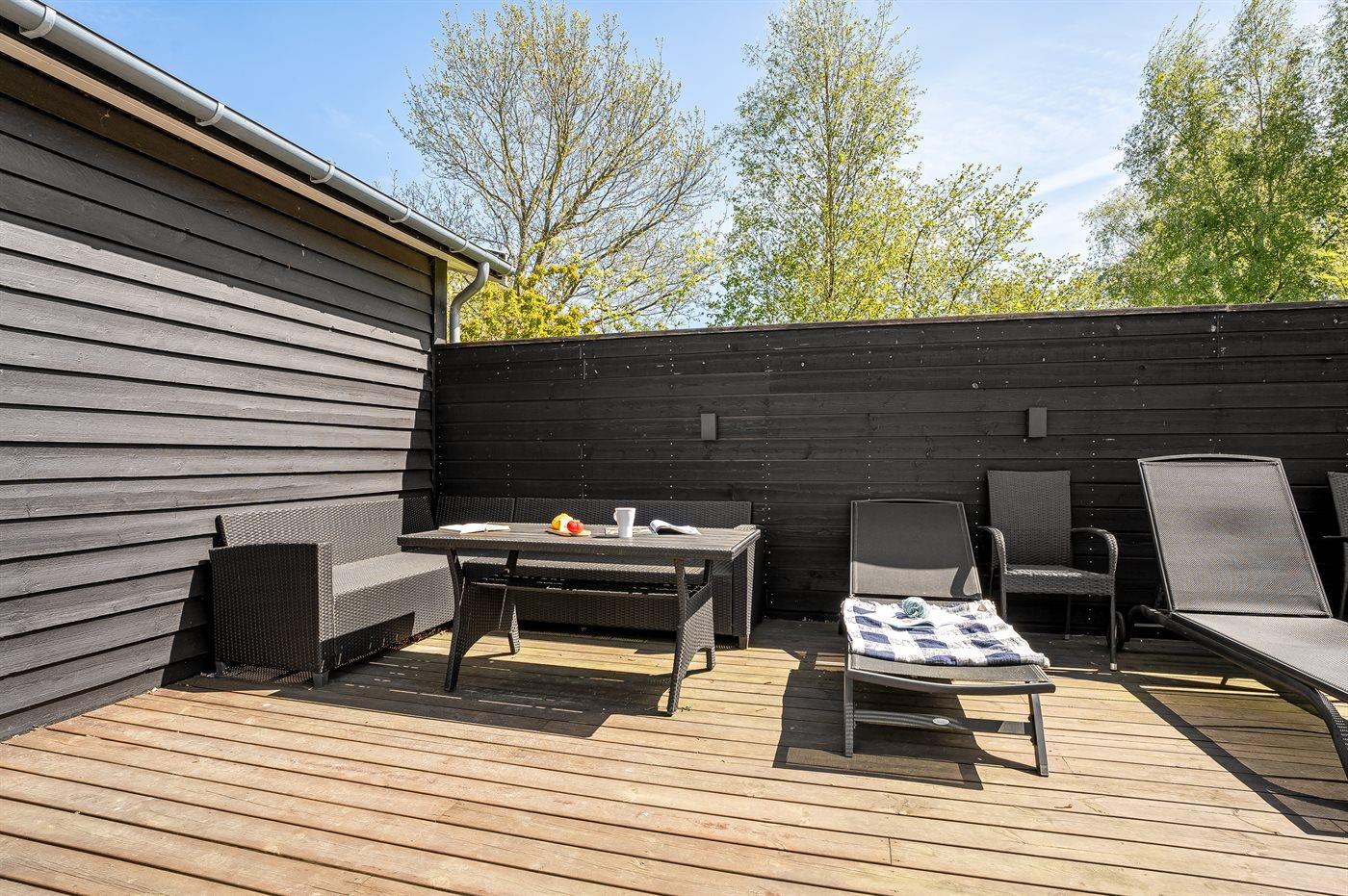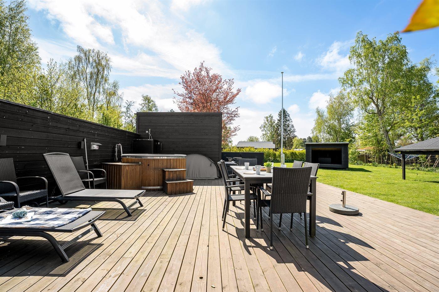 Fra stuen er der udgang til den 100 m² store træterrasse, hvor du kan nyde en kop kaffe og se solen stå op mod øst, inden du tager en morgendukkert under udebruseren. Nyd de lækre havemøbler eller hop en tur i det store vildmarksbad.