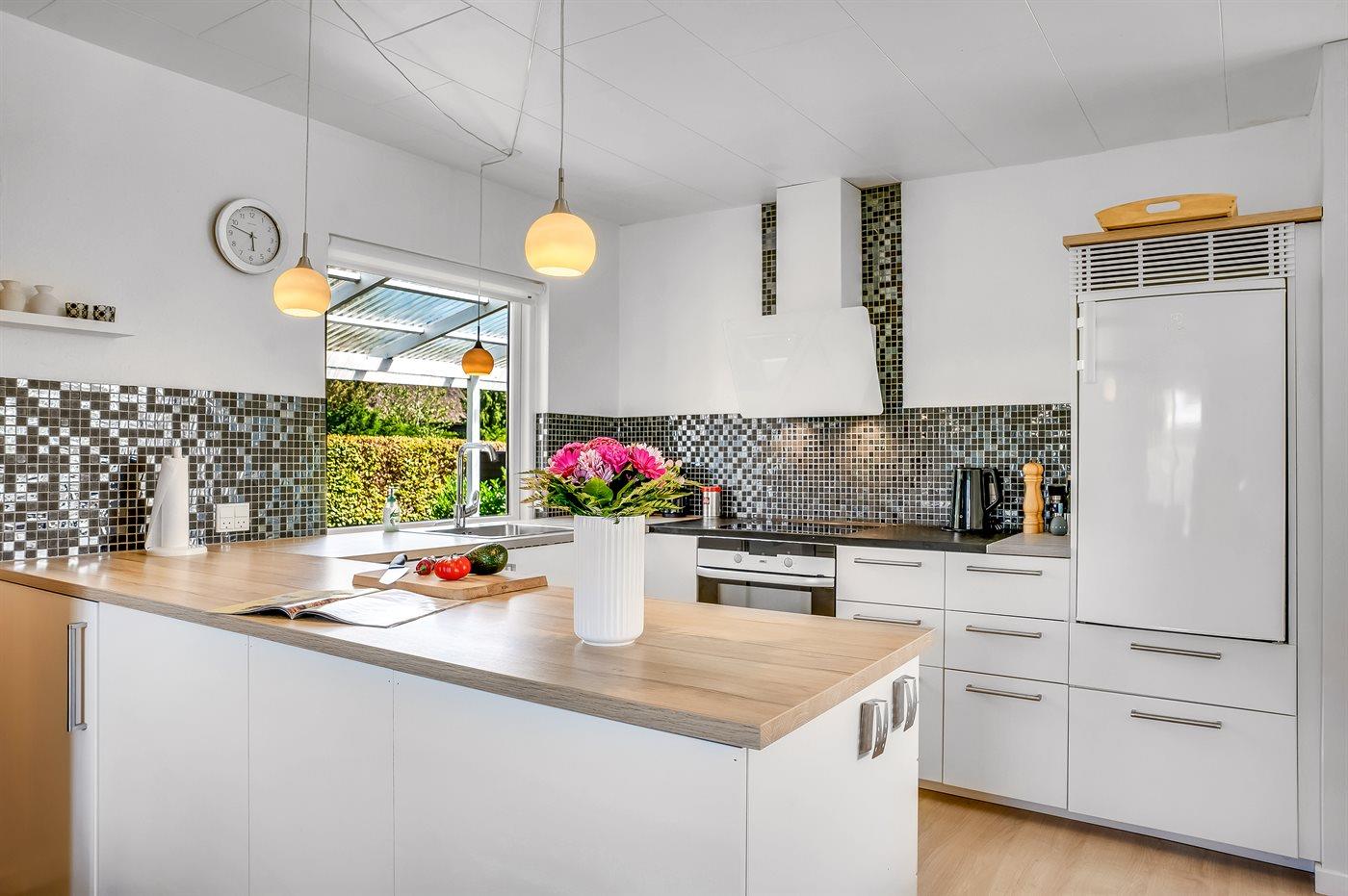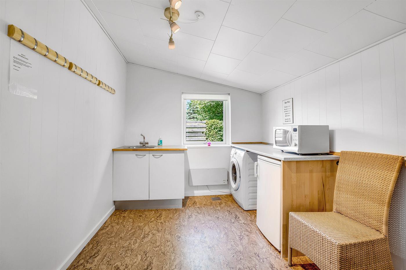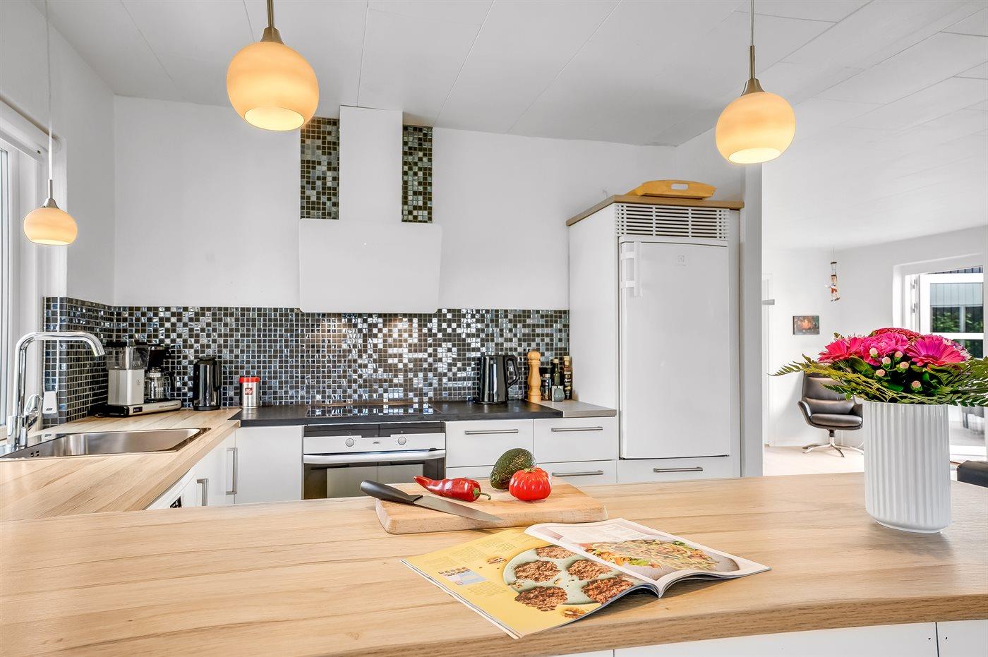 Køkkenet er udstyret med 1 køleskab. Der er 4 keramiske kogeplader, varmluftovn, mikrobølgeovn samt opvaskemaskine.