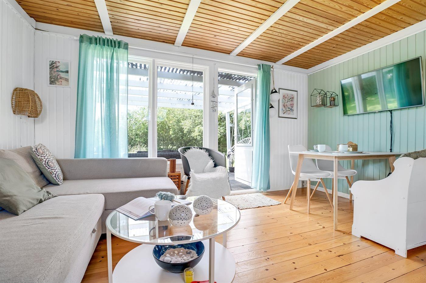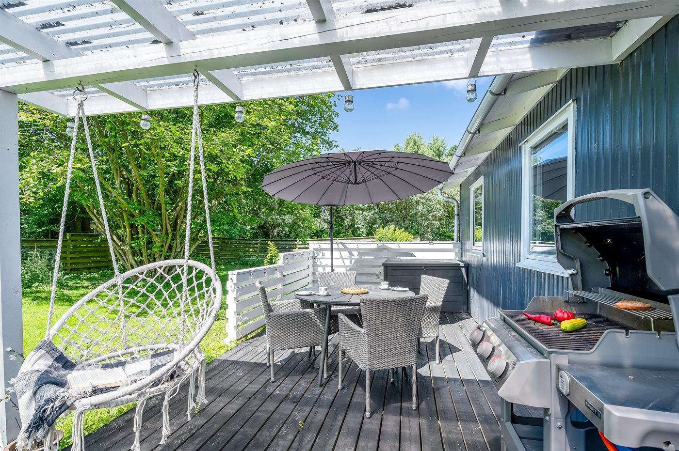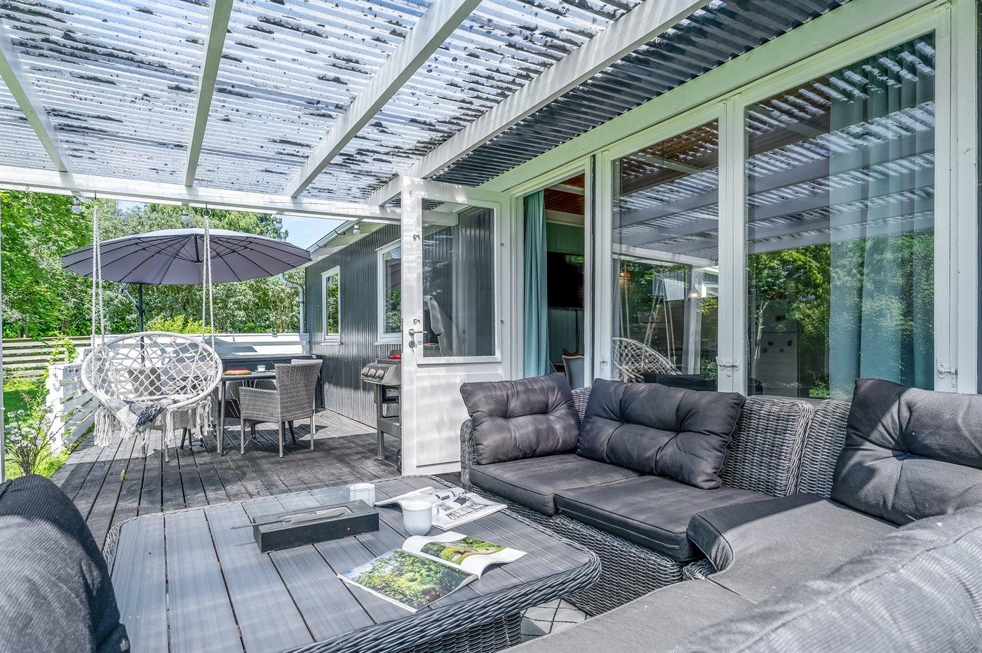 Dette funktionelt og enkelt indrettede træhus byder på en åben atmosfære og hyggelige detaljer. Stuen er indrettet med brændeovn, træpaneler og store vinduer ved sofahjørnet, der sørger for et godt lysindfald. I godt vejr kan I slappe af på de komfortable havemøbler og nyde lækre retter fra grillen på den åbne og delvist overdækkede terrasse.