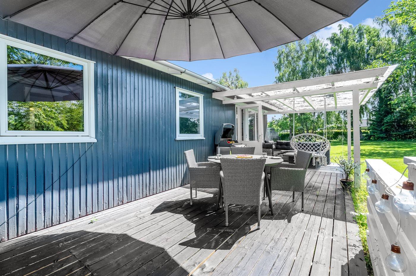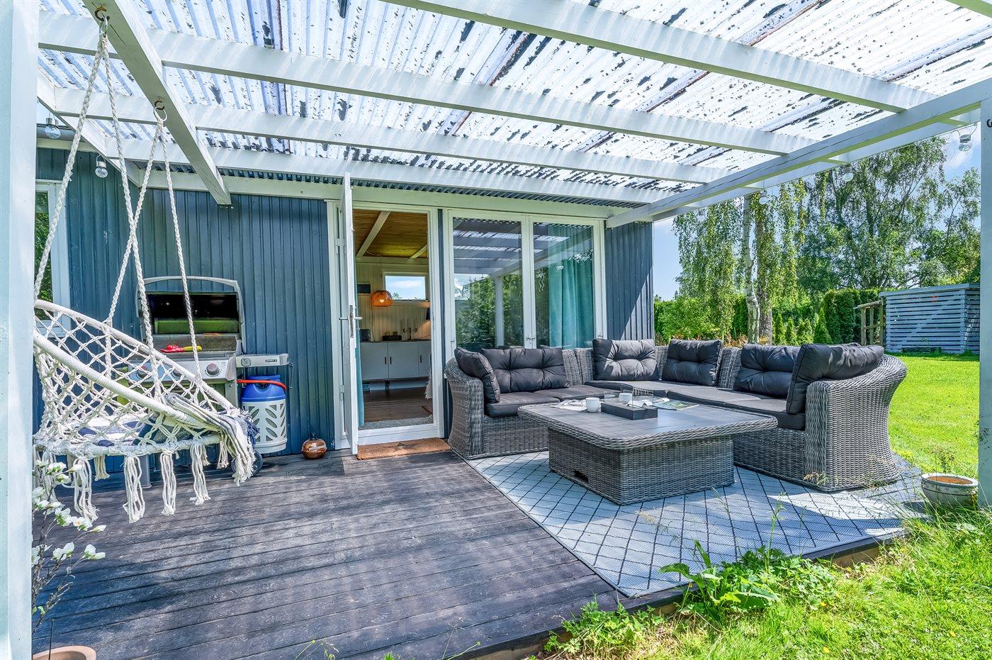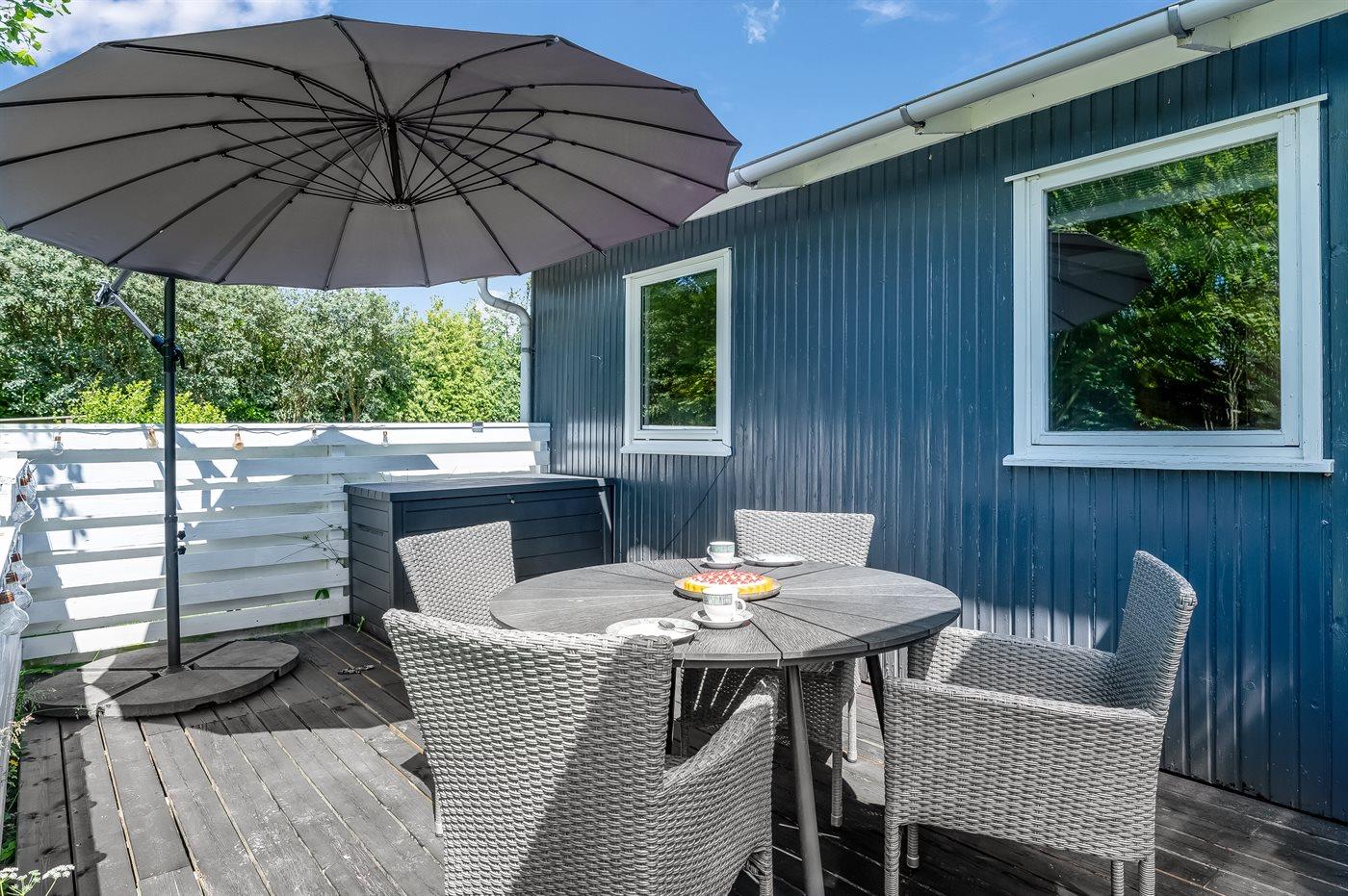 Dette funktionelt og enkelt indrettede træhus byder på en åben atmosfære og hyggelige detaljer. Stuen er indrettet med brændeovn, træpaneler og store vinduer ved sofahjørnet, der sørger for et godt lysindfald. I godt vejr kan I slappe af på de komfortable havemøbler og nyde lækre retter fra grillen på den åbne og delvist overdækkede terrasse.