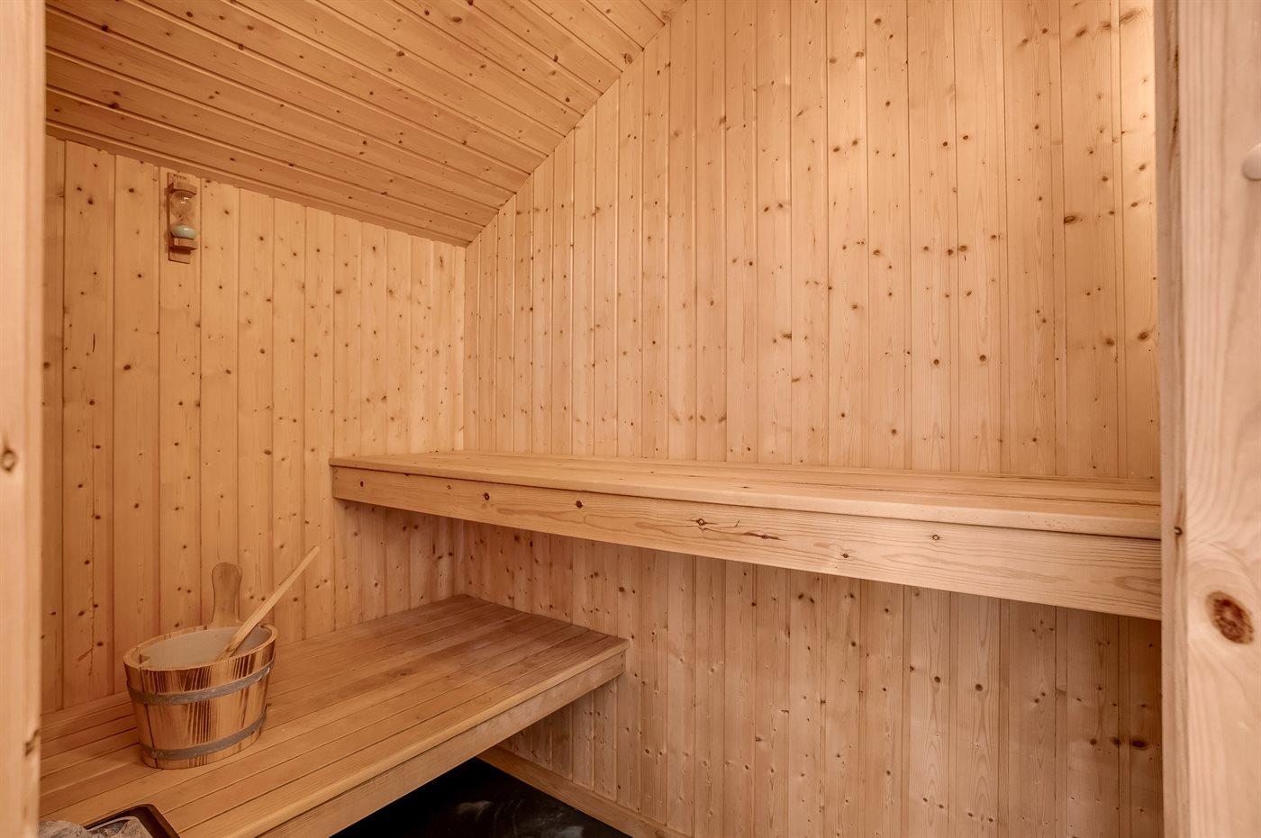 Der er 2 badeværelser med bruseniche og 2 toiletter. Der er gulvvarme på 2 badeværelser. I saunaen er der mulighed for afslapning.