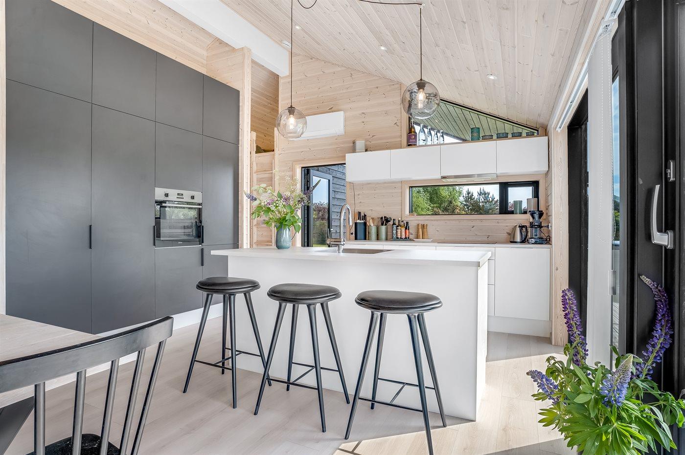 Køkkenet er udstyret med 1 køleskab. Der er 4 induktionskogeplader, varmluftovn, mikrobølgeovn samt opvaskemaskine.