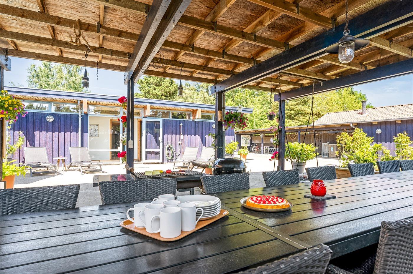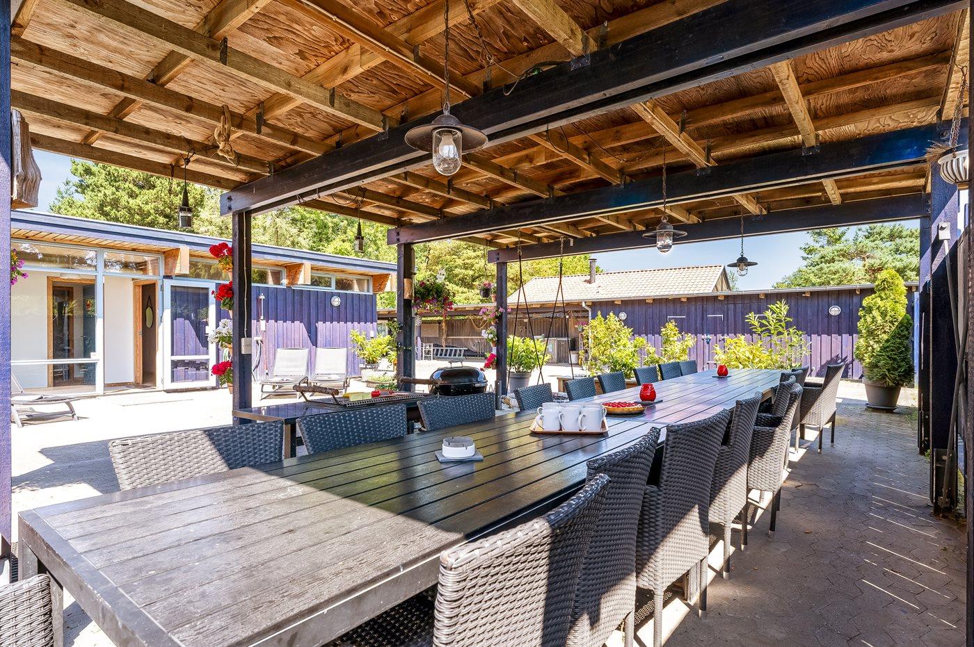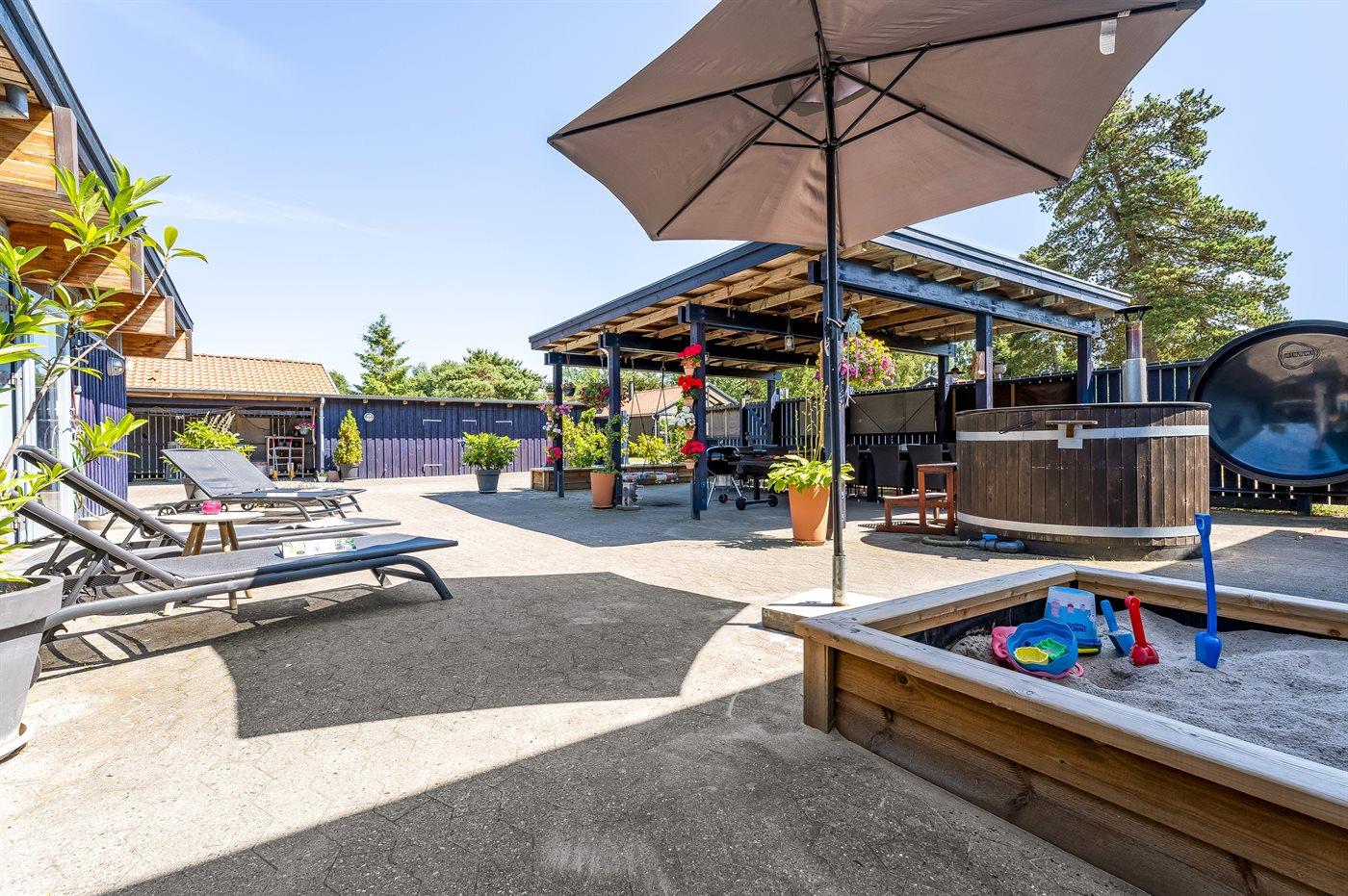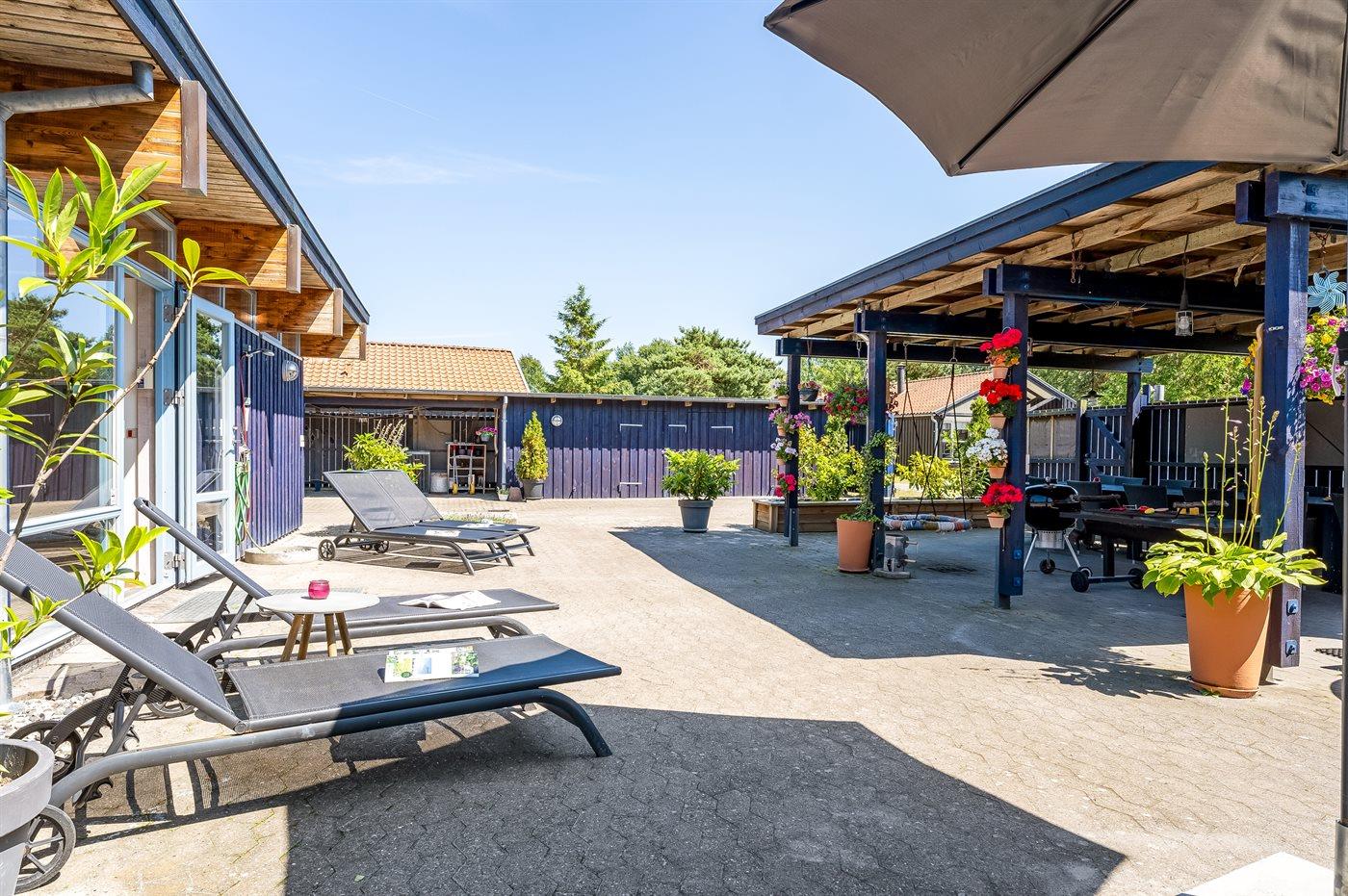 Der er en stor, lukket gårdhave og terrassearealer, hvor du også finder et vildmarksbad. Grunden er helt lukket og ligger i et tidligere feriecenter.