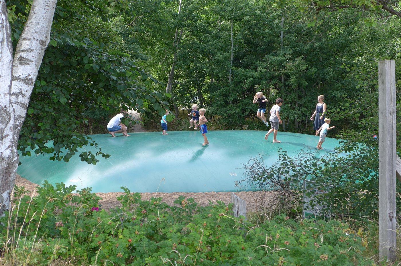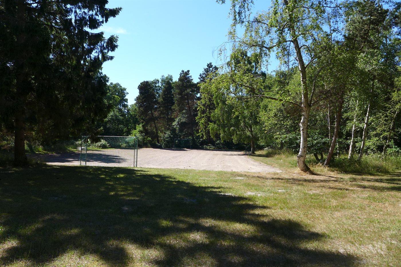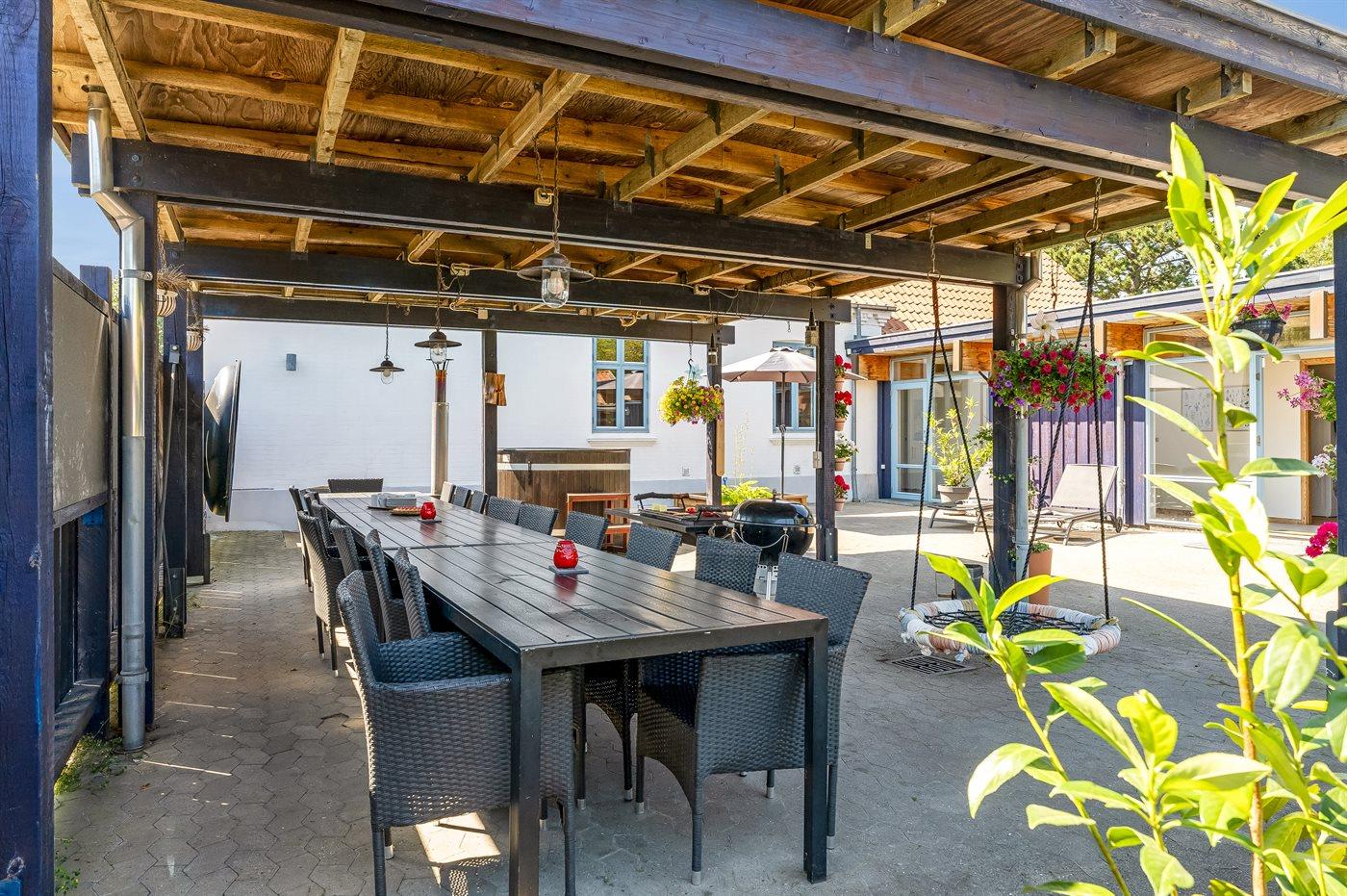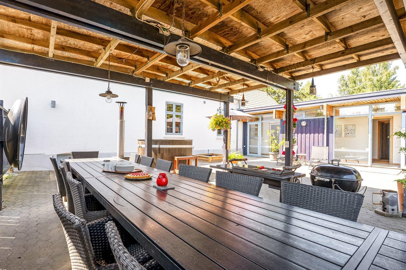 Der er en stor, lukket gårdhave og terrassearealer, hvor du også finder et vildmarksbad. Grunden er helt lukket og ligger i et tidligere feriecenter.