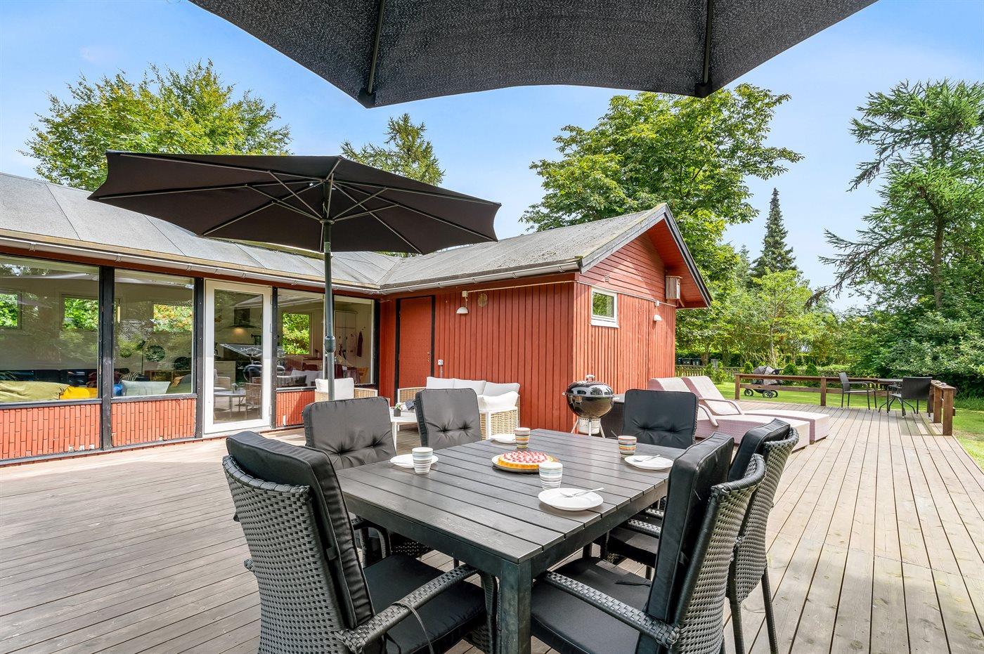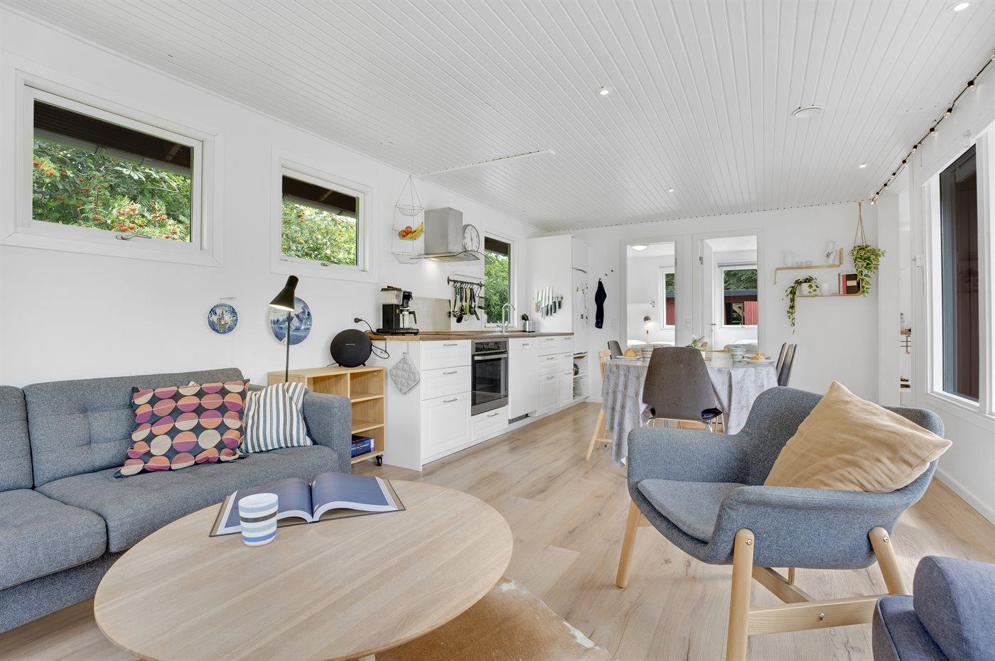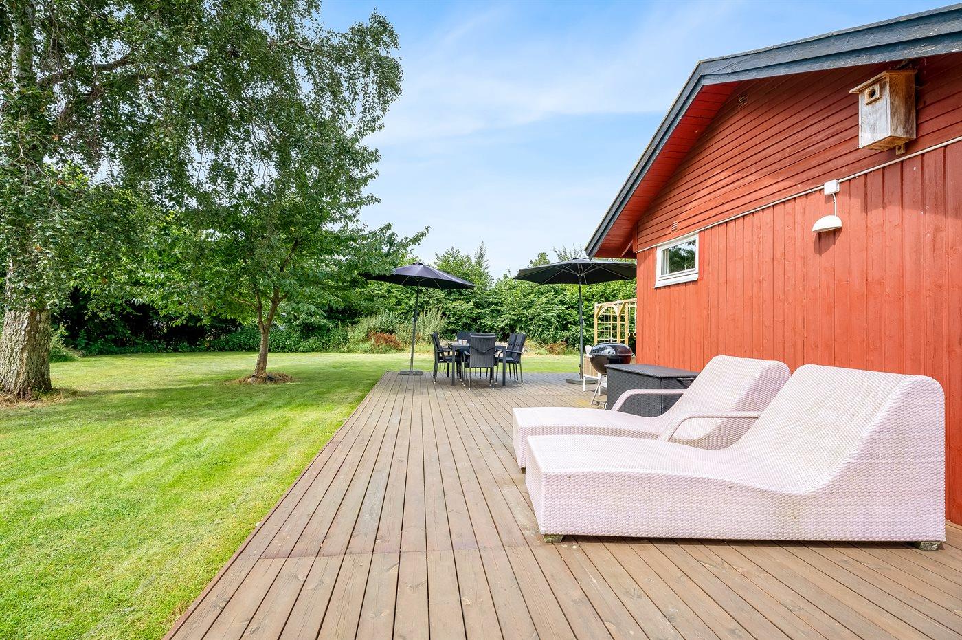 Huset er lyst og venligt indrettet med tre soveværelser. Der er et pænt badeværelse samt åbent køkken i forbindelse med spise- og opholdsstuen. Fra stuen er der udgang til en kæmpestor træterrasse med komfortable havemøbler og grill. Huset ligger i gåafstand til den skønne sandstrand, som flere gange er kåret som en af Danmarks bedste.