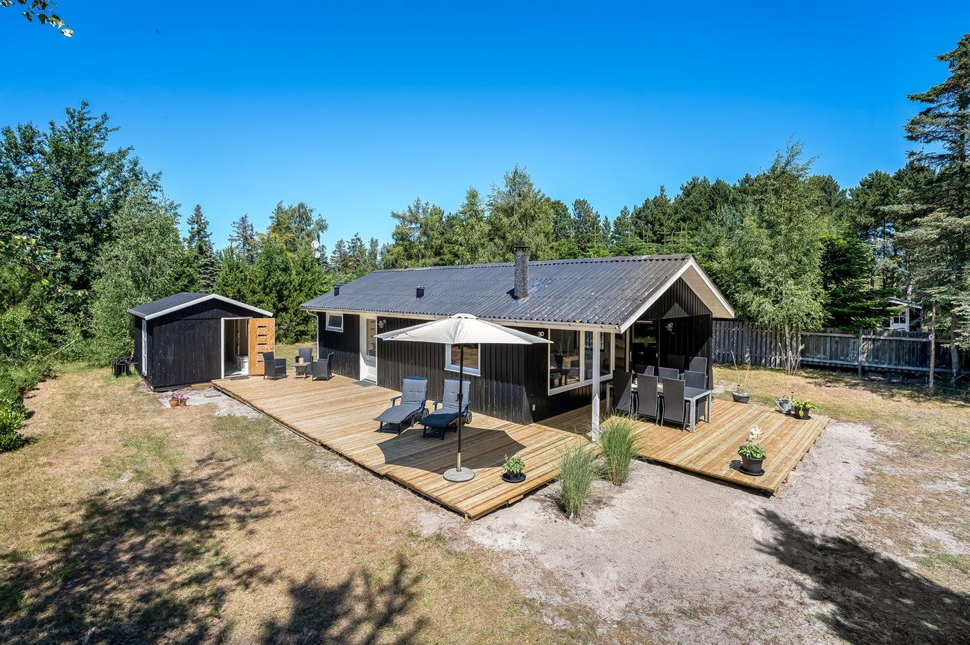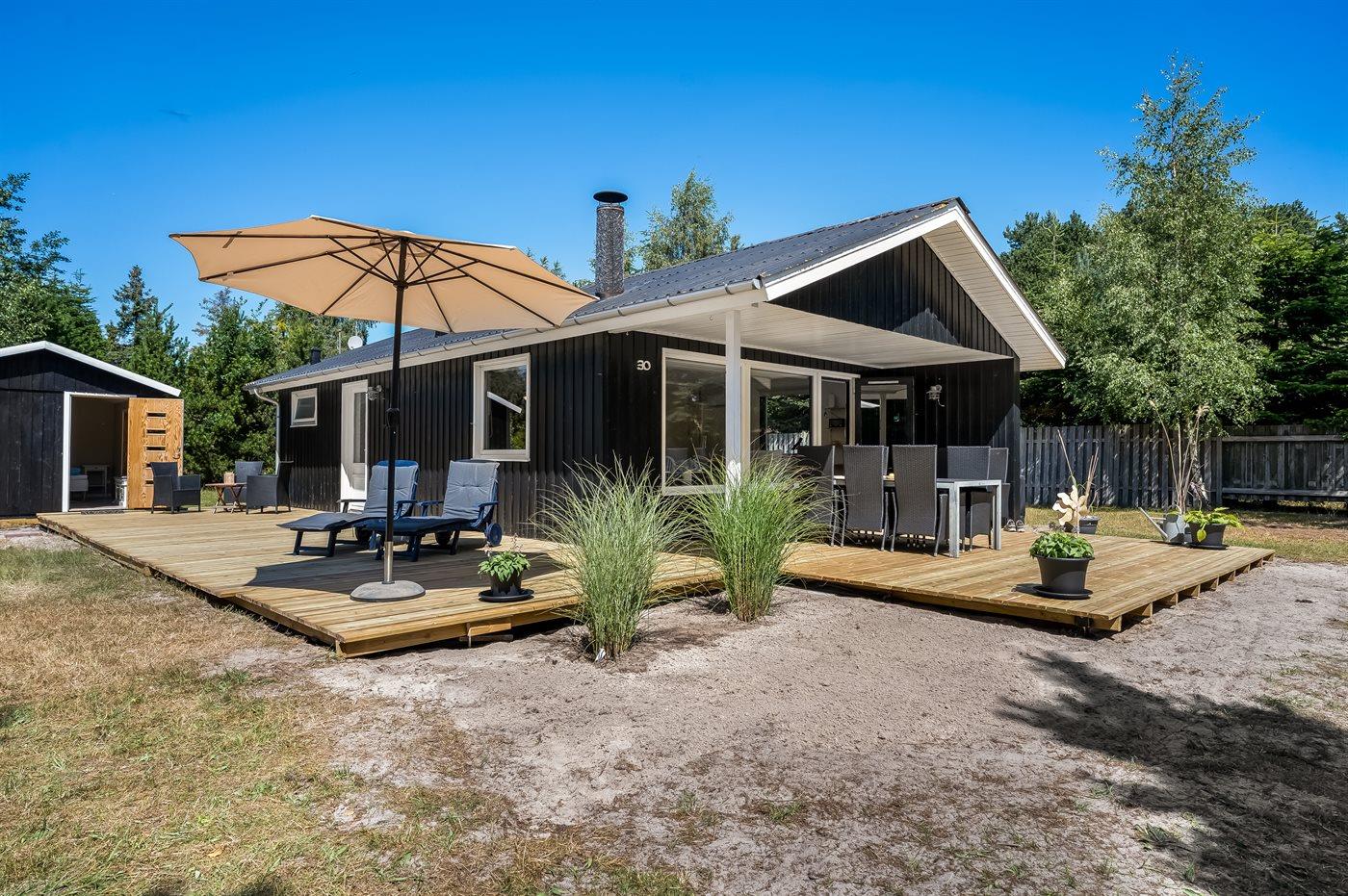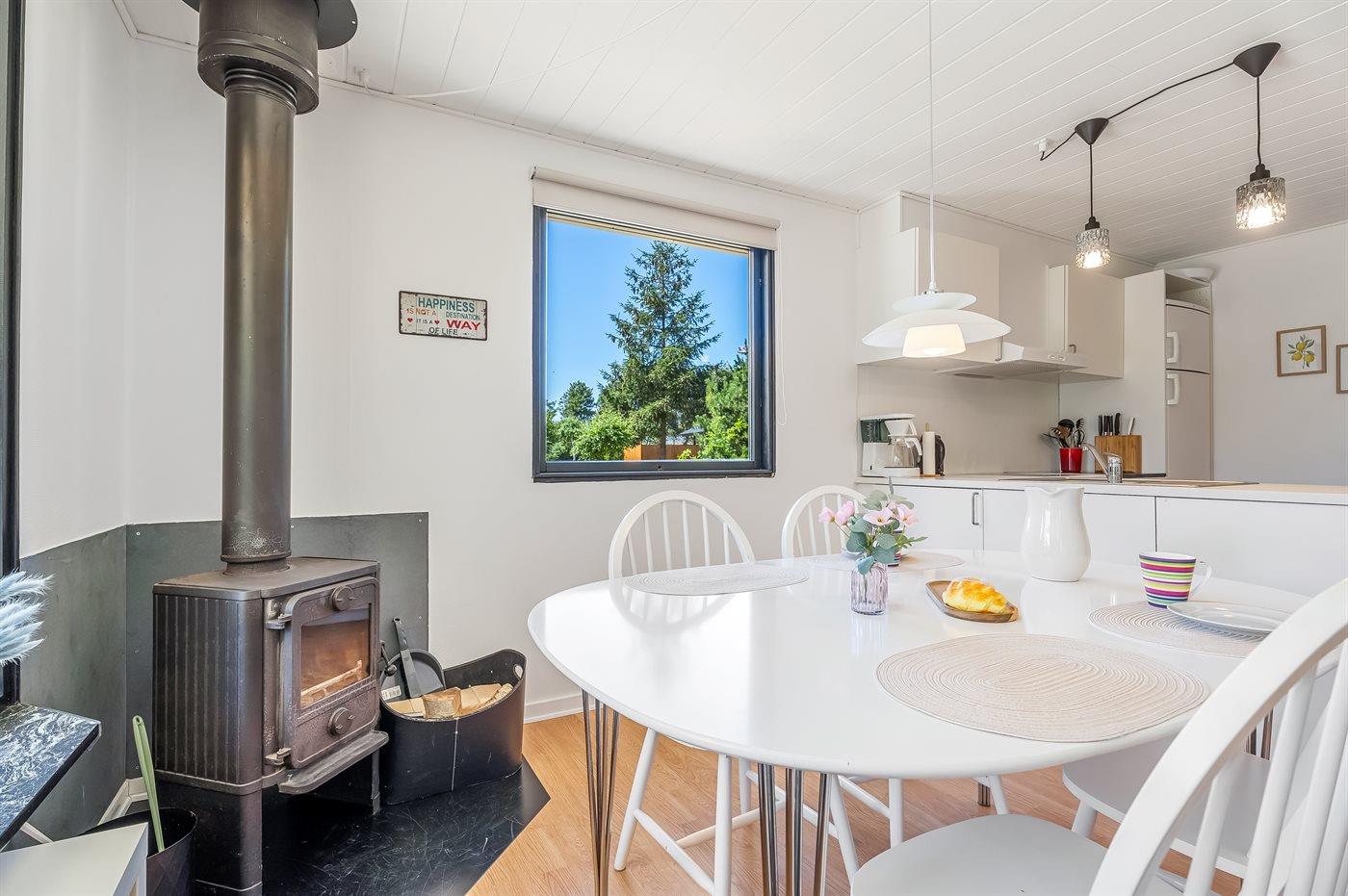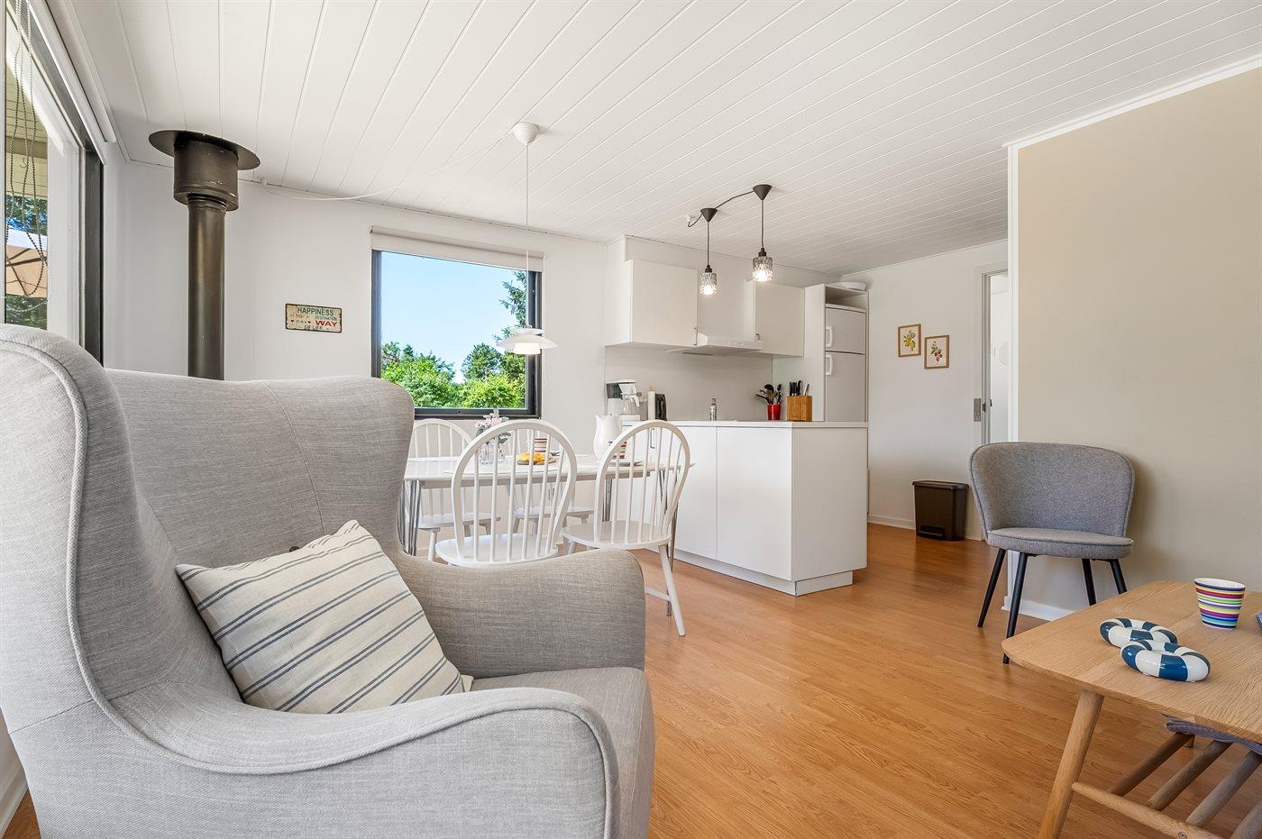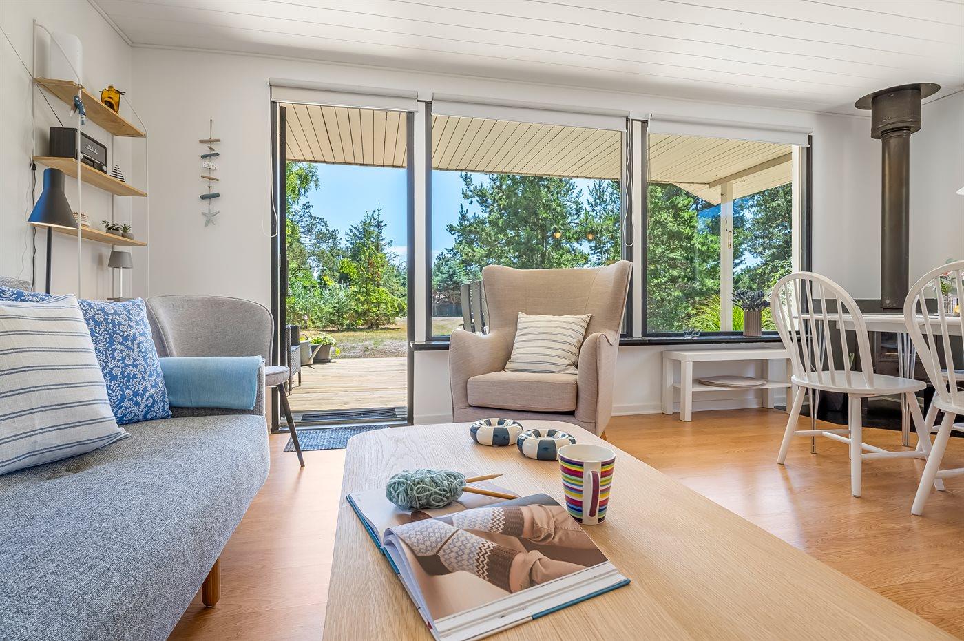 Dette funktionelt og lyst indrettede træhus byder på en åben atmosfære og hyggelige detaljer. Stuen er indrettet med hyggeligt møblement og store vinduer ved sofahjørnet, der sørger for et godt lysindfald. I godt vejr kan I slappe af på de komfortable havemøbler og nyde lækre retter fra grillen på den åbne og delvist overdækkede terrasse.