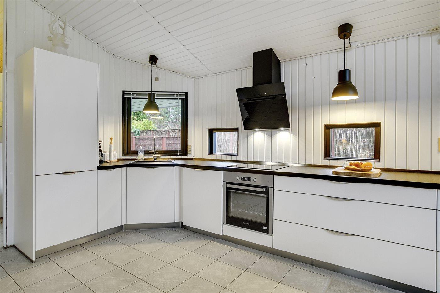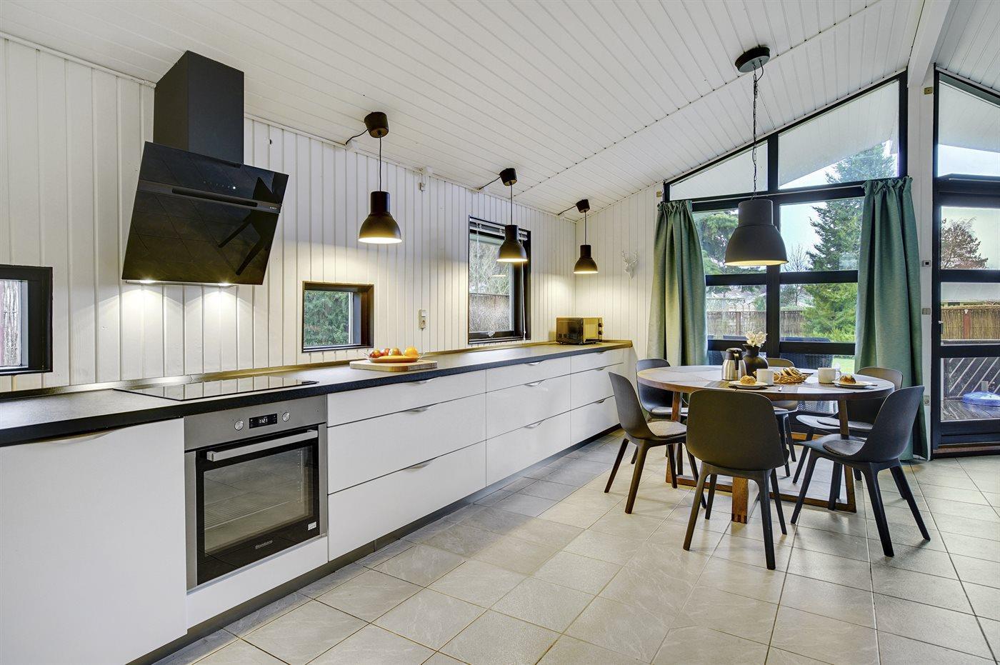 Køkkenet er udstyret med 1 køleskab. Der er 4 elkogeplader, bageovn, mikrobølgeovn samt opvaskemaskine Der er gulvvarme i køkkenet.