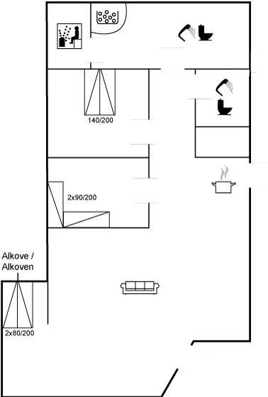 Der er i alt 2 soveværelser. Sovepladserne fordeler sig på: 2 sovepladser i dobbeltseng. 2 sovepladser i enkeltsenge. 2 sovepladser på madrasser. 2 sovepladser i alkove. 2 af disse sovepladser befinder sig i opholdsstuen og 2 af dem befinder sig på hemsen. Derudover er der 1 stk. barneseng.