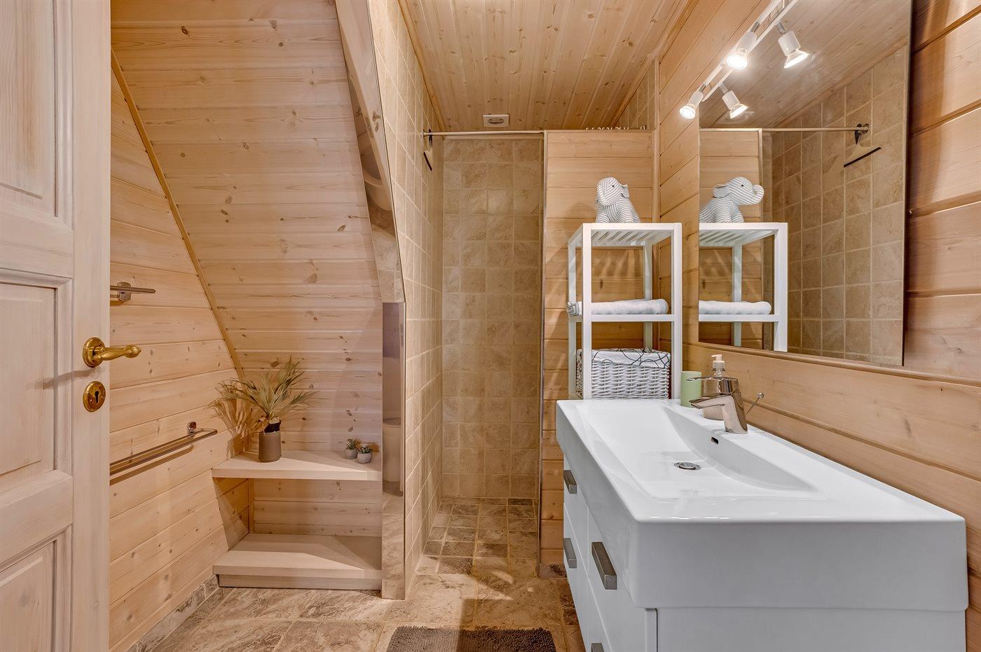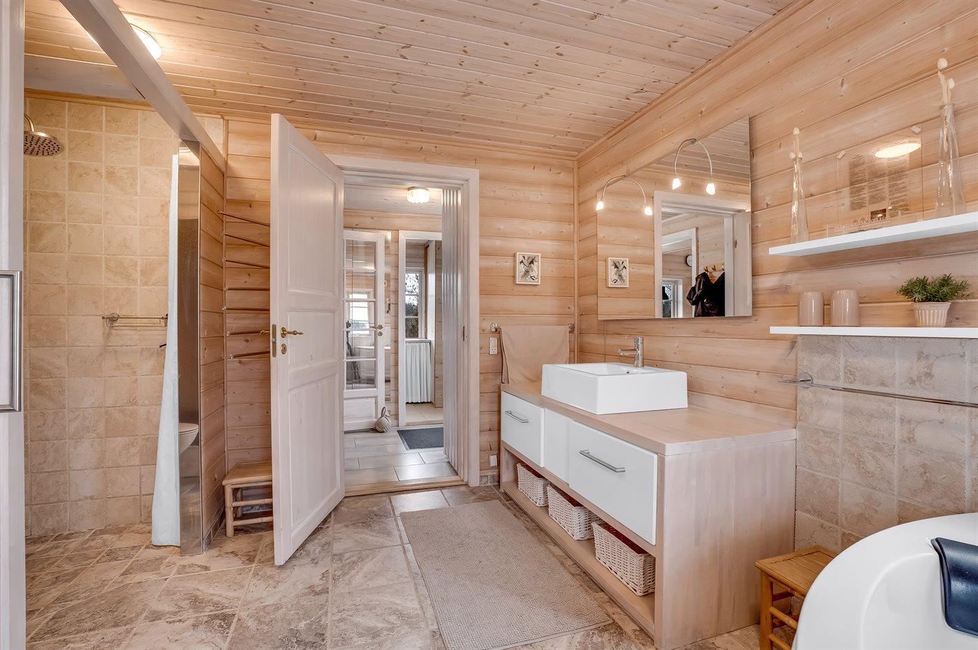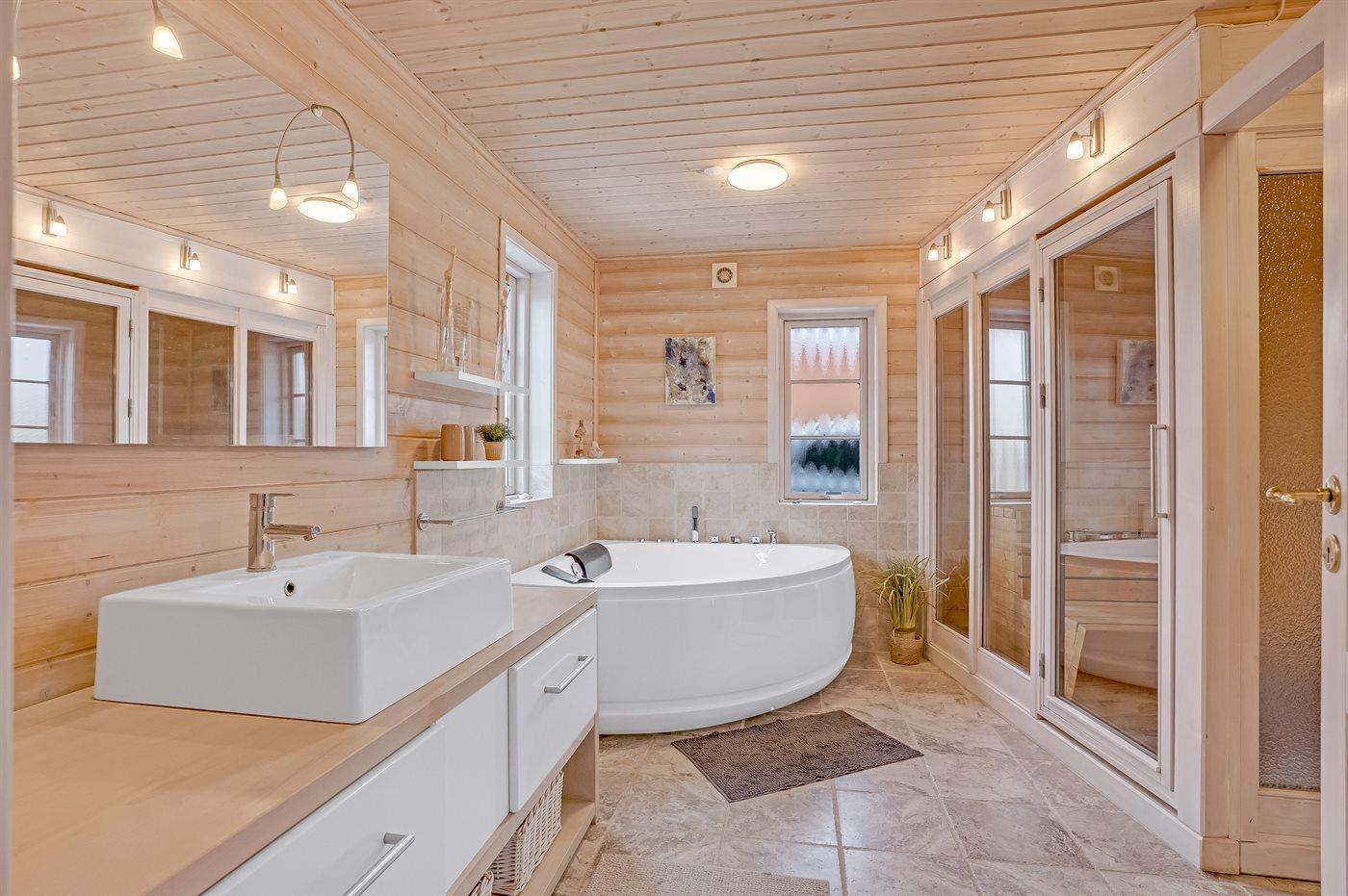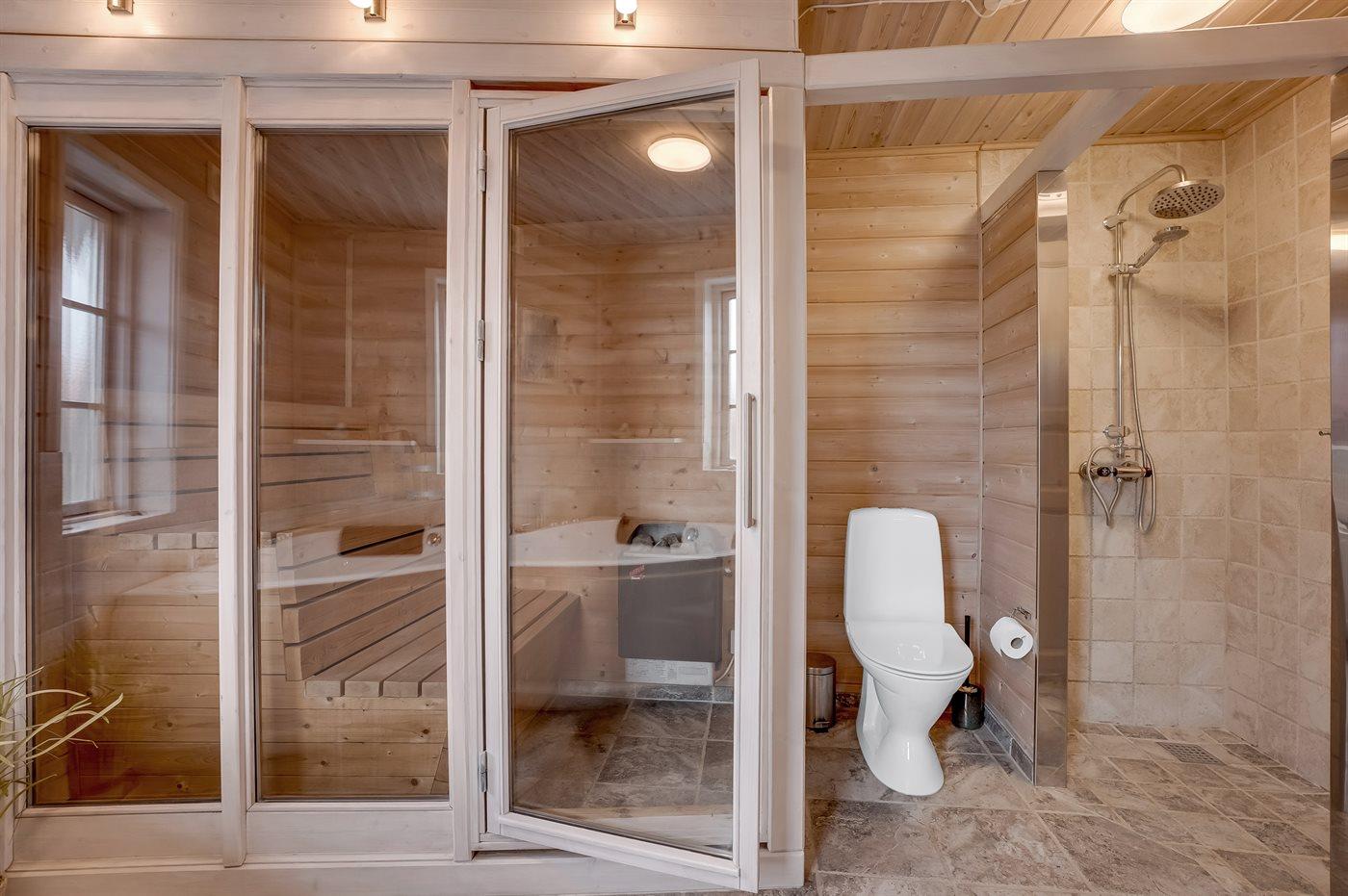 Der er 2 badeværelser med bruseniche og 2 toiletter. Der er gulvvarme på 1 badeværelse. I saunaen er der mulighed for afslapning.