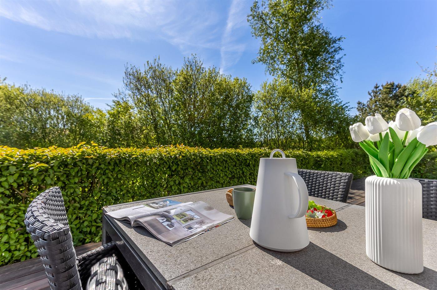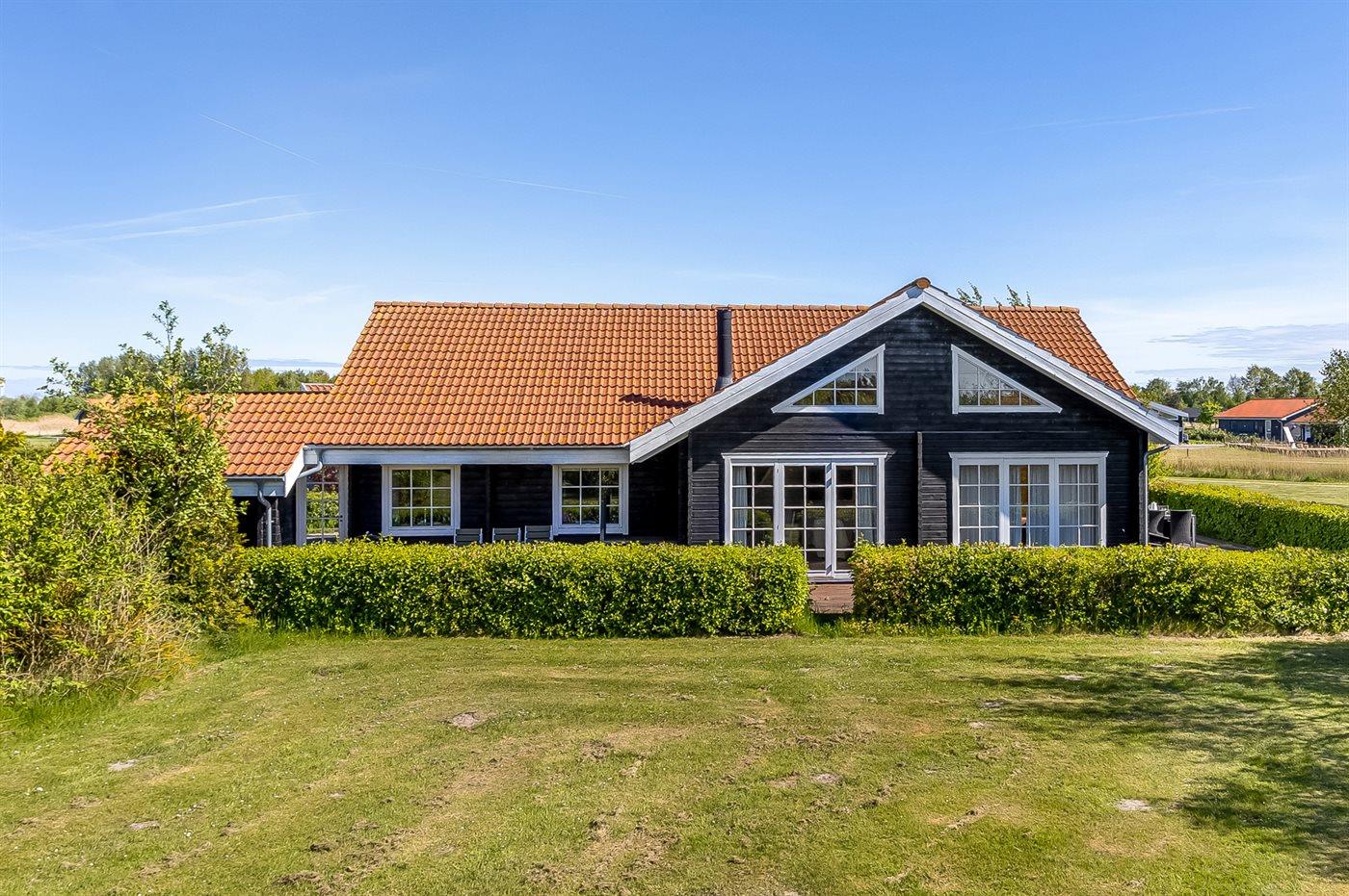 Arkitekttegnet træhus i Marielyst med stor have, sauna, spa og billard i aktivitetsrum.