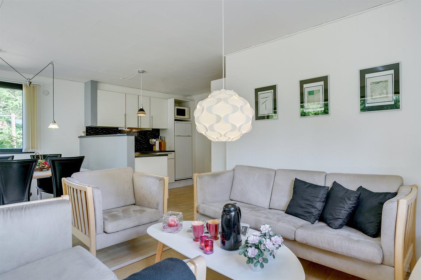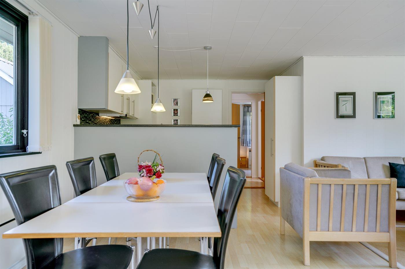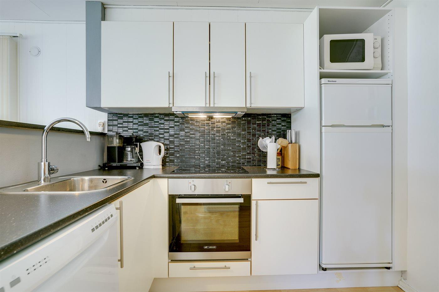 Køkkenet er udstyret med 1 køleskab. Der er 4 keramiske kogeplader, varmluftovn, mikrobølgeovn samt opvaskemaskine.
