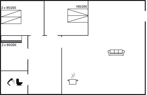 Der er i alt 3 soveværelser. Sovepladserne fordeler sig på: 4 sovepladser i dobbeltsenge. 2 sovepladser i køjeseng. Derudover er der 1 stk. barneseng.