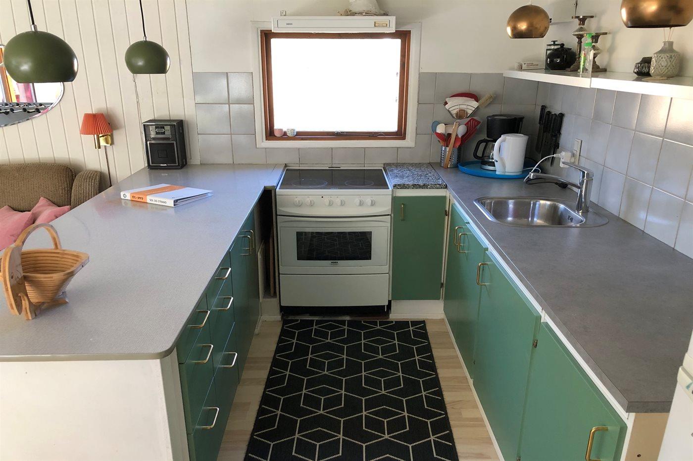 Køkkenet er udstyret med 1 køleskab. Der er 4 keramiske kogeplader, varmluftovn, mikrobølgeovn.