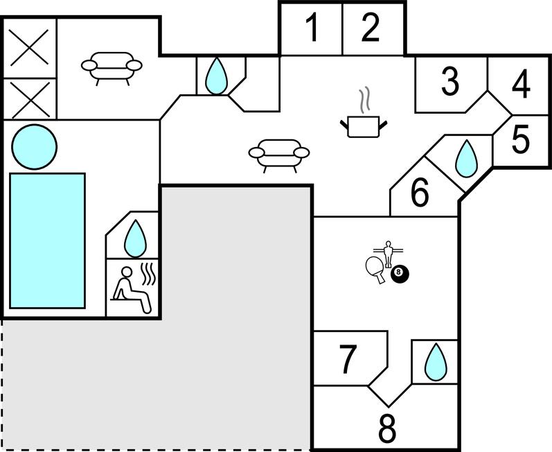 Dette rummelige sommerhus byder både plads og komfort til flere familier eller en større rejsegruppe. I de gode soveværelser og på de to hemse finder I mange, hyggelige sovepladser. De to hemse er skønne steder at trække sig tilbage, særligt for de unge gæster, der her kan spille Playstation, se film og hygge i de store puder. Husets hjerte er det store køkken-alrum, hvor I kan hygge jer og være sammen om madlavning, måltider, brætspil og meget mere. Brændeovnen bidrager med ekstra hygge og varme i vintermånederne. Børn og barnlige sjæle kan få mange timer til at gå i aktivitetsrummet med billard, airhockey, bordtennis, bordfodbold og bræt- og puslespil. Tilbring mange skønne timer sammen i opholdsstuen med et bararrangement. Her kan man trække sig ind og nyde en rolig stund, mens andre forbereder maden eller spiller billard eller bordtennis. Det er den perfekte seniorstue. Badeglade feriegæster vil elske poolområdet, hvor man kan svømme, lege og rutsje. Er man mere til velvære og afslapning, kan man nyde en stille stund i spabadet og saunaen.