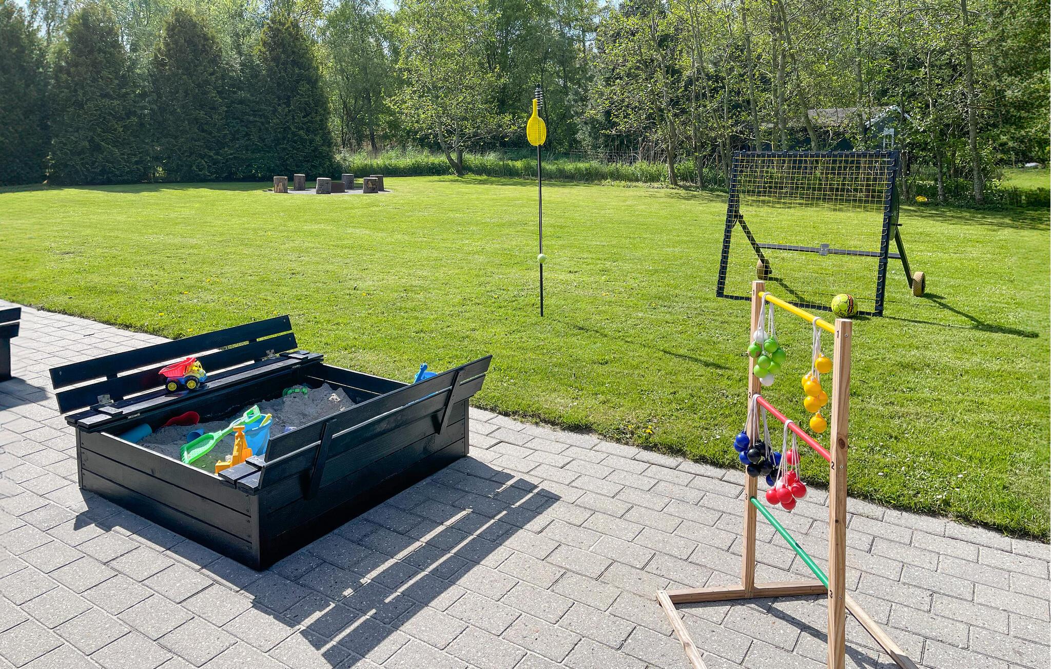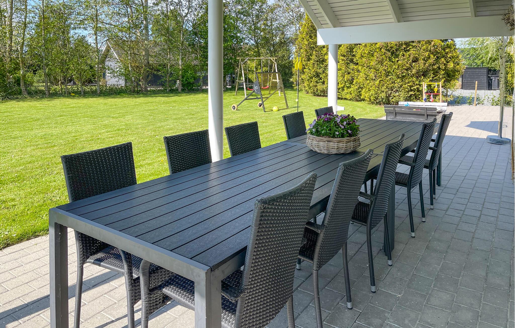 Udendørs finder I en stor terrasse, med havemøbler nok til alle, så I let kan nyde feriens måltider ude i den friske luft. Den store grund er indhegnet og tilbyder blandt andet gynge og sandkasse, som familiens yngste vil elske. Det er også et fint sted til en ferie med hunde.