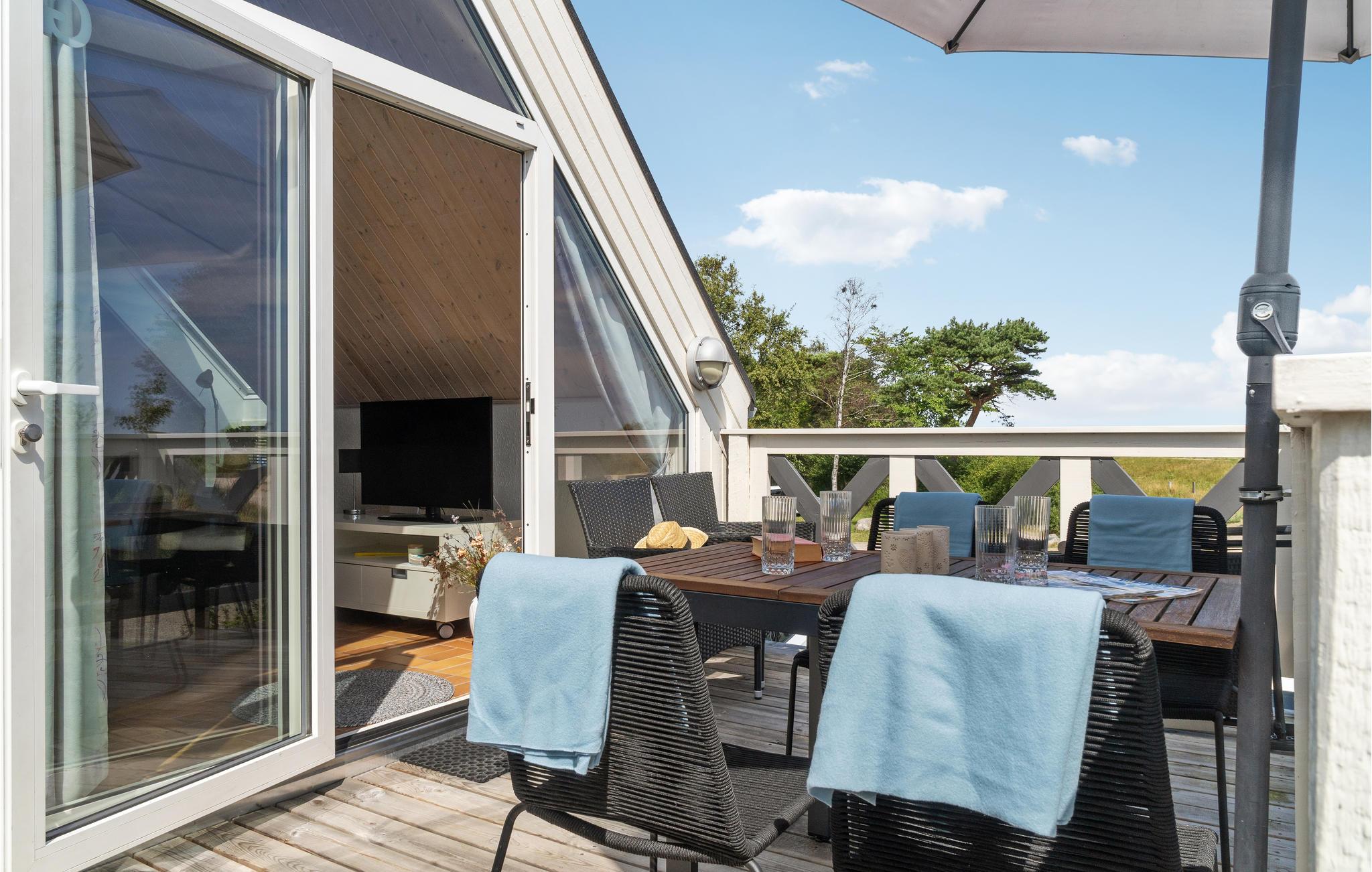 Drømmer I også om en ferie lige ved stranden, blot få skridt fra vandet? Så har I her fundet lige den rette feriebolig. Denne dejlige ferielejlighed ligger på første sal og byder på en lys og indbydende indretning med alt, hvad I har brug for på en afslappende ferie. Størrelsen gør den ideel til par eller familier. I køkkenet kan I fremtrylle lækre retter og på dage med godt vejr nyde dem udenfor på terrassen. Her kan I også sidde under parasollen med en god bog eller med en kold forfriskning i hånden kigge ned på børnene, der leger på plænen.
