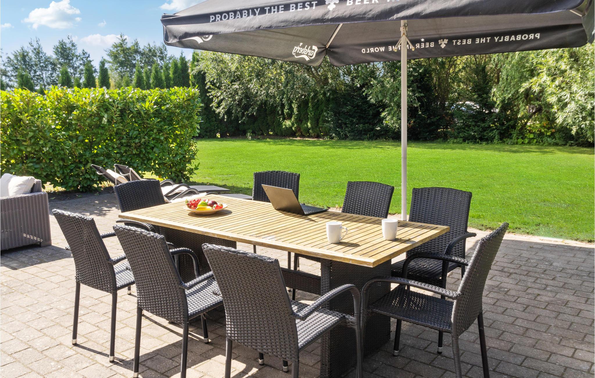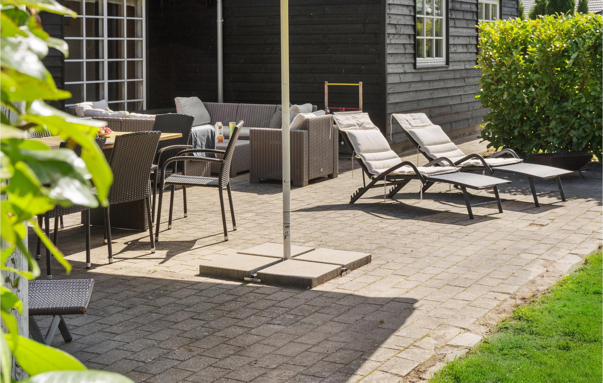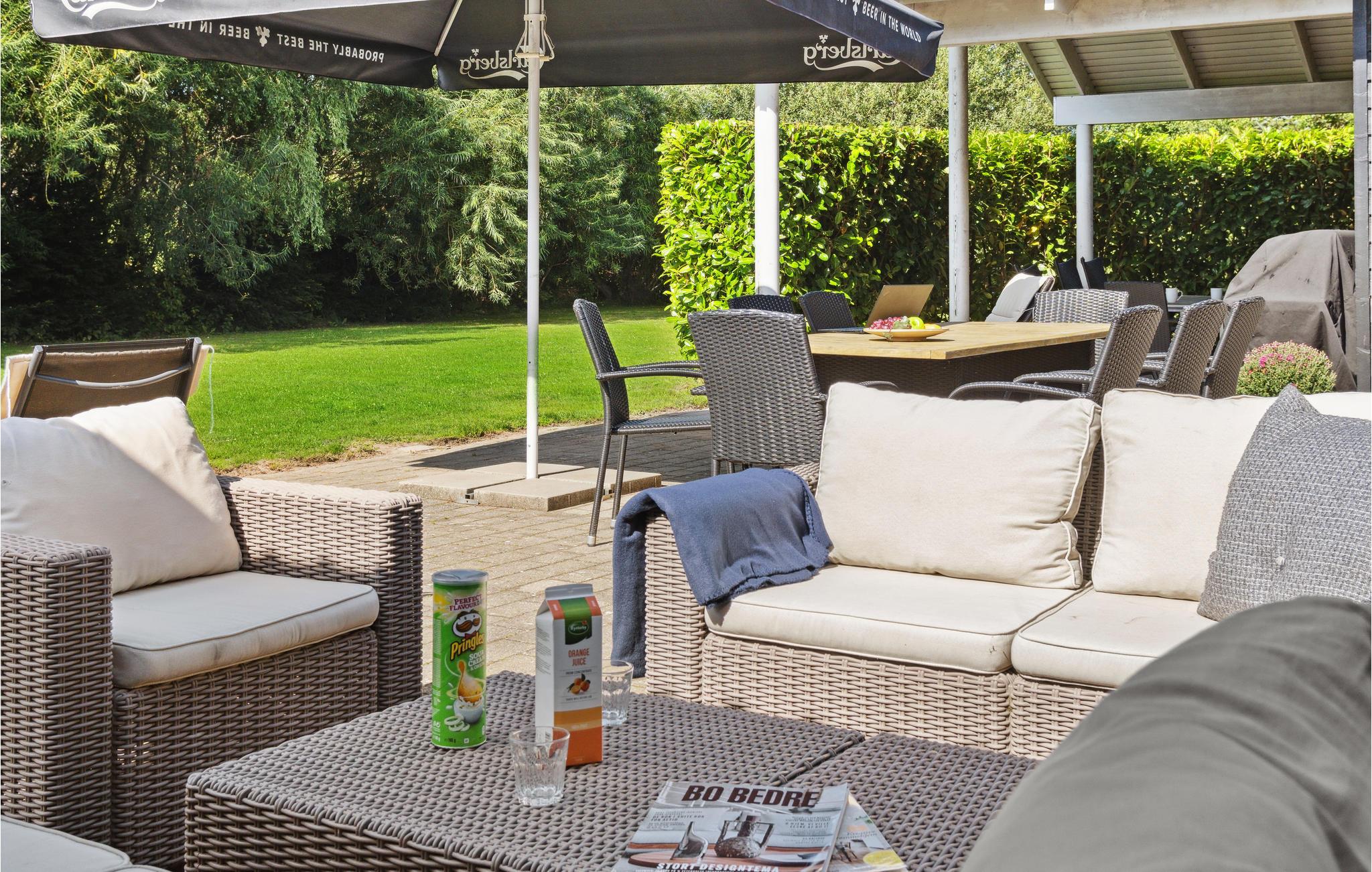 Fra stuen og køkkenet er der direkte adgang til den store sydvestvendte terrasse, hvor I kan nyde en stund i solen eller sætte jer med en bog i skyggen. Derudover har huset en stor overdækket sydvendt terrasse, som er omkranset af stedsegrønne træer. Her sidder man rigtig godt på de lange sommeraftener, så dæk op til den store grillmiddag her og find tæpperne frem, når mørket falder på. Haven er stor og med masser af plads til, at børnene kan løbe og lege.