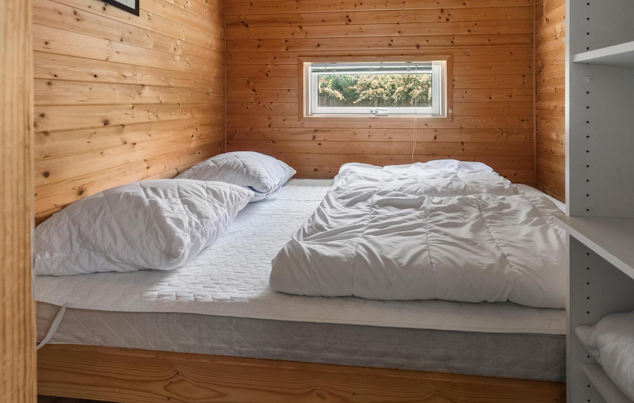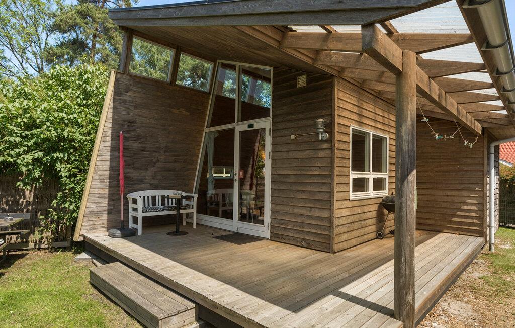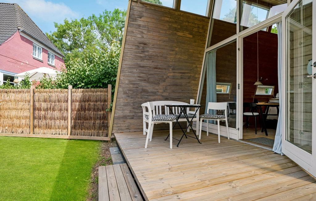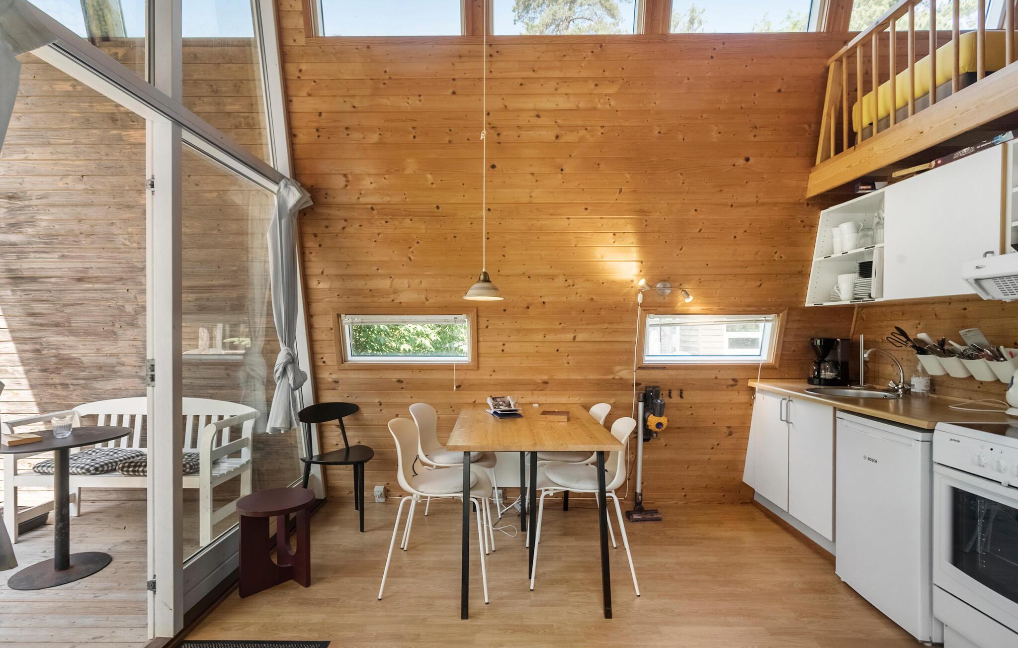 I det attraktive ferieområde Marienlyst finder I dette originalt indrettede feriehus. Det praktisk indrettede interiør er kendetegnet ved de mange træelementer og fremstår åbent og indbydende. De store vinduespartier og ovenlysvinduerne sørger selv på overskyede dage for et godt lysindfald i opholdsrummet og skaber en behagelig atmosfære. Nyd godt af hemsen, som tilbyder to hyggelige sovepladser og giver et kig ud på træerne og himlen. Dette feriehus er ideelt til en lille familie eller et par, der søger en afslappende ferie.