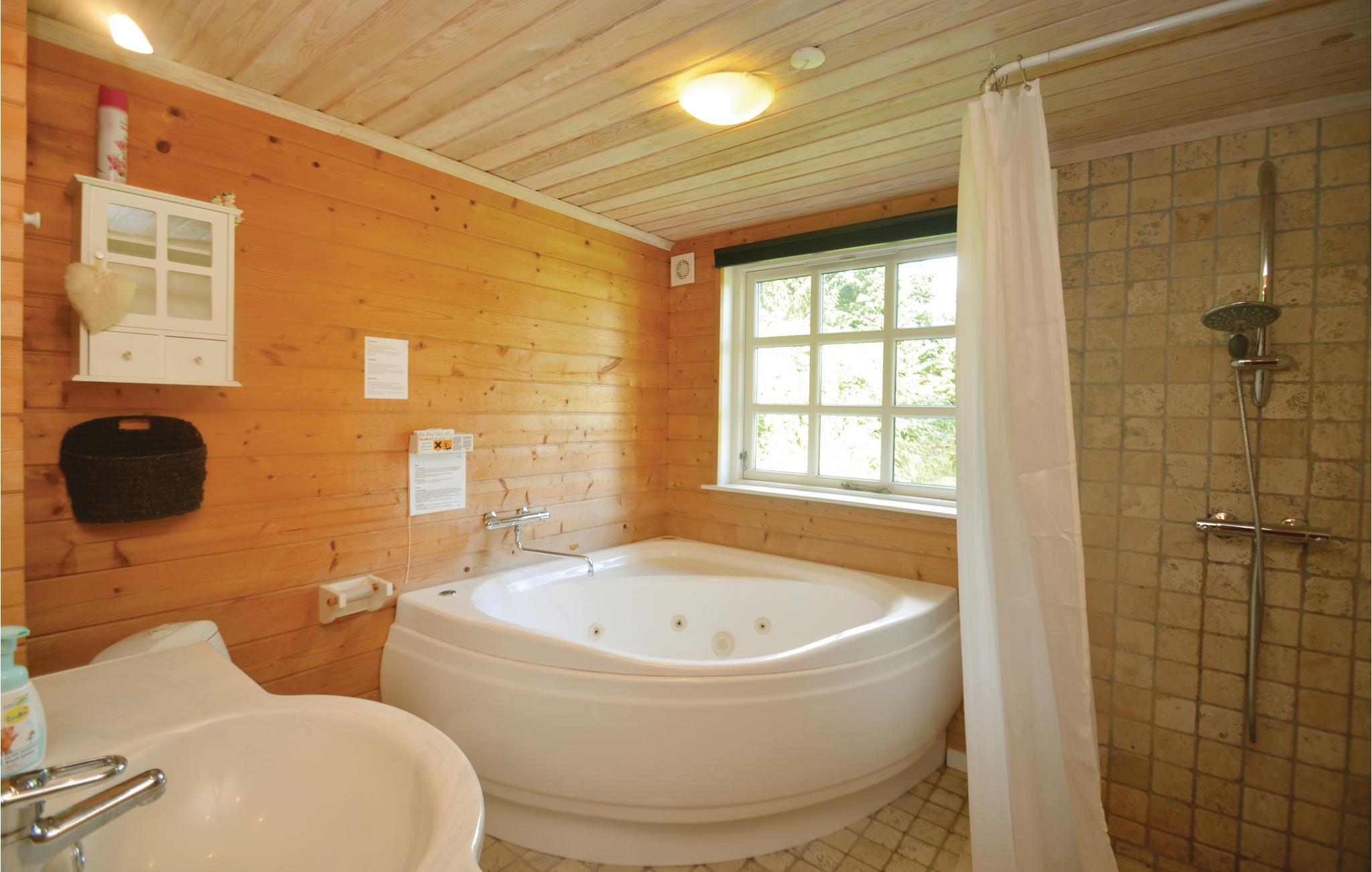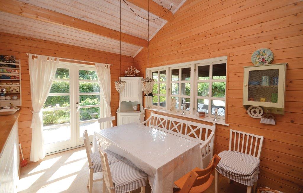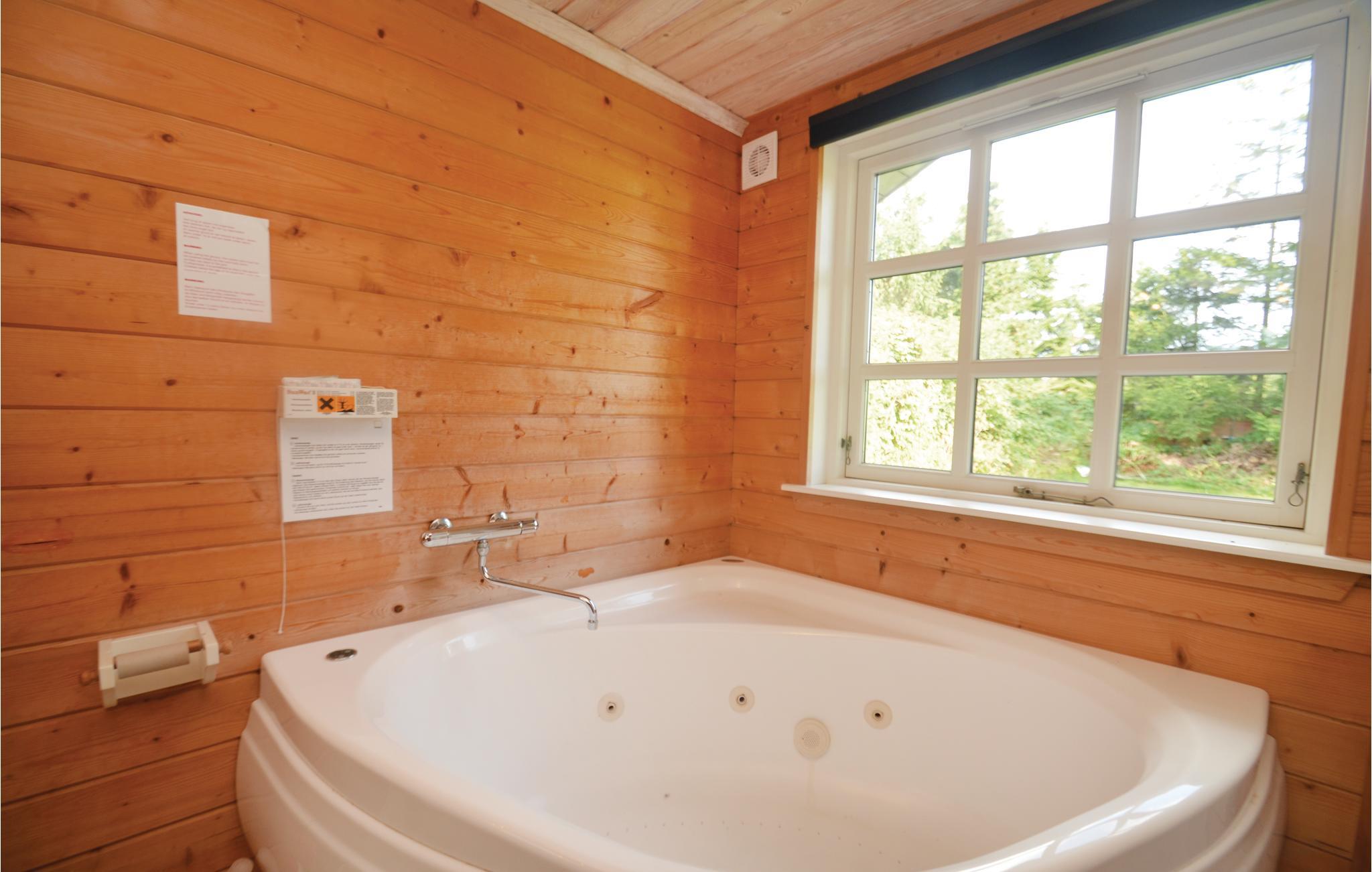 Spændende indrettet bjælkehus med stor, overdækket terrasse. Der er virkelig tale om et gedigent hus, der bærer præg af god kvalitet og gennemført stil ned til mindste detalje. F.eks. er der gulvvarme i hele huset. Alle hårde hvidevarer er en selvfølge i dette hus, hvor der er lagt vægt på, at gæsterne skal forkæles. Derfor skal i samme forbindelse også fremhæves den dejlige spa, hvor I kan nyde et varmt bad efter en aktiv dag i den friske natur. Huset ligger nær indkøb og mange fritidsaktiviteter for hele familien bl.a. har I mulighed for at køre i gokart og spille paintball.