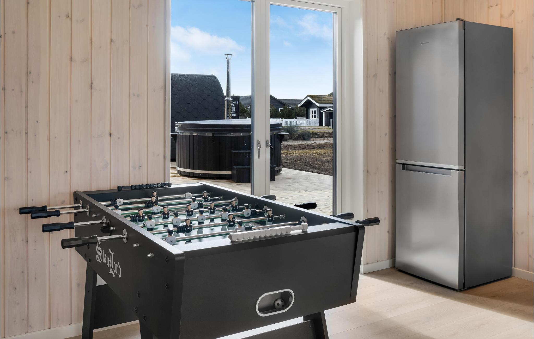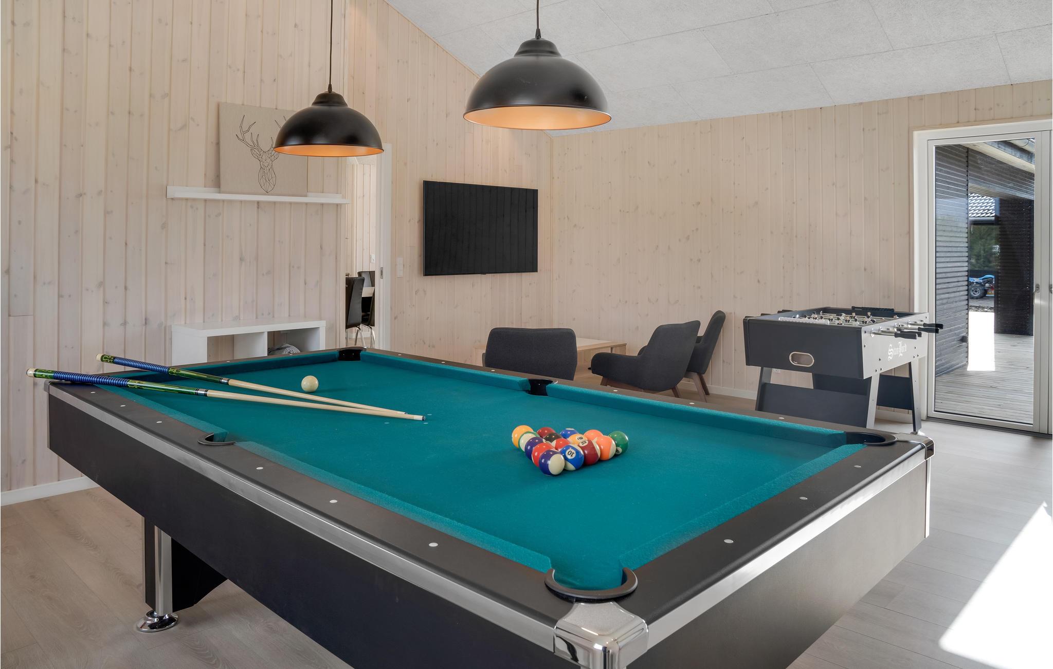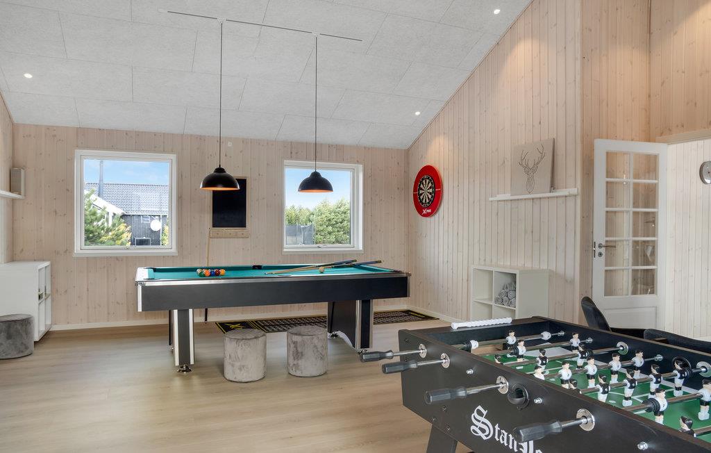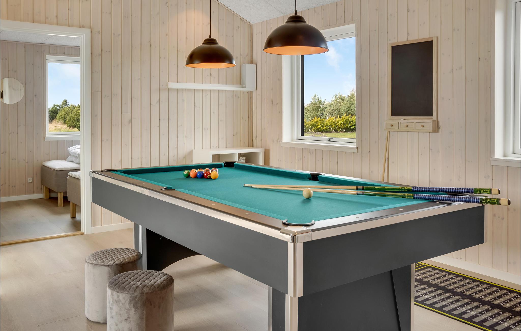 I de lyse værelser i dette komfortable hus kan I slappe af med hele familien i stilfulde omgivelser. Den moderne indretning sikrer en hjemlig atmosfære, mens vinduesfronten sørger for et smukt dagslysindfald i opholds- og spisestuen. Nyd måltiderne sammen ved det lange spisebord og få derefter gang i cirkulationen med et spil billard. Senere kan I sætte jer godt til rette i sofaen, og slappe af efter en skøn dag på stranden eller på udflugt. Rund dagen af med en tur i saunaen, hvor I kan sidde behageligt sammen og komme helt ned i gear. Nyd solen på terrassen, læs en god bog og slap helt af, inden I fremtryller et lækkert måltid på grillen til hele familien.
