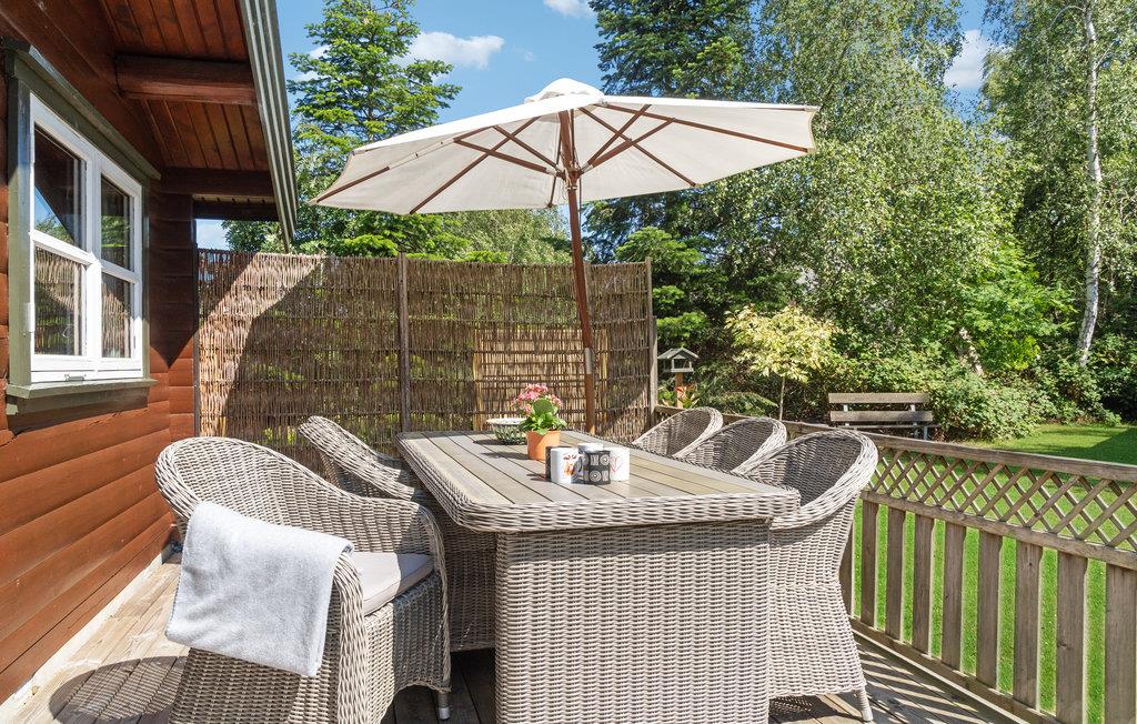 Hyggeligt bjælkehus nær Marielyst strand med terrasse, have og spilleaktiviteter for en afslappende ferie.