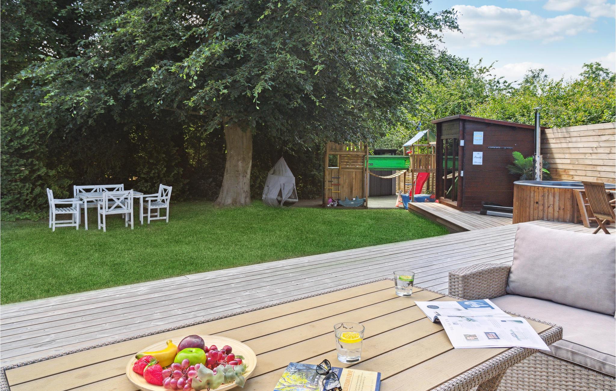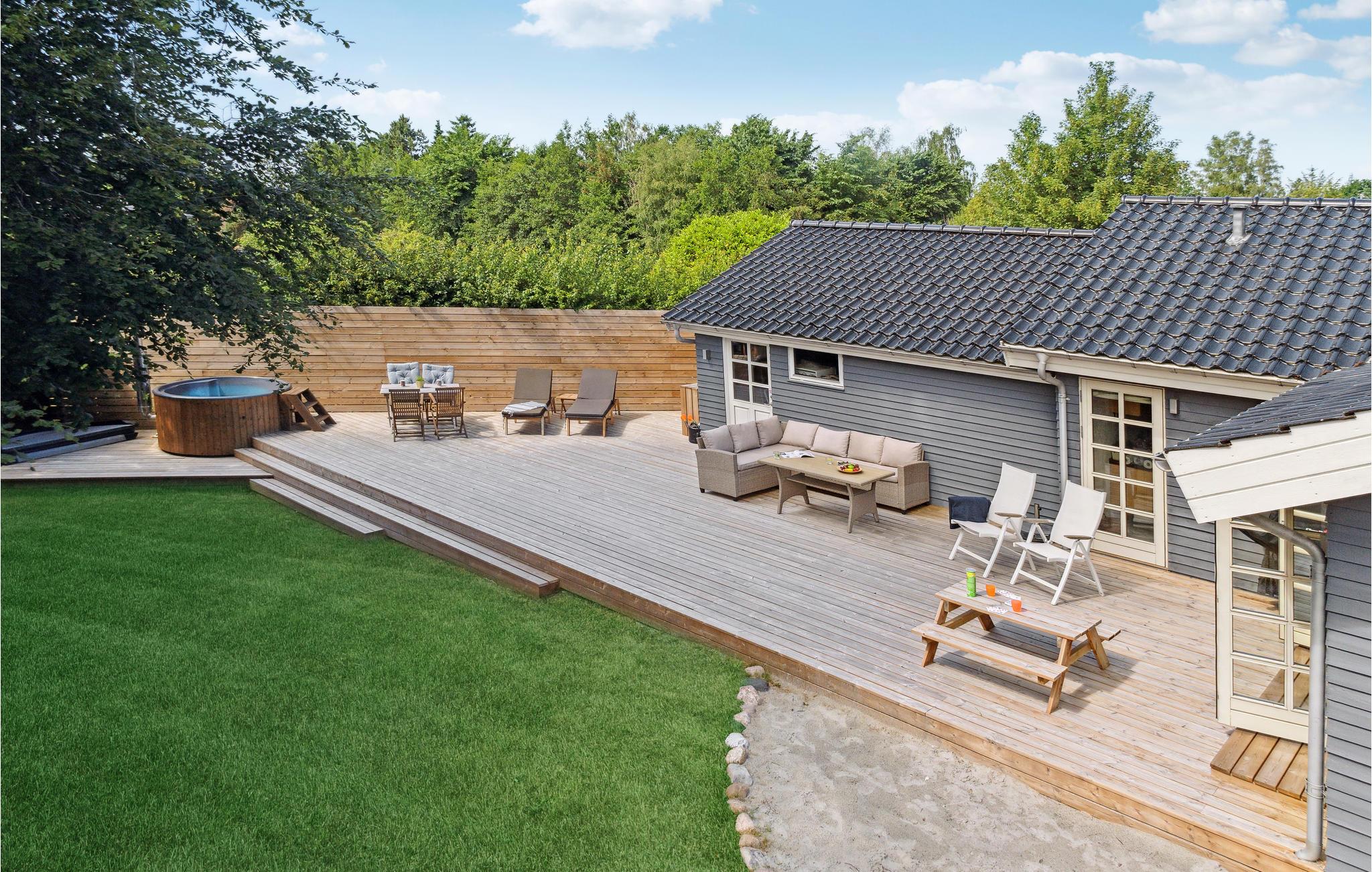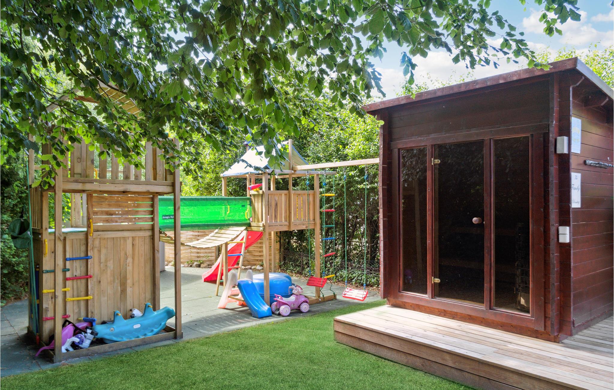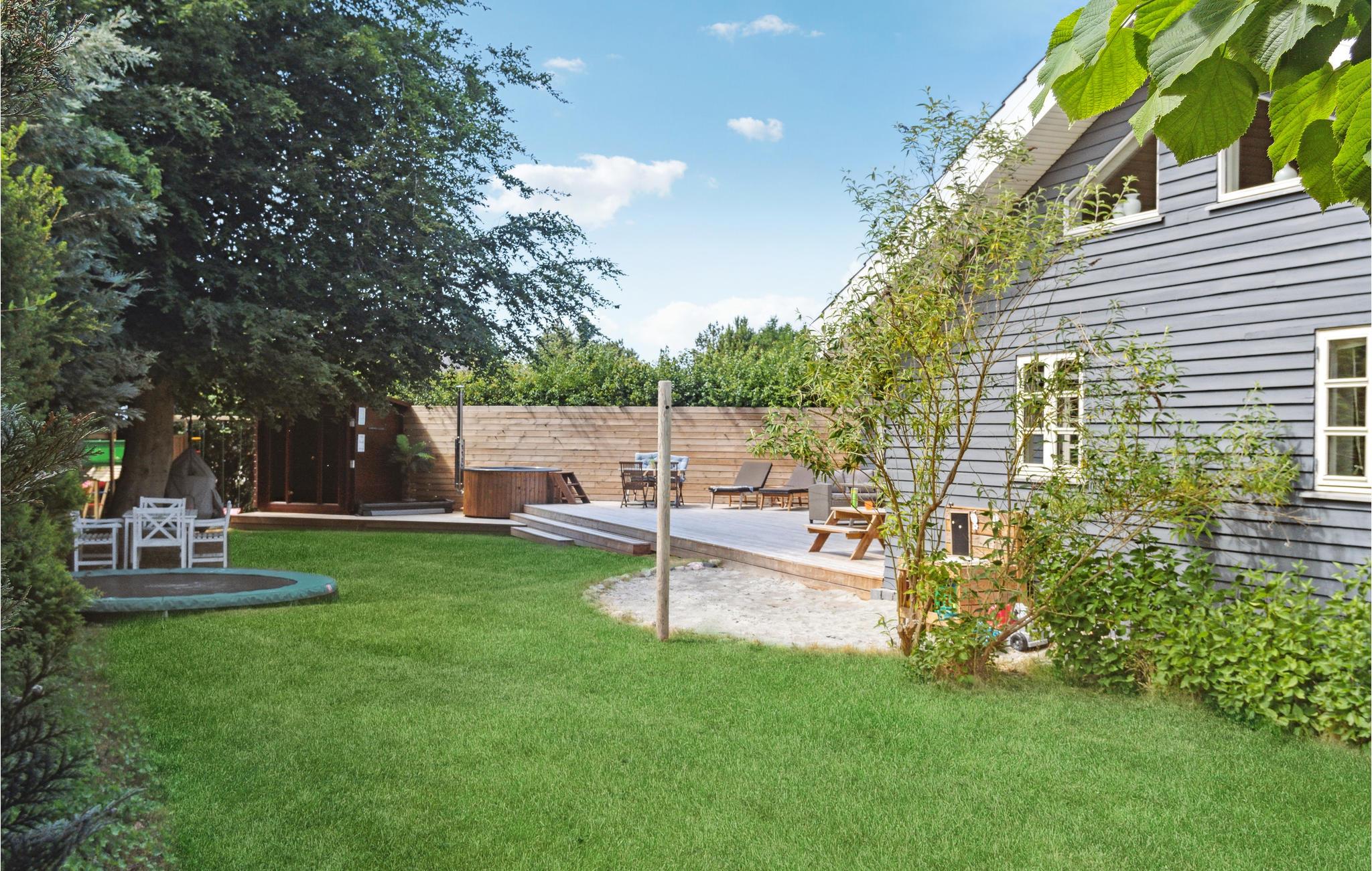 I husets attraktive udendørsområde får alle familiemedlemmer noget for pengene. Nyd solen på terrassen, mens jeres børn løber rundt på ejendommen og ivrigt klatrer, rutsjer og hopper på trampolinen. Server lækker grillmad for hele gruppen og afslut dagen i vildmarksbadet under stjernehimlen.