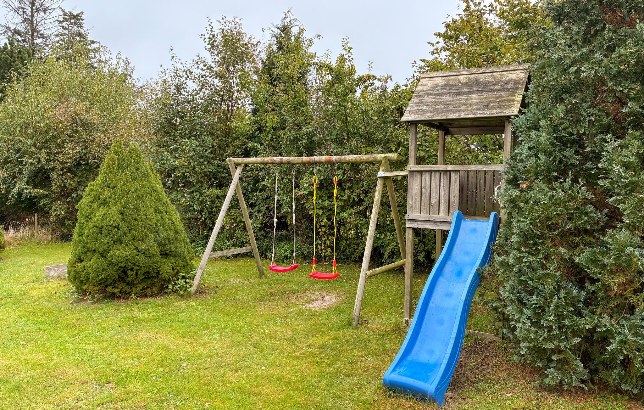 På den overdækkede træterrasse kan I nyde en afslappet morgenmad med kaffe og friske rundstykker om morgenen eller afslutte dagen med en grillmiddag om aftenen. Mens børnene leger i sandkassen, gyngen eller rutsjebanen, kan I nyde den friske luft med en ekstra kop kaffe og en god bog.