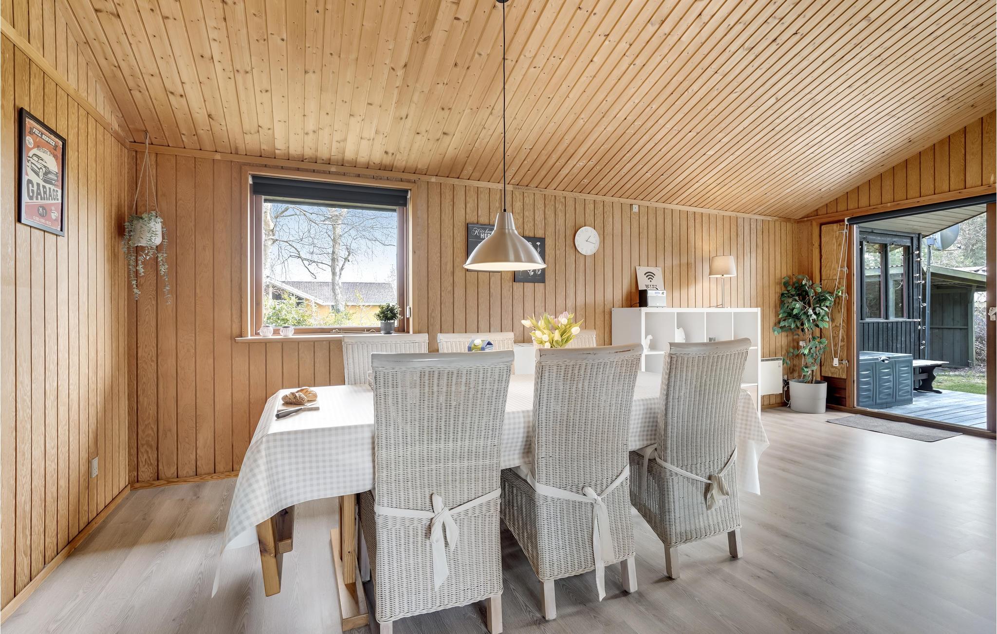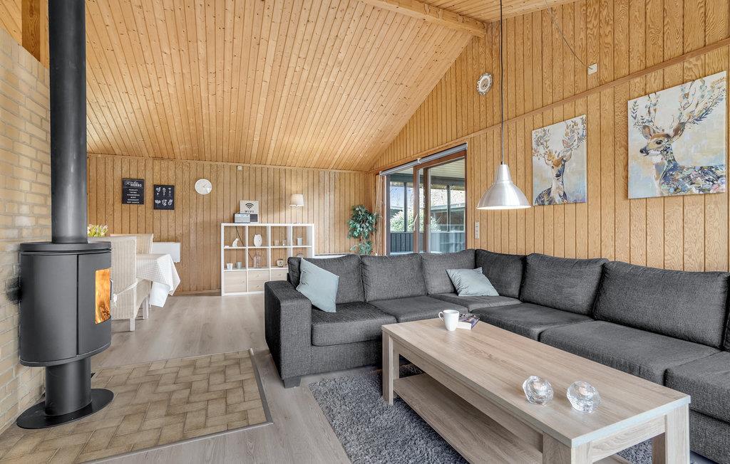 Velkommen til dette charmerende feriehus, der takket være åbent til kip og trævægge, gulve- og lofter har en utroligt hyggelig atmosfære. Husets hjerte er den kombinerede spise- og opholdsstue med brændeovn, TV, store vinduespartier og udgang til den ene terrasse.
