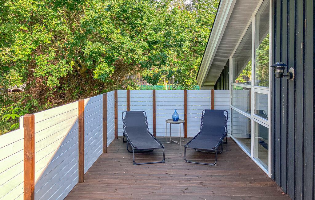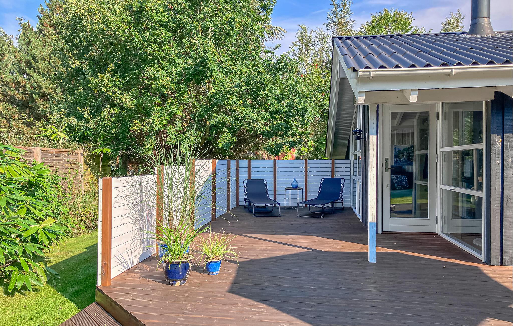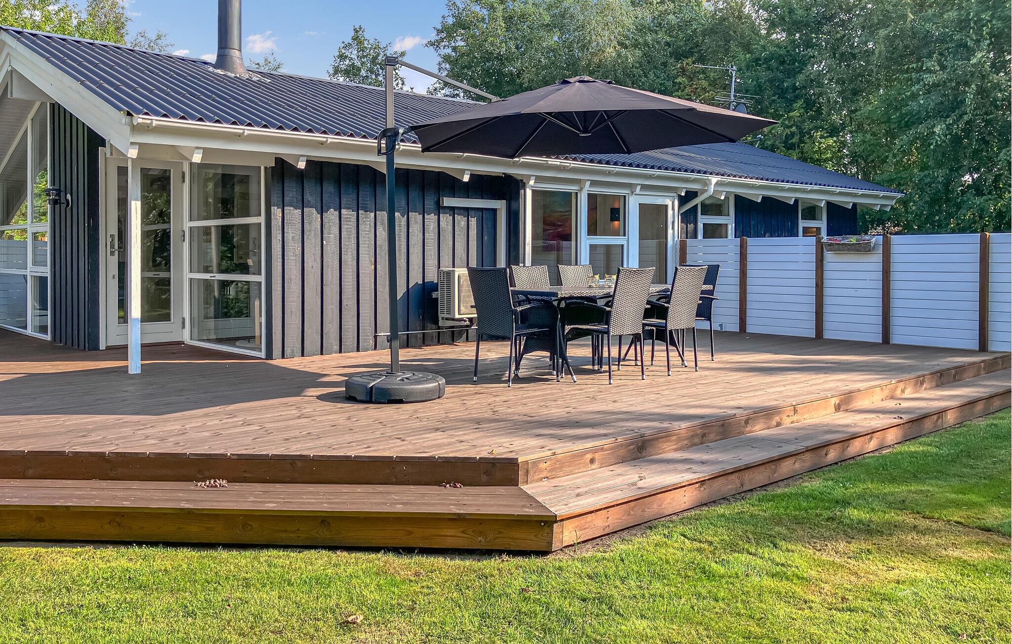 Træd ud på den store træterrasse, som vender ud mod en grøn have. Tag plads under parasollen og nyd måltiderne under åben himmel. Brug liggestolene i det overdækkede område til at læse uforstyrret eller blot slappe af. Den store have lægger op til at leg og hyggestunder.