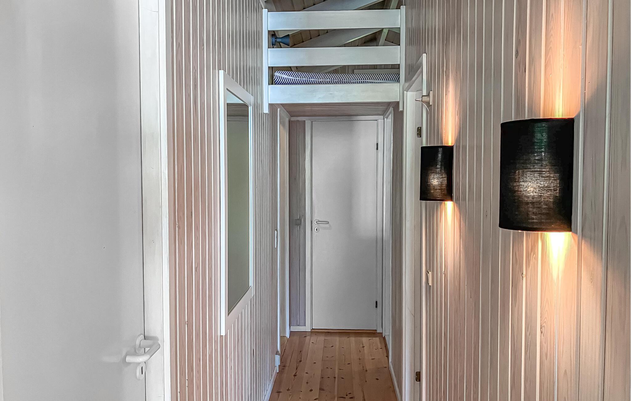 Start jeres ophold med fred og ro. Dette lyse feriehus, bygget med klassisk trækonstruktion, tilbyder de ideelle rammer for en afslappende pause. Nyd varmen fra brændeovnen i den åbne stue og læn jer tilbage på den store hjørnesofa med udsigt til haven. Brug spisebordet til fælles måltider eller spilleaftener og tilbered jeres måltider i det lille, åbne køkken. I kan også se frem til en privat sauna, som lover ren afslapning efter en begivenhedsrig dag.