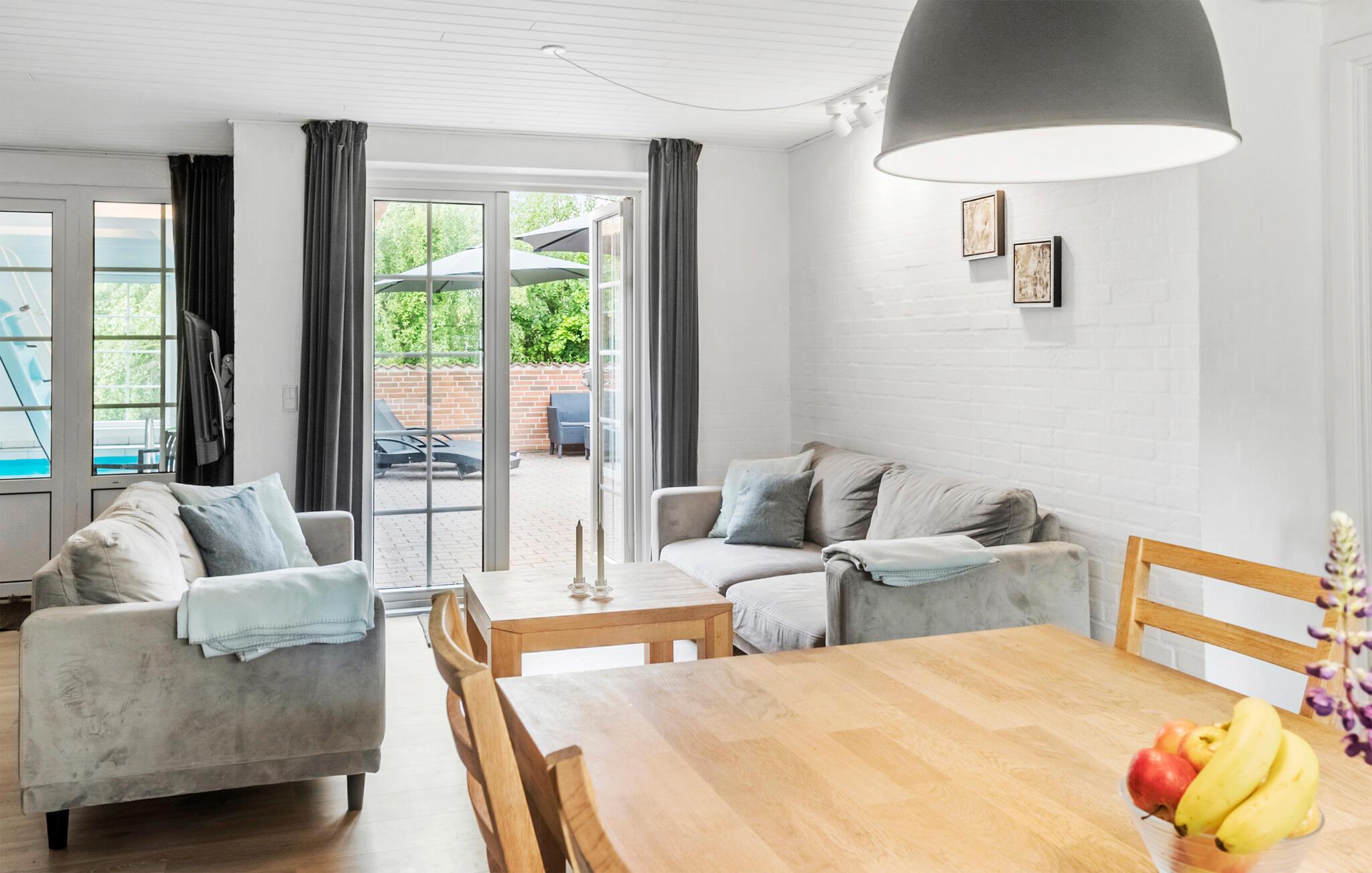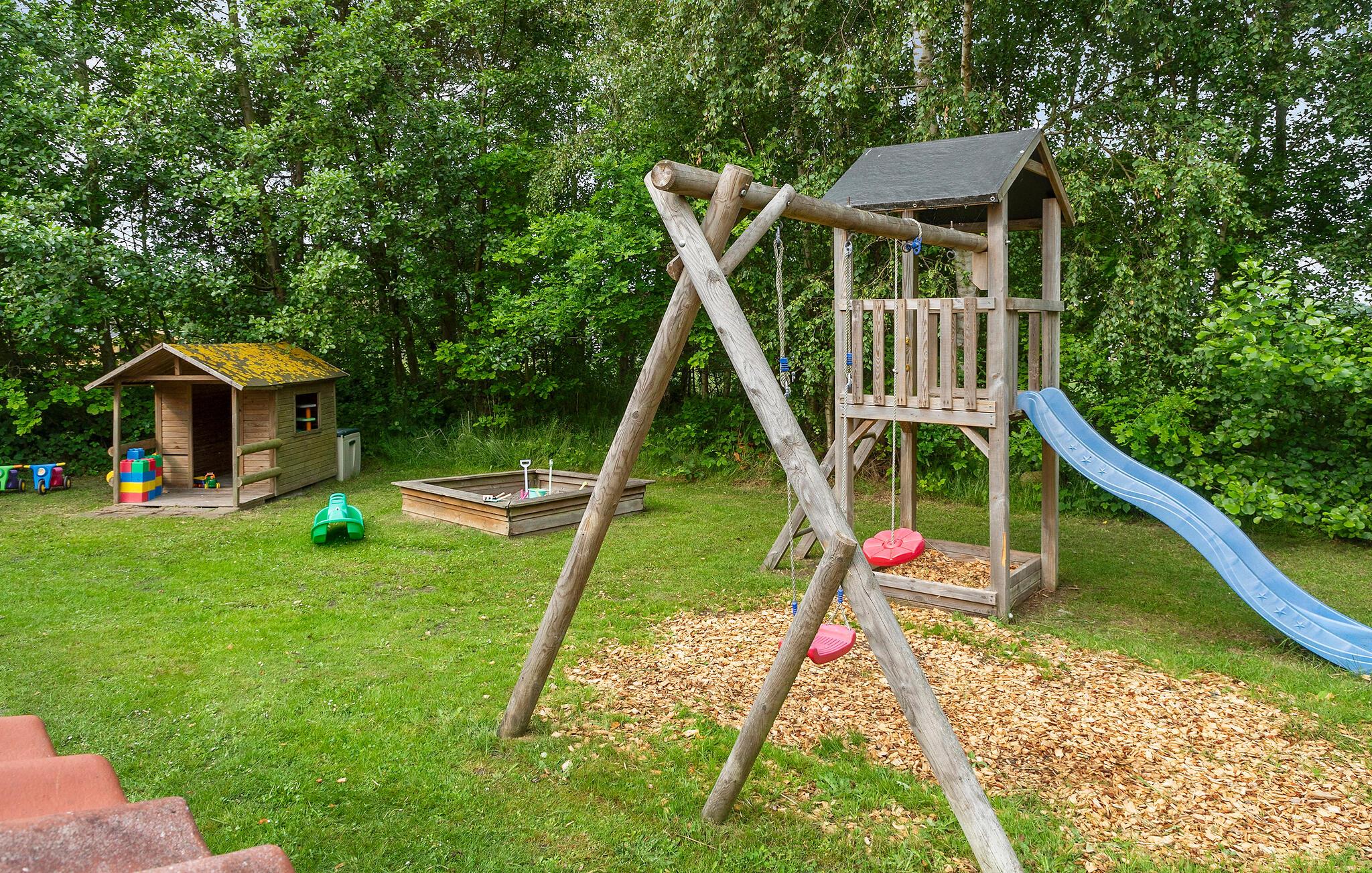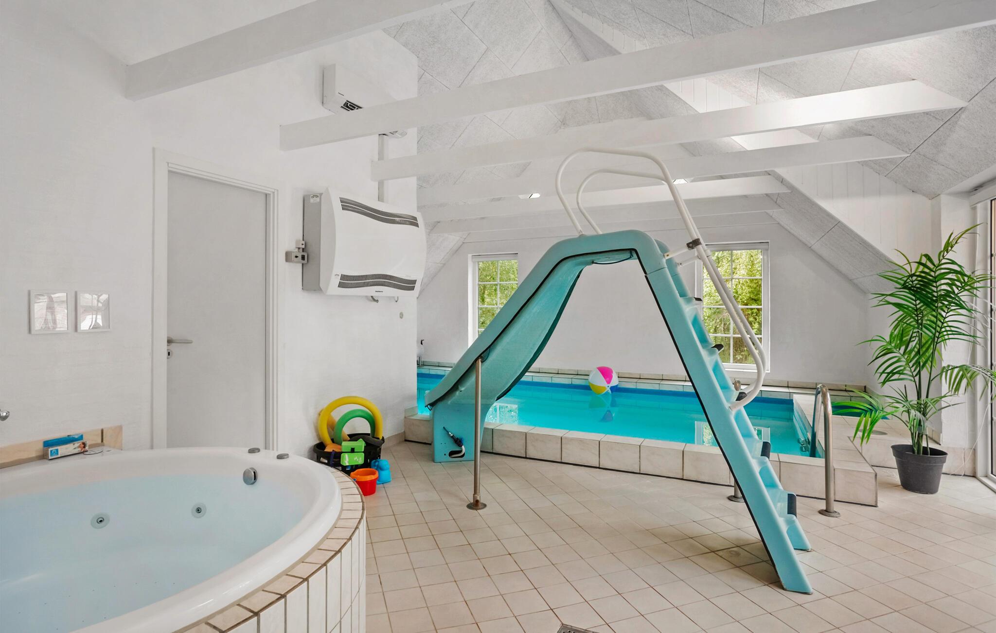 Huset er funktionelt indrettet med god plads til 12 personer. Der er to soveafdelinger med hver tre dobbeltværelser samt et badeværelse. Midt i huset ligger den rummelige stue. I poolafdelingen ligger den 18 m2 store pool, et 4-personers spabad samt endnu et badeværelse; der er gulvvarme i poolrum samt alle badeværelser. I stuen og poolrummet er der installeret varmepumper, som er med til at reducere energiforbruget væsentligt. Hertil kommer et spillerum med Nintendo Wii, 50” TV samt stor TV-pakke. Til huset hører et stort, lukket terrasseareal, hvor I kan solbade i fred og ro, og om aftenen hygge jer med et dejligt måltid tilberedt på grillen. Børnene kan lege i haven, hvor der findes både gynge, sandkasse, fodboldmål og legehus.