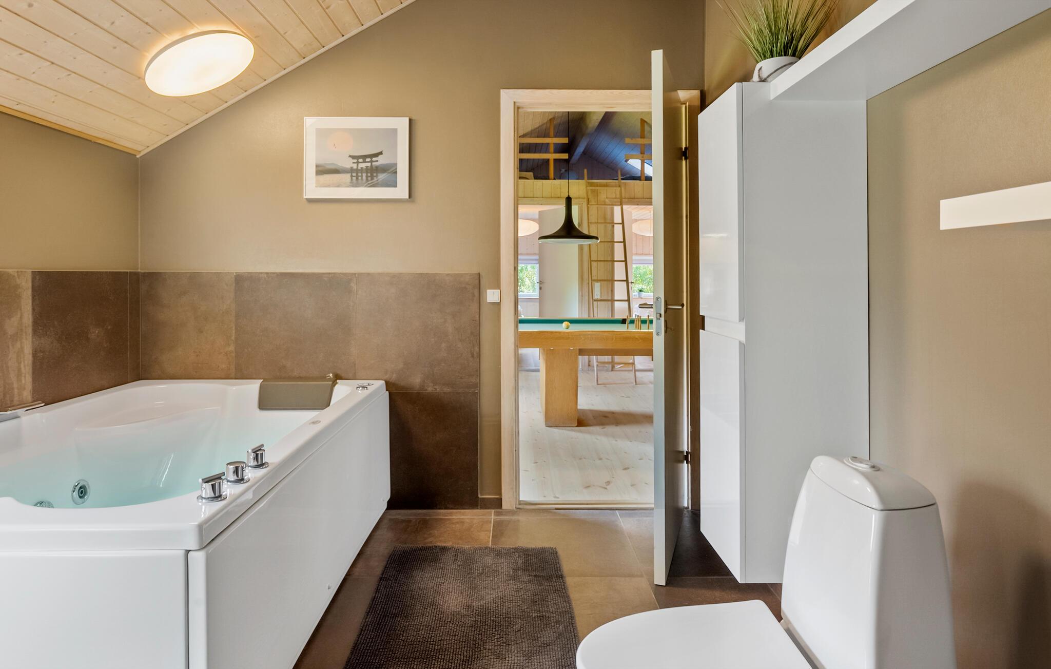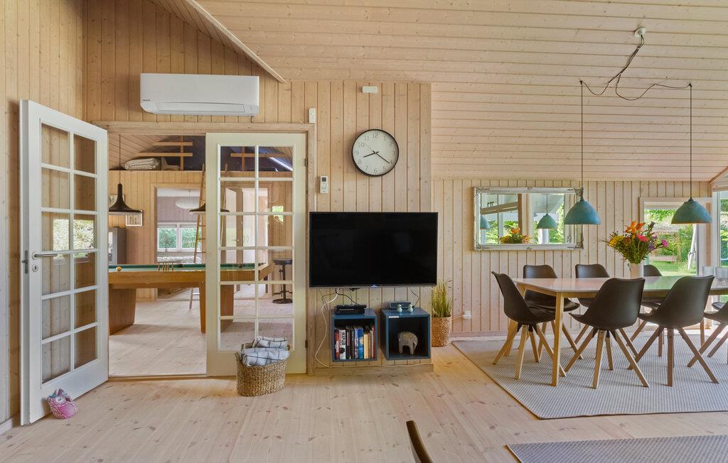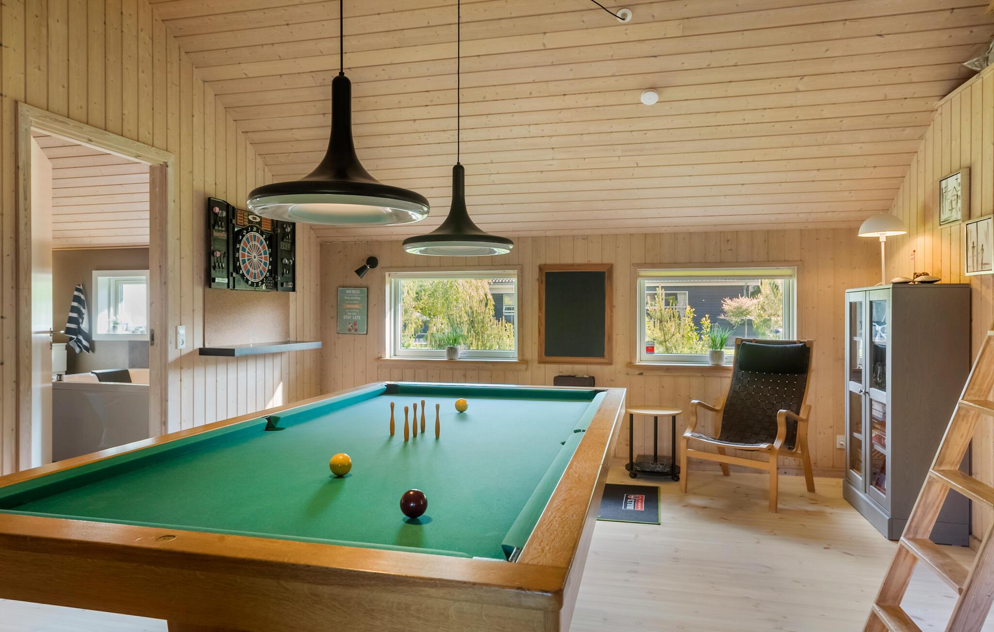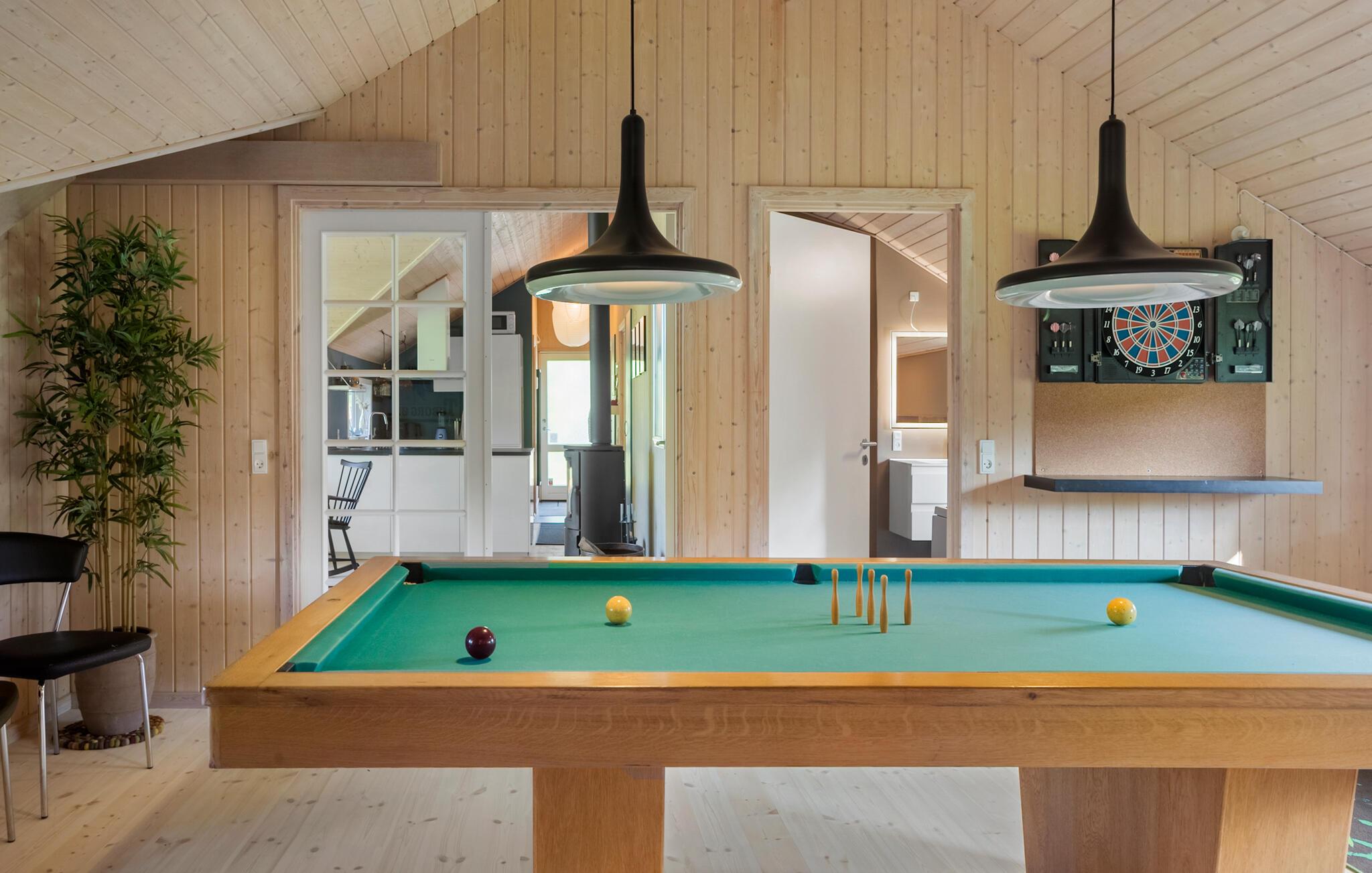 Velkommen til dette veludstyrede feriehus, hvor der venter jer en hyggelig atmosfære og mange faciliteter for både store og små. I finder flere hyggelige sovepladser i soveværelserne og på hemsen. Huset egner sig med sine to flotte badeværelser godt til et ophold for to familier, der ønsker at tilbringe ferien sammen. Den rummelige stue ligger i åben forbindelse med køkkenet og spisestuen, hvorfra I har en fin udsigt til haven. I aktivitetsrummet er der lagt op til mange timers sjov ved poolbordet eller et spil dart.