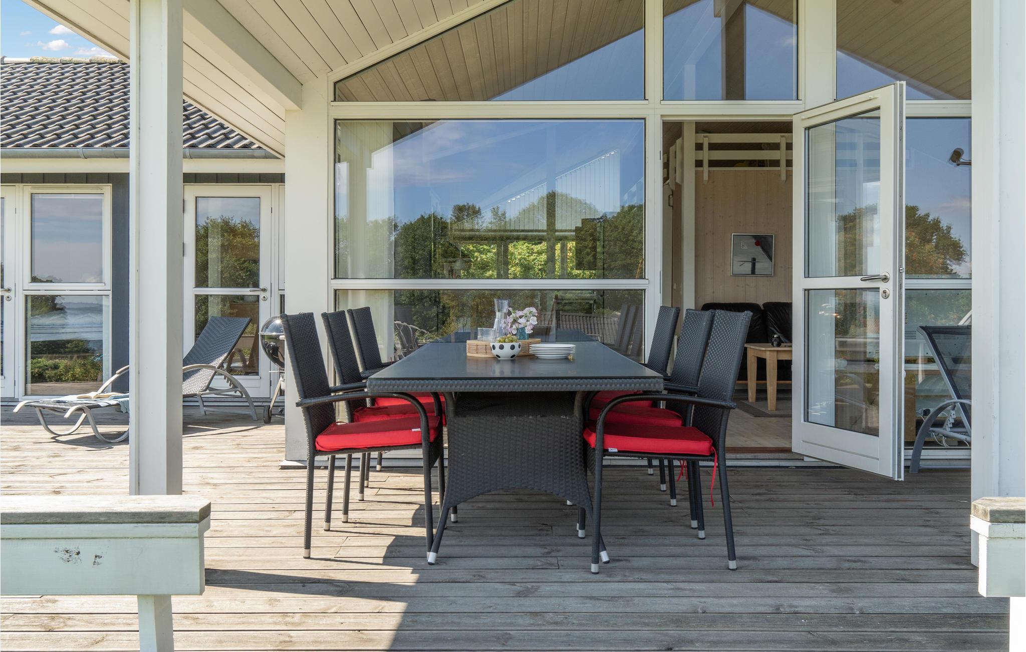 Huset har en god, stor terrasse med flere kroge, så I hele dagen finder en hyggelig plet med læ og solskin. Både indenfor og udenfor kan I nyde den inspirerende udsigt til vandet, som giver luft til sindet og plads til nye tanker.