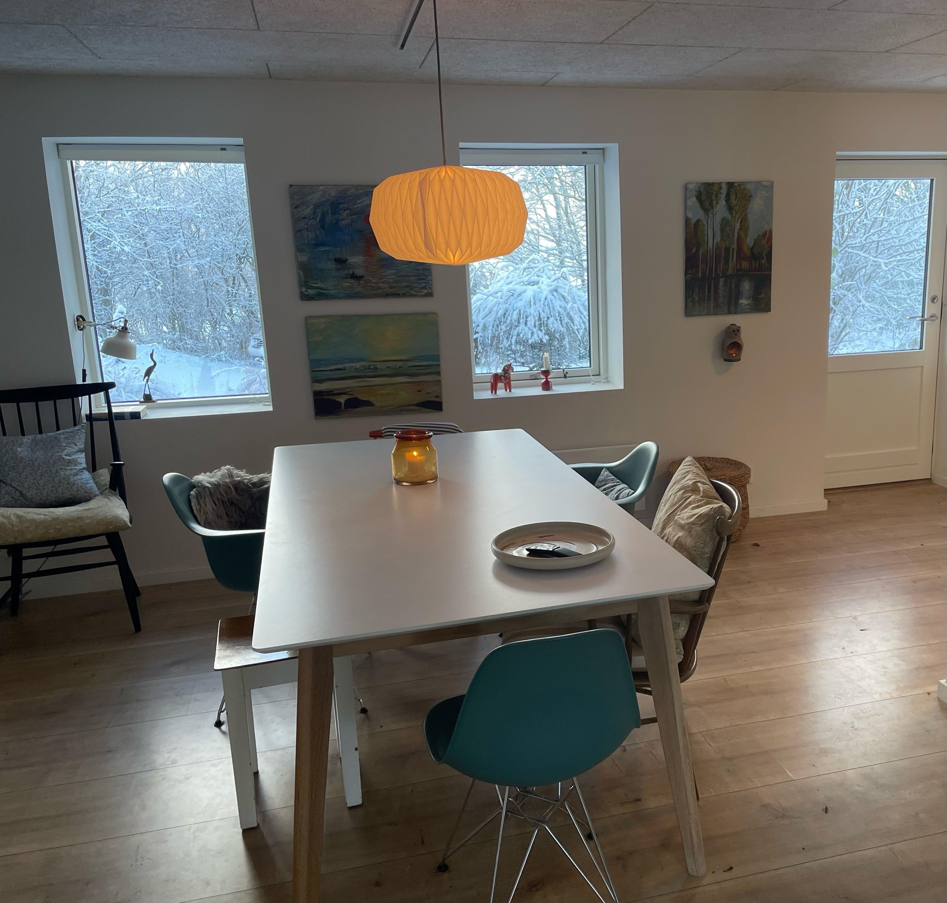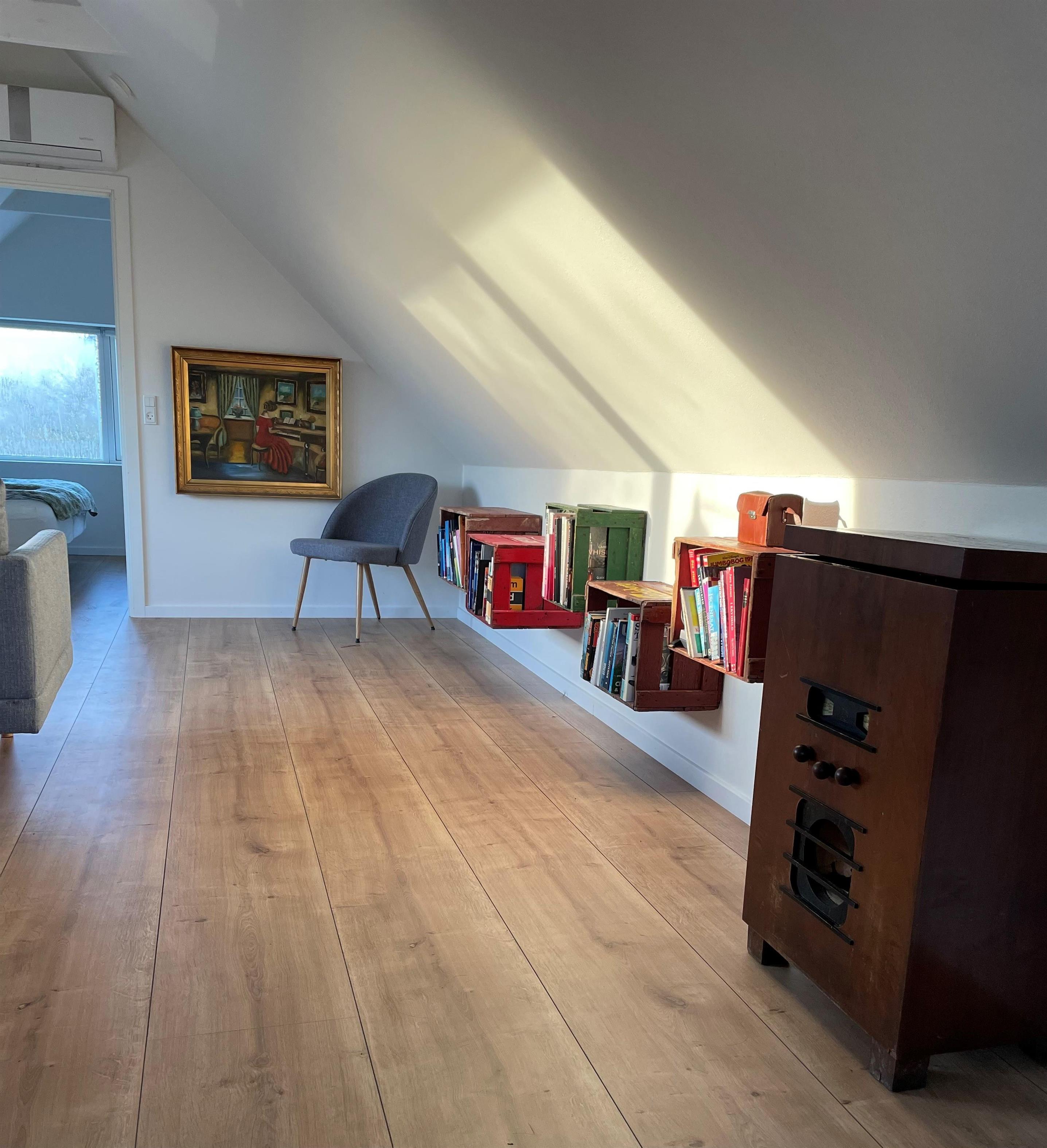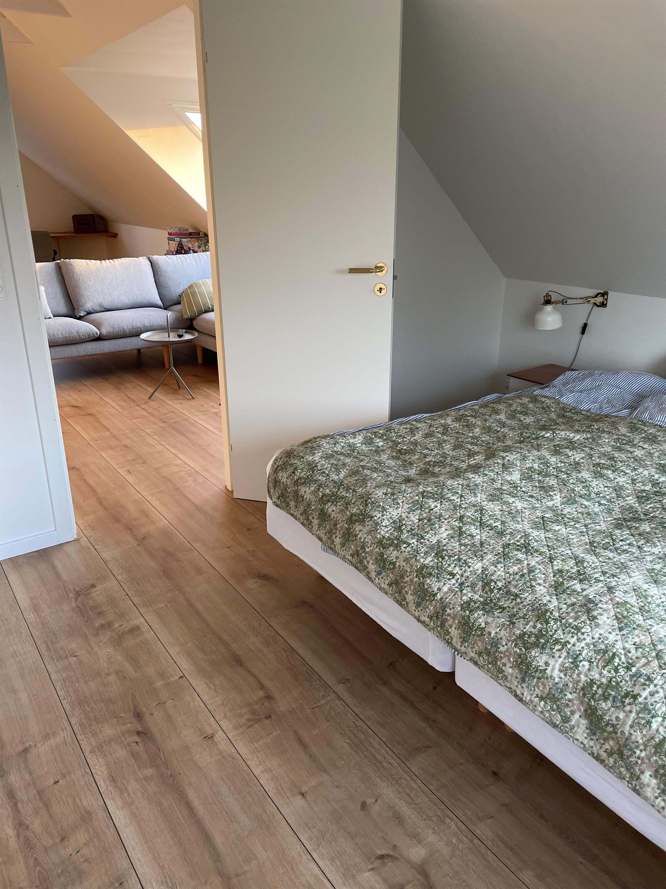 Der er 4 værelser, 2 med dobbeltseng og 2 med 1½ mands senge. I spisestuen er der en daybe