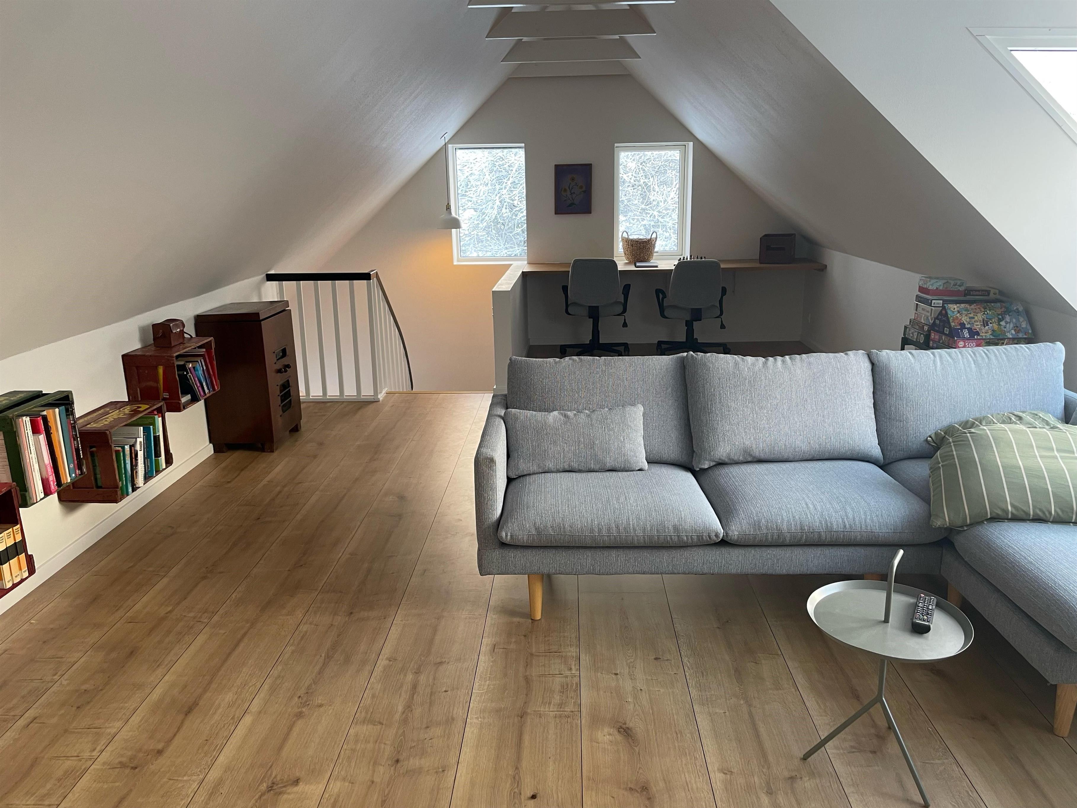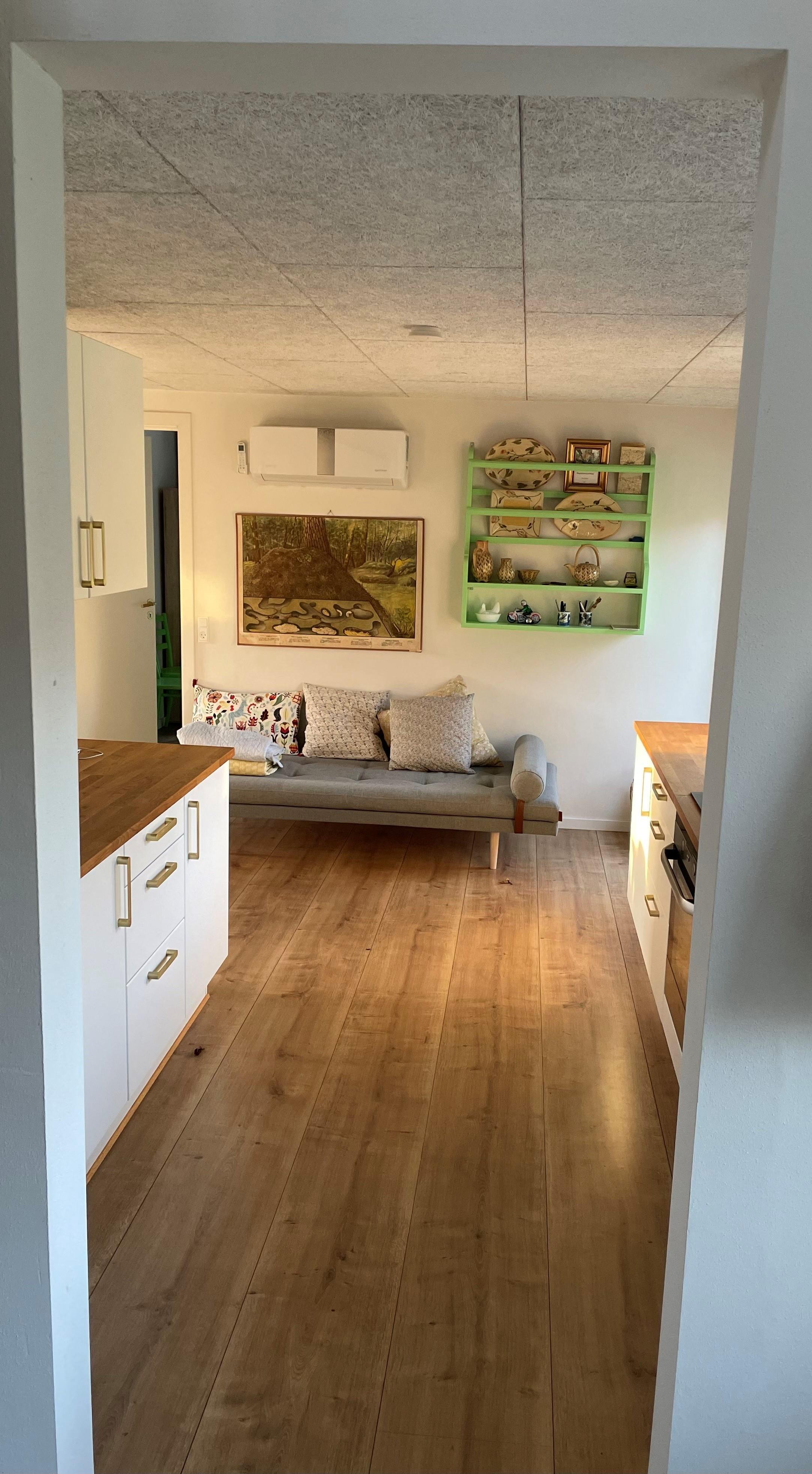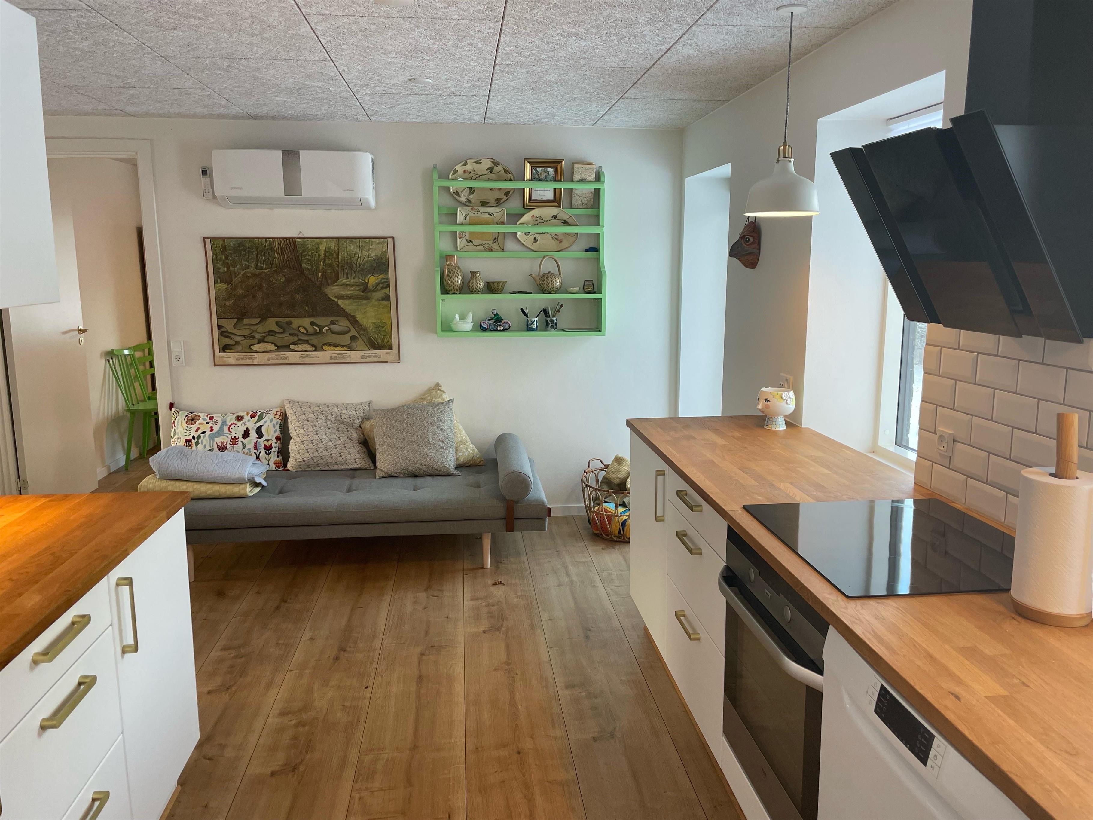 Der er 4 værelser, 2 med dobbeltseng og 2 med 1½ mands senge. I spisestuen er der en daybe