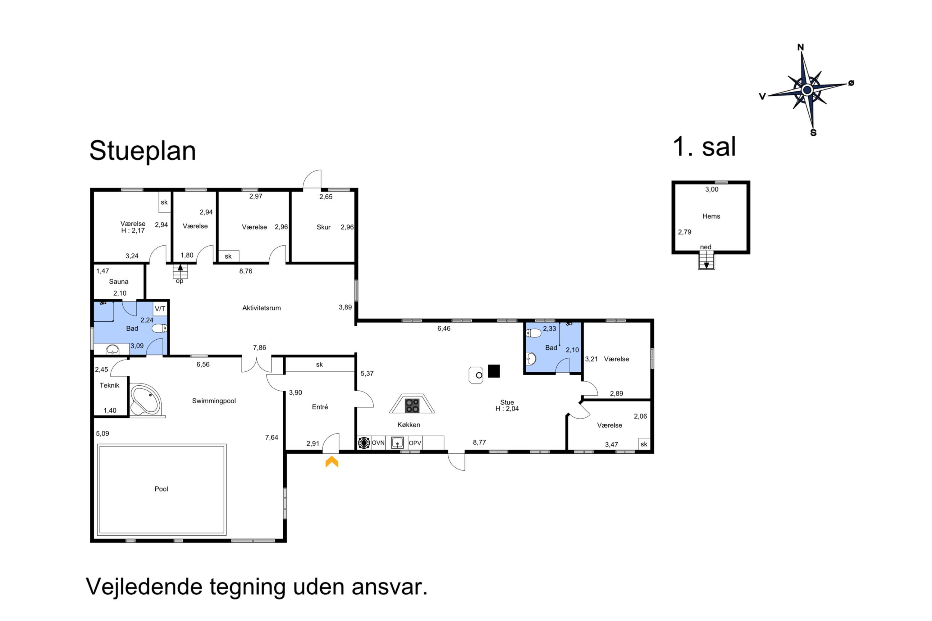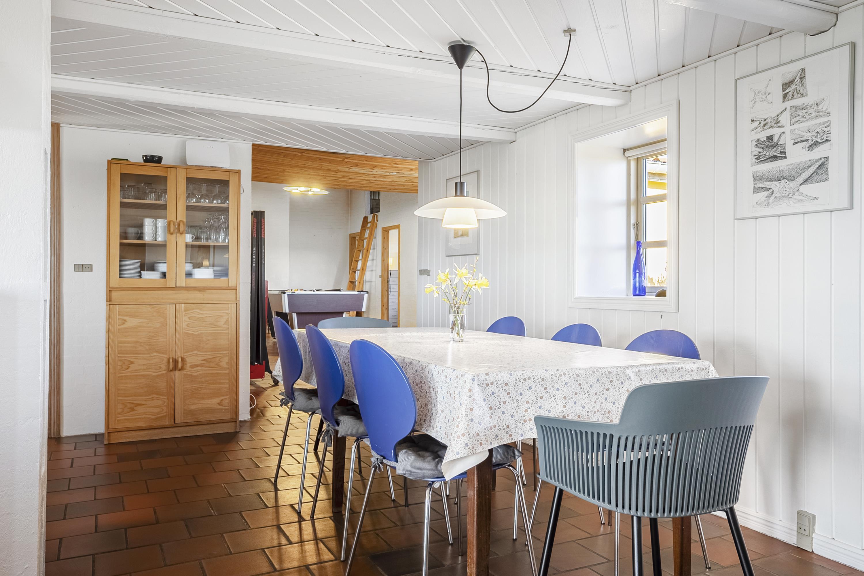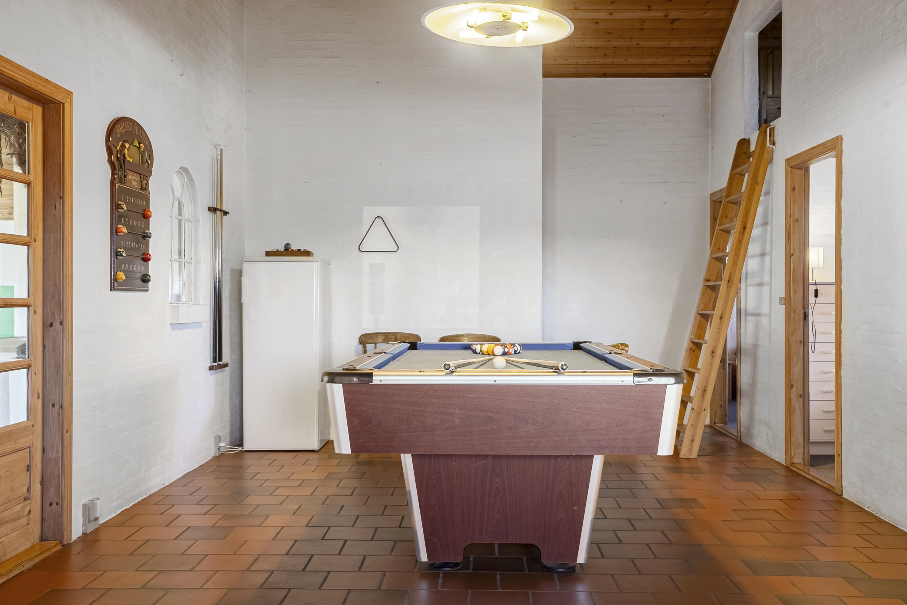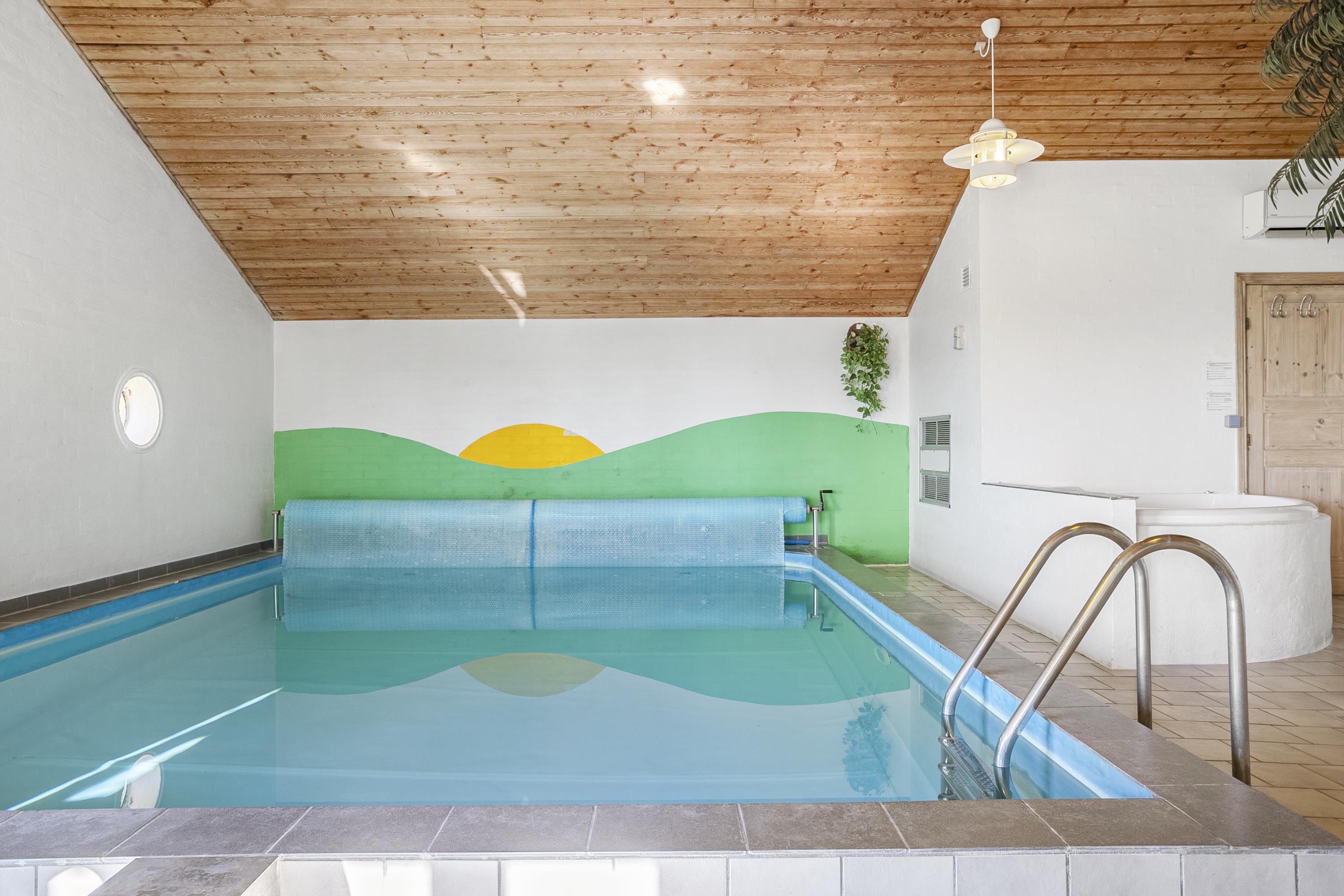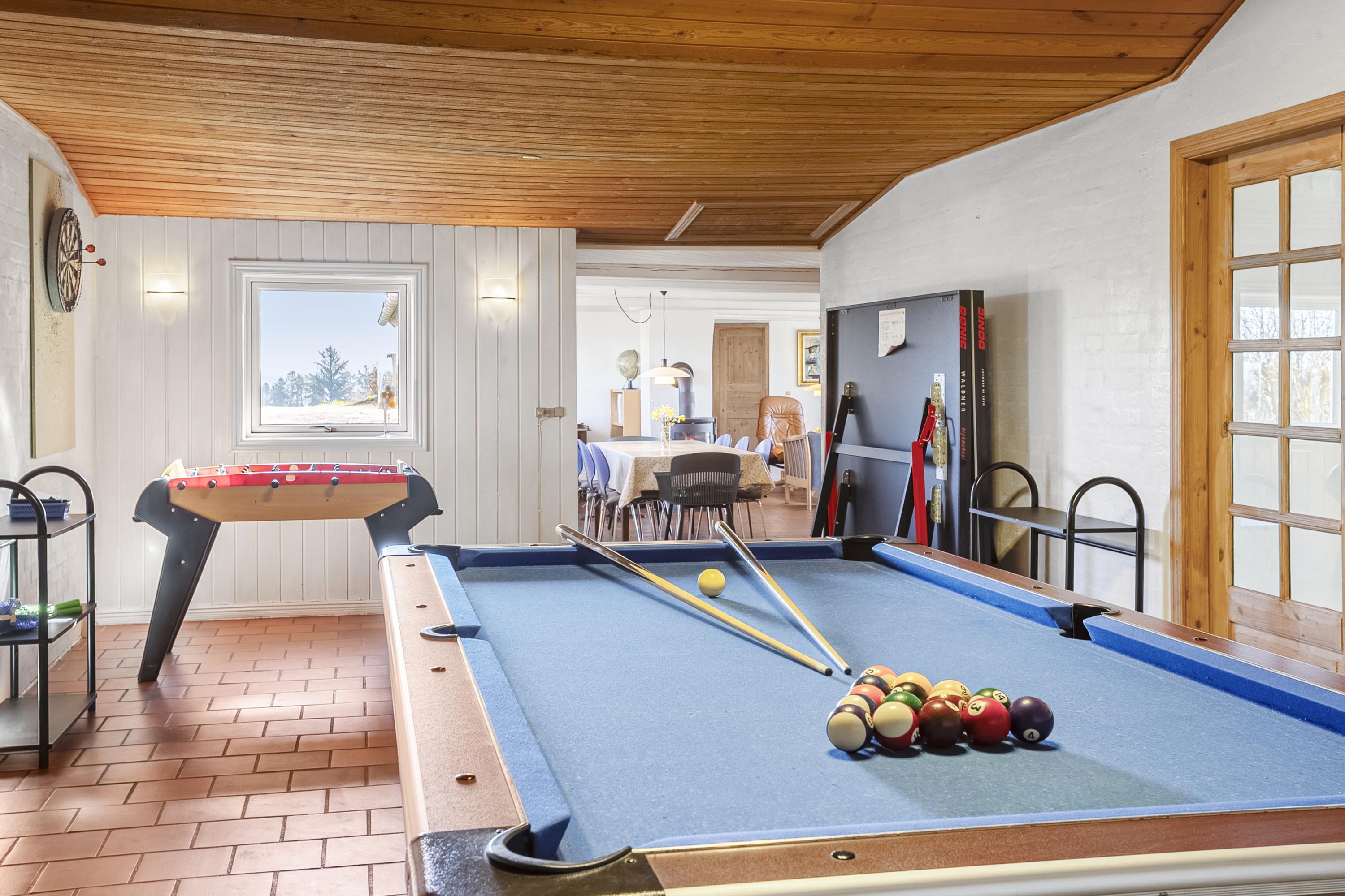 Indendørs finder du en stor opholdsstue med brændeovn og åbent køkken, perfekt til hyggelige aftener. Huset er udstyret med egen indendørs pool, spa og sauna, samt et aktivitetsrum med billard, bordtennis og dart – ideelt til både afslapning og underholdning uanset vejret. Der er også gratis WiFi, fladskærms-tv og energivenlige løsninger som solceller og varmepumpe, hvilket gør huset både moderne og bæredygtigt.